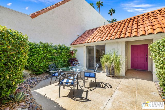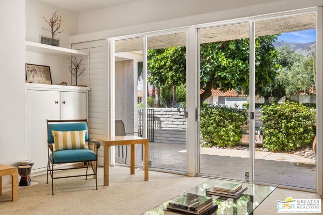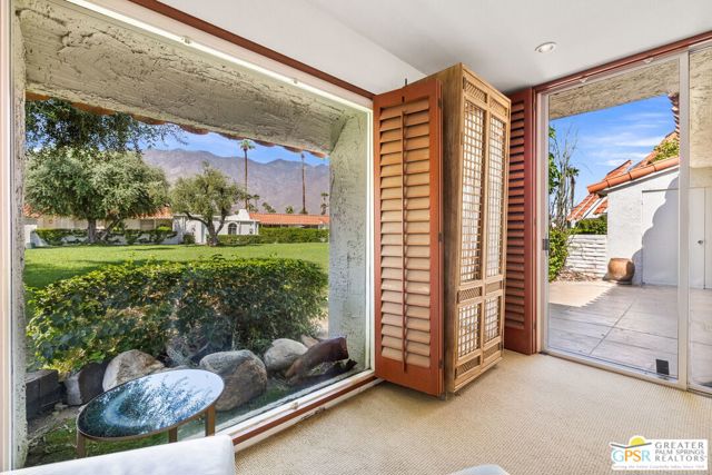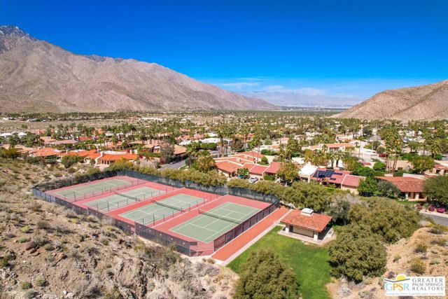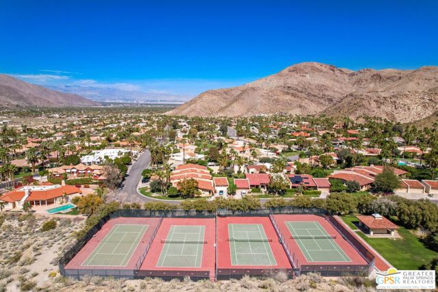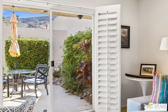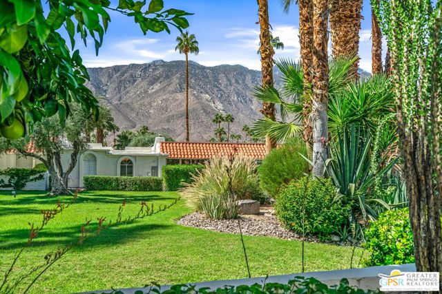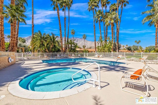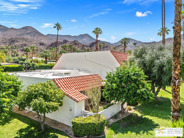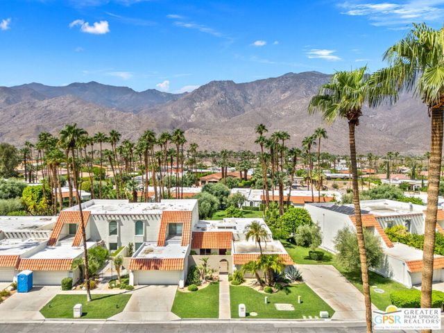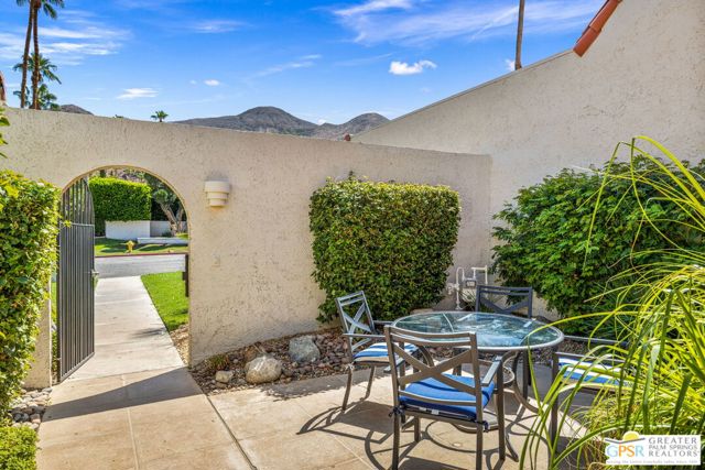 Surrounded by 360 of majestic mountain views, endless desert sky, and sunshine, this is one of the only 2 bed, 2 bath single-level condo that blends natural beauty with modern comfort. Just a short stroll to some of the best hiking trails in the Coachella Valley and minutes from downtown Palm Springs, you'll feel tucked away in your own desert retreat while staying close to all the action. Step inside and discover a bright open living space. The chef's kitchen, complete with sleek modern appliances, flows into an inviting dining area that's perfect for entertaining. The oversized primary suite showcases stunning mountain views, a large walk-in closet and a spa-like bathroom. A spacious guest room (currently styled as an office/den) adds flexibility for work or visitors as well as stunning mountain views towards the East. Enjoy quiet mornings in your private front courtyard, unwind in the lush back patio overlooking greenbelt lawns and soaring peaks, or start your day with a swim in the pool which is just steps from your patio. With an attached 2-car garage featuring plenty of storage and epoxy flooring, full laundry room and resort-style amenities including pool, spa, and tennis courts, this home is as practical as it is serene. This home is the only single story condo now available with beautiful views in Andreas Hills, call today for a private showing!