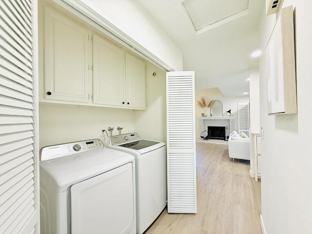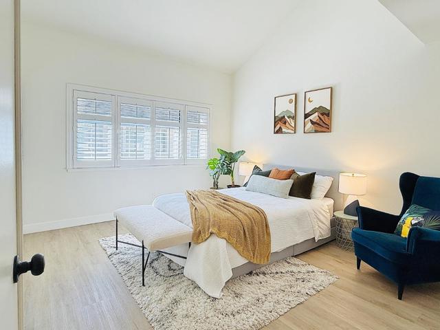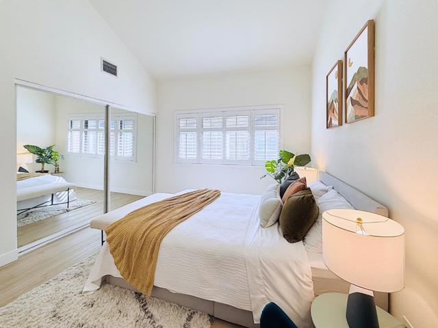 Gorgeous End unit with private entrance in the prestigious Miramar Terrace gated community! Fully remodeled in 2021, this bright and spacious home features an open living/dining area with high ceilings and tons of natural light, leading to a large private balcony. The remodeled kitchen boasts quartz countertops, beautiful backsplash, white shaker cabinets, and SS appliances. Bathrooms are upgraded with sleek fixtures, quartz counters, and designer tile. The Expansive master suite offers vaulted ceiling, dual closets, and dual-sink vanity. Second bedroom includes walk-in closet. Additional highlights include recessed lighting, plantation shutters, central A/C, in-unit laundry, and extra storage unit. Two parking spaces plus ample guest parking. HOA covers water, gated entry, security patrols, garbage, gas, and amenities including pool, spa, clubhouse, sauna, and gym. Ideally located in the heart of Santa Clara near Santana Row, Valley Fair, Nob Hill, Ponderosa/Eklund parks, restaurants, and major tech companies.