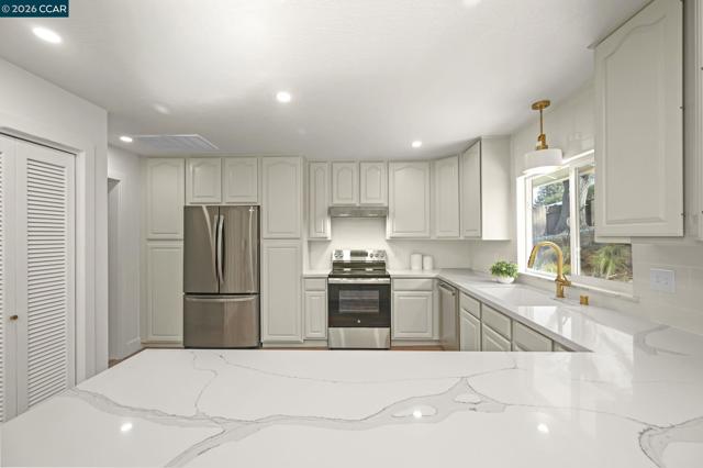 This updated single-story home is in the highly sought-after St. Francis Park neighborhood! The property offers a spacious living room with refinished fireplace, walnut mantle and newly painted double door. All new interior doors. New hardwood floors in the foyer and new painted front door. Renovated kitchen with quartz counters and new GE appliances. Updated bathrooms. New lighting fixtures throughout. Every major system updated in 2021: new 50-year roof, complete HVAC with smart thermostat, new water heater, ducting and new subpanel. Fresh interior and exterior painting. Dual pane windows! Refinished two car garage (517 sq. ft.). Updated front and back landscaping! New fencing and updated exterior light fixtures. Backyard oasis features 1,100 sq. ft. Calstone paver patio plus 300 sq. ft. decomposed granite patio shaded by 200+ year-old Heritage Oak. Mature trees, smart irrigation, low-voltage lighting throughout. Minutes to Concord and Pleasant Hill BART, easy access to freeways. De La Salle and Carondelet High Schools, several shopping centers, restaurants, Lime Ridge Hiking Trails access at the end of the street and neighborhood park with tennis courts and Olympic size swimming pool! Beautiful, comfortable, and completely worry-free. Simply move in and enjoy.