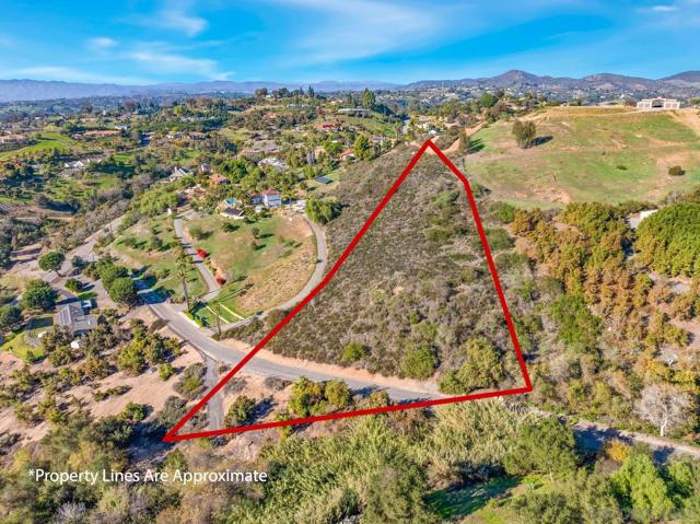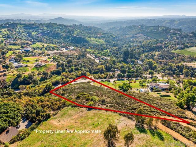 Exceptional, breathtaking views await from this elevated hilltop homesite in one of Fallbrook’s most desirable locations. The property includes a proposed layout illustrating the ideal placement for a custom dream home. Utilities are conveniently located nearby, making future development more accessible. This rare opportunity offers the perfect balance of privacy and tranquility while remaining close to Highway 15 and Pala Mesa Golf Resort, providing easy access to Temecula and surrounding San Diego communities. The property’s corner begins at the palm trees, see the asphalt curb and paved street for reference highlighting both accessibility and potential.