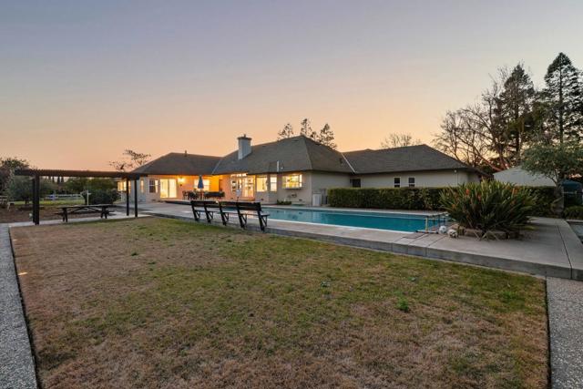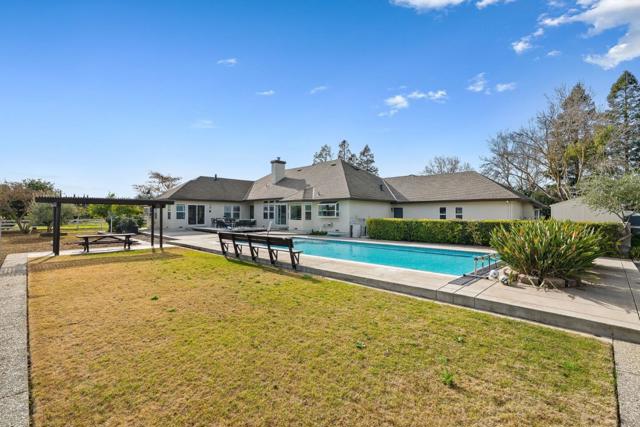 Gorgeous single-story Modern Ranch-House showcasing true pride of ownership. The well-designed open floor plan provides generous living space and features a cathedral ceiling in the living room, bringing an abundance of natural light. The property includes a spacious paver driveway plus additional concrete parking, ideal for oversized vehicles. Inside, enjoy newer flooring and fresh interior and exterior paint. kitchen has been updated with newly painted cabinets and newer stainless-steel appliances. The primary suite offers a cozy gas fireplace and a small lounge area, perfect for relaxing. The 3 car garage features epoxy-coated concrete flooring and workshop. Large Inside Laundry Room, Fire sprinklers, Storage Shed, Green House, Sprinkler System, Turbine Windmill, Solar panels- SunRun Company. Beautiful Outdoors, the pool has been recently re-plastered and includes a newer motor system, Orchard field, Horseshoe Pit, BBQ Area, Patio Deck, Water Tank for Fire Use. Ideal private location near walking trails, Highway 101, and close proximity to downtown Morgan Hill, known for its great restaurants, shopping, and family-friendly seasonal events.