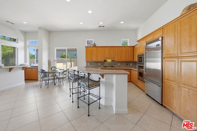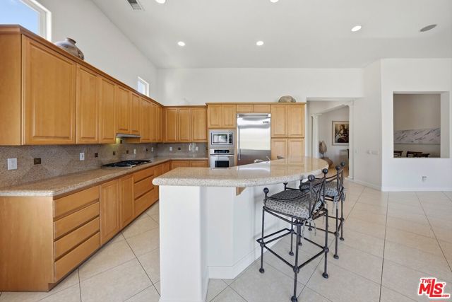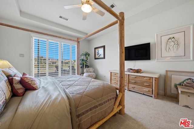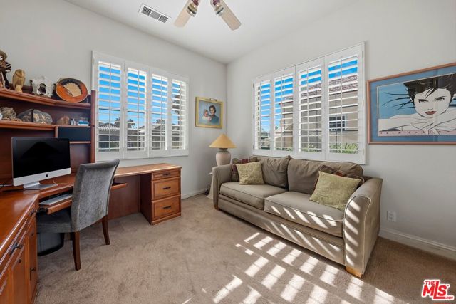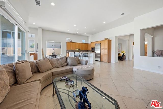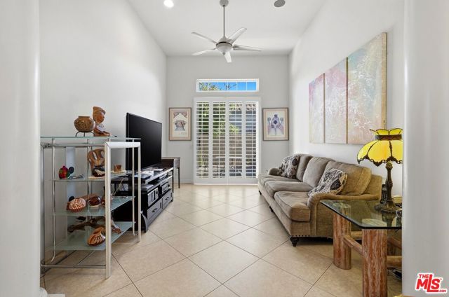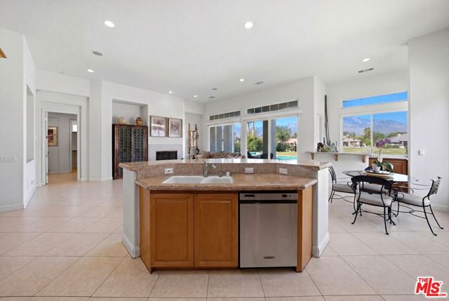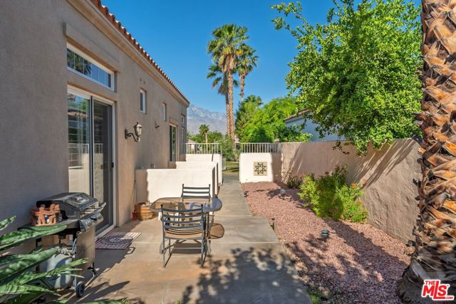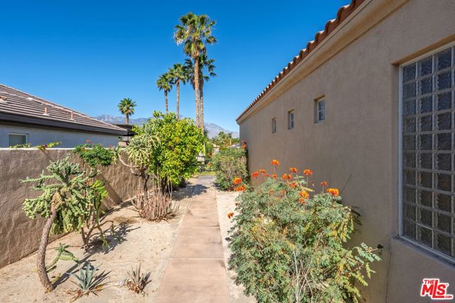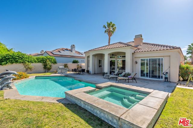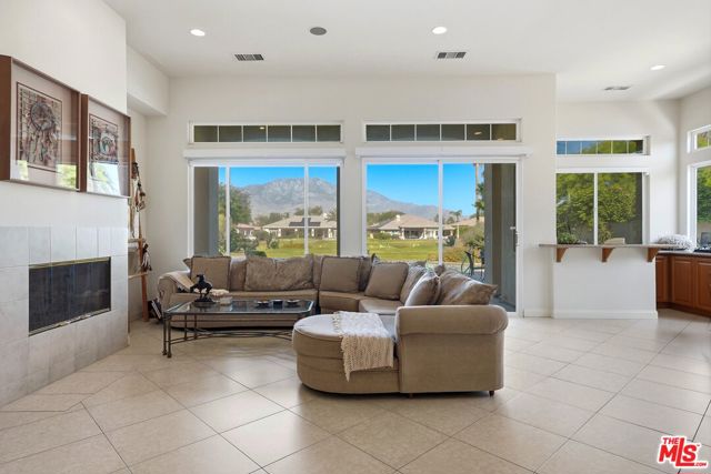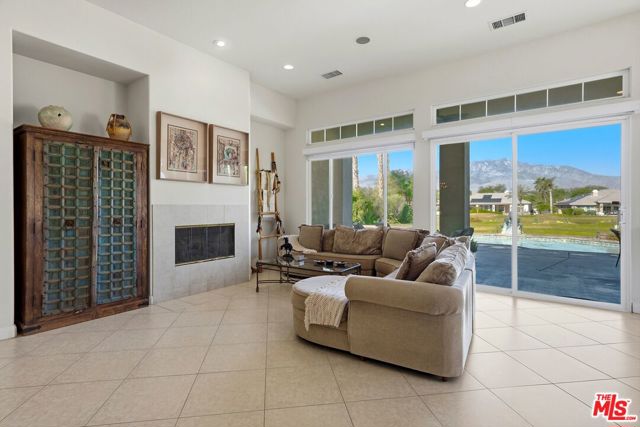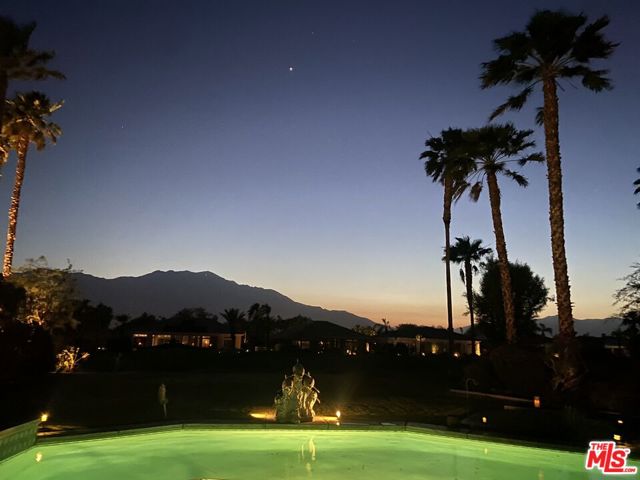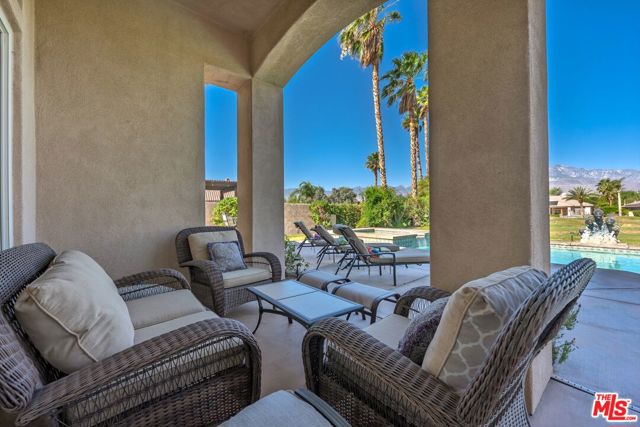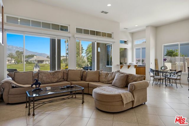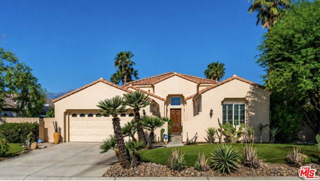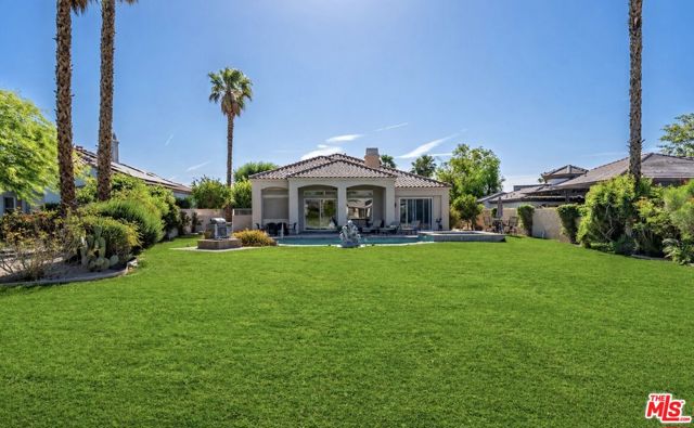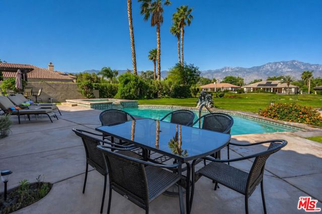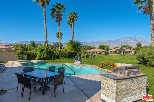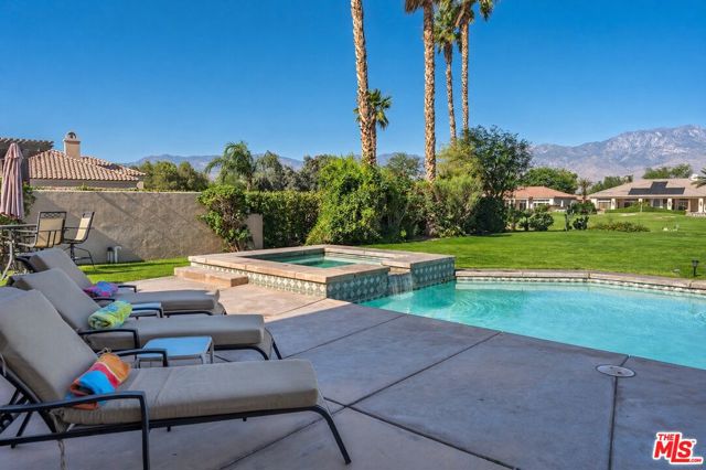 Set on one of the largest VIEW lots within the prestigious guard-gated community of Mira Vista, this exceptional residence offers remarkable space, privacy, and tremendous space potential for expansion, including the possibility of adding ADUs. Perfectly positioned along the 9th tee of the Mission Hills North Golf Course, the home captures breathtaking, unobstructed panoramic views of the San Jacinto Mountains that create a truly dramatic backdrop. Featuring 3 spacious bedroom suites, 3.5 bathrooms, and a versatile den (easily convertible to a fourth bedroom), this highly sought-after open floor plan is designed for both comfort and effortless entertaining. The upgraded kitchen is appointed with a Viking Refrigerator, while the home is enhanced with motorized blinds and modern plantation shutters. The resort-style backyard is an entertainer's dream, complete with a sparkling pool and spa, fire pit, and two expansive side yards offering endless possibilities for expansion and ADU/ guest house potential . Mature fruit trees including lemon, grapefruit, and orange add charm and character to the outdoor space. A two-car garage features epoxy flooring, an additional oversized golf cart bay , and built in cabinets that offer ample storage. This is a rare opportunity to own a Mission Hills North Golf Course estate home, and experience true resort-style living in the heart of Rancho Mirage.
