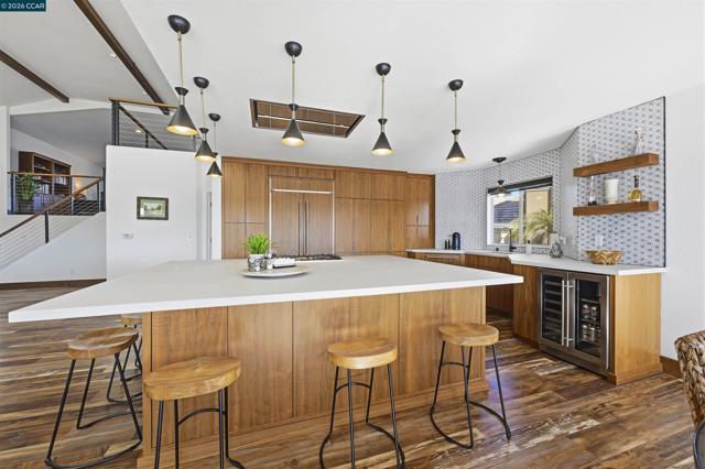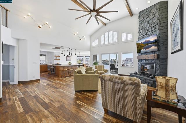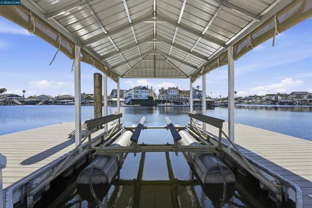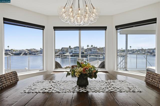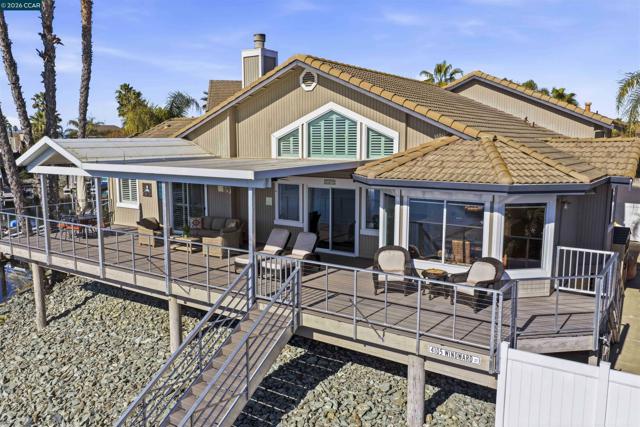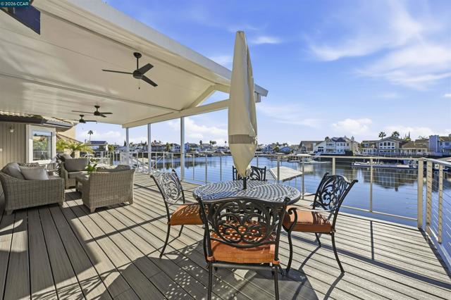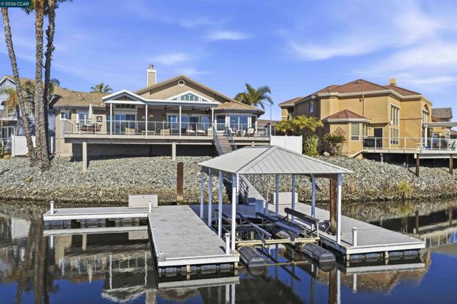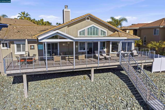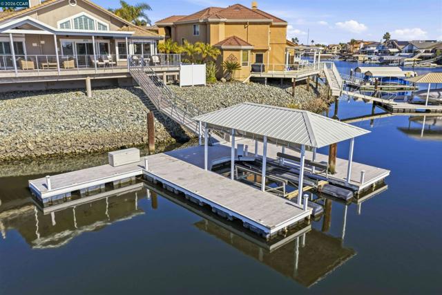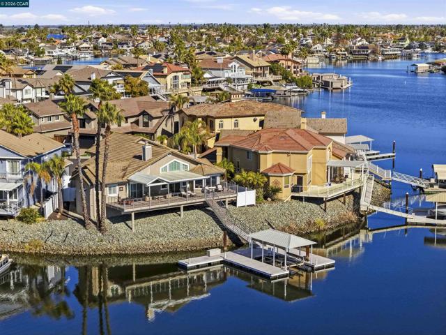 Truly spectacular unique waterfront home with breathtaking panoramic views on a point lot with approx. 116 feet of water frontage. Amazing court location with sought after southern exposure. Oversized U-shaped dock with room for multiple boats, possibly a pool, or whatever your heart desires. Waterfront luxury at its finest. Spacious open floor plan with soaring ceilings and lots of natural light, features massive great room, 3 bedrooms plus huge loft with bar. Remodeled chef’s kitchen is truly exquisite, with custom cabinets, a massive island, slab counters, high-end stainless steel appliances and spacious breakfast nook featuring stunning water views. Lovely primary bedroom features vaulted ceilings and gorgeous water views. Luxurious spa-like primary bathroom features a standalone tub and a walk-in shower. Gorgeous flooring throughout. New Trex decking. Oversized 3 car garage features built-in cabinets. Side yard access. Perfect for indoor/outdoor living and entertaining. Access to over a thousand miles of delta waterways from your backyard! No HOA