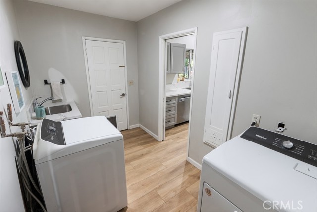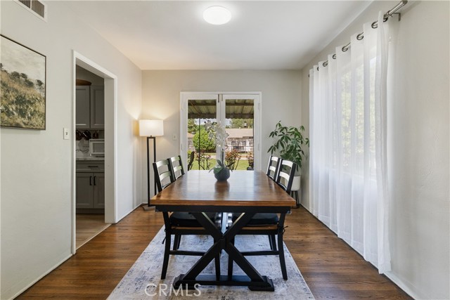 WOOD STREETS - Located on a tree-lined street in one of Riverside’s most loved neighborhoods, this inviting mid-century, single-story home offers 1,258 sqft with 2 bedrooms and 2 bathrooms on a 9,148 sqft lot. Loads of natural light and spacious living spaces make this home especially warm and welcoming. Beautifully refinished original hardwood floors line the large family room with a wood burning fireplace and extend into the dining room, which offers a double-glass door exit to the backyard. Adjacent to the dining room is a tastefully updated kitchen featuring numerous cabinets with pull-outs and soft-close hardware, beautiful quartz counters, and stainless appliances. Both bedrooms are well-proportioned with generous closet space. The home offers a full bathroom with tub/shower combo as well as an additional half bathroom. The interior is completed by a sizeable utility room which houses washing machine hooks ups, a gas dryer supply, a large utility sink, storage closet and a secondary access to the backyard. An expansive covered patio at the rear of the home offers a welcoming lounging and entertaining setting. The oversized and fully-fenced backyard offers a great space for kids or pets to play, or a potential space for an ADU. Other amenities are numerous and include: newer cost-effective heating and cooling mini-split units, newer plumbing, updated light fixtures and recessed lighting throughout, luxury vinyl plank throughout the kitchen and bathrooms, mature fruit producing citrus trees, irrigated yards, an attached pull-through garage, ample driveway parking and more! A perfect retreat nestled in a quiet, coveted neighborhood that's conveniently close to everything including shopping, schools, churches, parks, eateries and more! Truly special and a must see! Low taxes! Not in high fire!