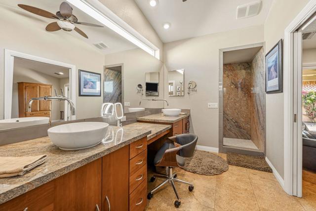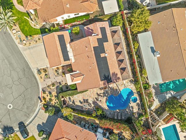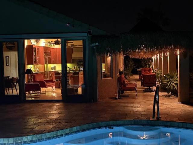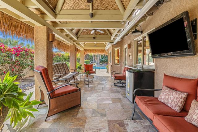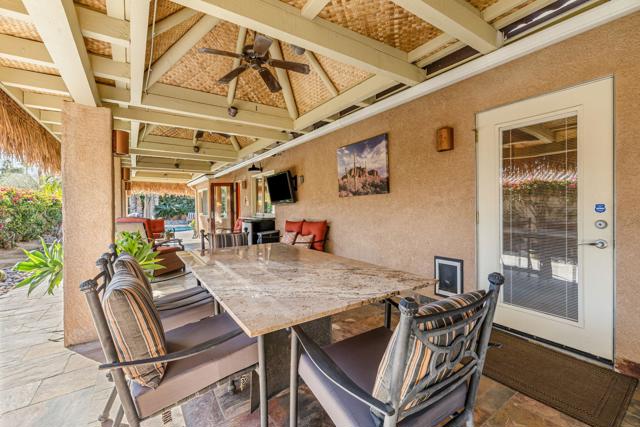 Welcome to your dream desert sanctuary in highly sought-after South Palm Desert, nestled on a quiet cul-de-sac just moments from the vibrant shops, art galleries, and restaurants of El Paseo. This home captures the essence of luxury desert living--where every day feels like a vacation.Step into an entertainer's paradise with an expansive outdoor living space designed for both lively gatherings and tranquil moments. Lounge by the sparkling pool with its elegant Hydrazzo marble finish, unwind under the full-roof palapa-covered patio, and savor evenings by the warm glow of sthe outdoor stunning rock fireplace. The built-in BBQ and bar area set the stage for memorable nights under the desert stars, all framed by breathtaking mountain views.Inside, the open layout flows effortlessly from the living and dining rooms to the outdoors through beautiful wood sliding doors, blending comfort and sophistication. The Gourmet Chef's kitchen is a showpiece in itself, boasting a Wolf range, Miele convection oven, Sub-Zero refrigerator, dual dishwashers, wine/beverage fridge, prep sink island, and generous counter space--perfect for hosting family and friends or enjoying quiet mornings with coffee and sunshine.Every detail reflects thoughtful design and quality craftsmanship, warm wood-wrapped windows and doors, rich cork floors, granite counters, designer lighting, and ceiling fans that complement the airy, natural feel. Custom cabinetry throughout provides an abundance of storage while maintaining a sleek aesthetic.The primary suite is your private retreat, featuring direct access to the pool and patio, a spacious walk-in closet, and a spa-inspired bathroom that invites you to relax and recharge. Each guest suite offers its own private ensuite bath; one even includes direct outdoor access and a soaking spa tub for ultimate comfort.Additional highlights include a large three-car garage with built-in storage and easy attic access, plus a leased solar system providing energy efficiency and long-term savings. Added savings of NO Homeowners Assoc. Dues.This isn't just a home--it's a resort-style experience, where warmth, beauty, and sophistication come together to create the ultimate desert lifestyle. Welcome home to the heart of Palm Desert luxury. Buyer is advised to independently verify all information and conduct their own inspections and investigation.