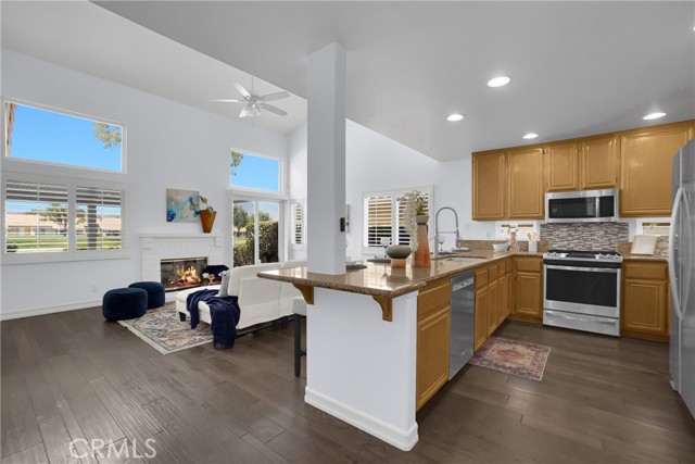 GORGEOUS GOLF COURSE DREAM HOME with PAID OFF SOLAR, in Sun Lakes Country Club, an Active Adult 55+ Private Golf Community with NO MELLO ROOS. TWO 18-HOLE GOLF COURSES with 2 Pro Shops. 7,017 yard Championship 72 par course and also have separate short executive course. 2,349 Elevation location. Features & Upgrades (Almost $100,000+); STUNNING WOOD FLOORING (Panter's); Plantation Shutters; Top of the Line NEWER A/C & Furnace (Lenox) & Air Purification System; Paid OFF SOLAR gives Significant ELECTRICITY SAVINGS; Granite counters in Kitchen/Family Room, with Newer SS/Appliances, Entertainer's Kitchen is like a Great Room with Cozy Fireplace which looks out to Championship Golf Course; Formal Dinning & Living Rooms with Cathedral Ceilings with ceiling fans including every rooms, Paid off Whole House Water Filtration System + Reverse Osmosis Water System; LOFT Area can be 3rd Bedroom with a Waling- Closet and full Bath Bathroom; Fantastic Storage in home; oversized ALUMAWOOD SOLID Patio Cover to Sit and enjoy Magnificent Mountain and Golf Course VIEWS in All Weather; Sun Lakes Country Club is a Outstanding Community offering; THREE Clubhouses, TWO Restaurants, Bar & Lounge, Tennis, Swimming Pools (Including Large Indoor Pool), Jacuzzi Spa, THREE Fitness Centers, Fabulous Planned Activities Offered on a Daily Basis. There are 80 + Social Clubs - International Dancing, RV Club, Yoga, Table Tennis, Cards, Bocce Ball, Bowing, Car Club, Drama/Theatre Club, Sewing, Tennis, Knitting, Pickle Ball, Bing, Travel, Quilter, Art League, International Culture, Genealogical Society, Garden, Photography, Travel, and a lot MORE....If that's not Enough, Add TRIPS TRVEL EXCURSIONS scheduled all year long. LOW HOA DUES INCLUDE CABLE TV & INTERNET- Located Close to Casino(9 miles), World Famous Shopping Cabazon(8 miles), Palm Springs(30 miles), Restaurants, B of A, Wells Fargo, Chase, Supermarkets, Home Depot, and Excellent Medical Facilities - SUN LAKES COUNTRY CLUB offer the Amazing Life you've been waiting for!