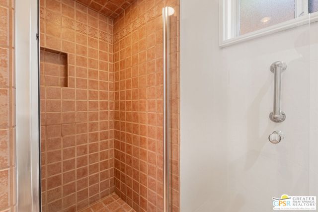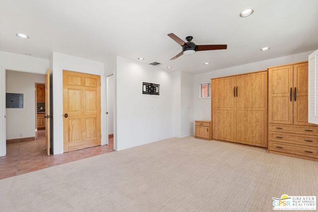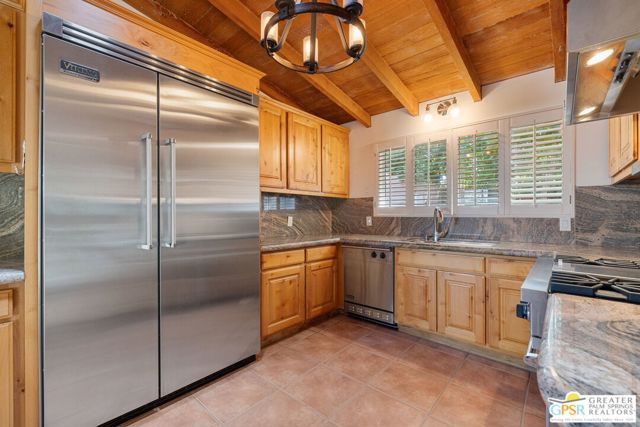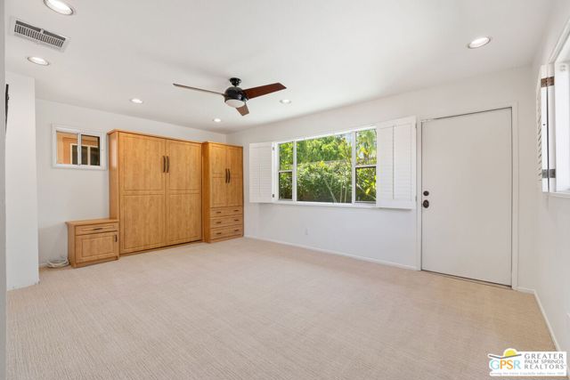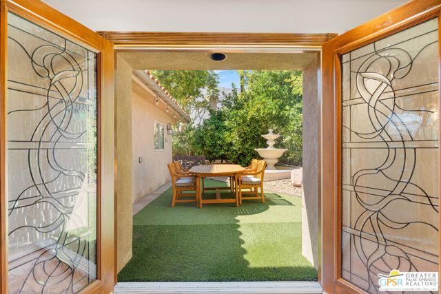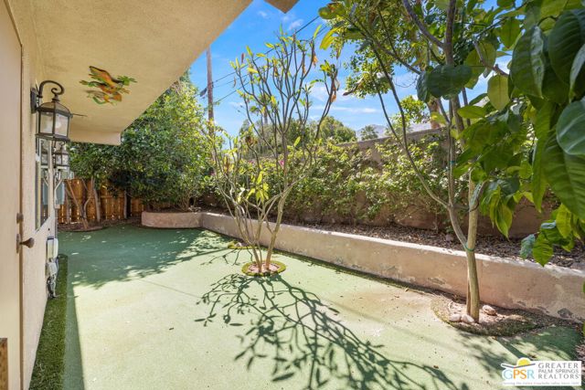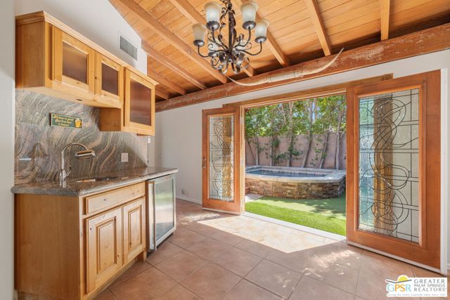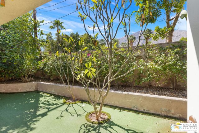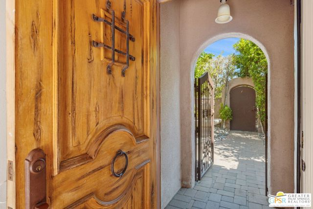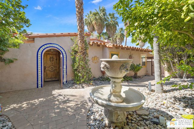 Truly UNIQUE, this tucked-away Spanish-style retreat captures the MAGIC of Palm Springs living! Located in the Warm Sands neighborhood, just minutes from downtown, this home is gated and private with fantastic curb appeal, surrounded by fountains and lush landscaping. OWNED SOLAR is another plus! Tall, vaulted, wood-beamed ceilings are a theme and the main living area opens through dual sets of French doors to patios and an oversized spa/pool (spool), perfect for relaxing year-round. The living room features an adobe style fireplace and a wet bar with beverage fridge. The beautiful kitchen is equipped with Viking appliances and solid wood cabinetry, while Venetian plaster walls and bullnose corners add timeless character throughout. The primary suite includes solar tube lighting and a glass-block accented walk-in shower. A guest suite with ensuite bath opens to a private patio framed by mountain views and mature plumeria trees. A built-in Murphy bed offers extra flexibility for hosting. Outdoors, the large spool accommodates up to ten, ideal for cooling off in summer or warming up in winter. Two exterior sheds provide plenty of storage, while gated parking allows space for two cars. This is truly a rare opportunity in one of Palm Springs' most historic and convenient neighborhoods. Eligible for the city's SHORT-TERM RENTAL permit as well! Take the Matterport Virtual Tour for a better sense of flow.