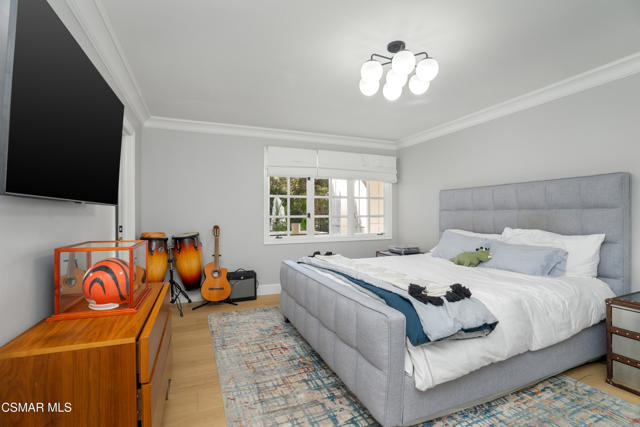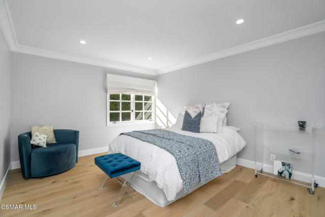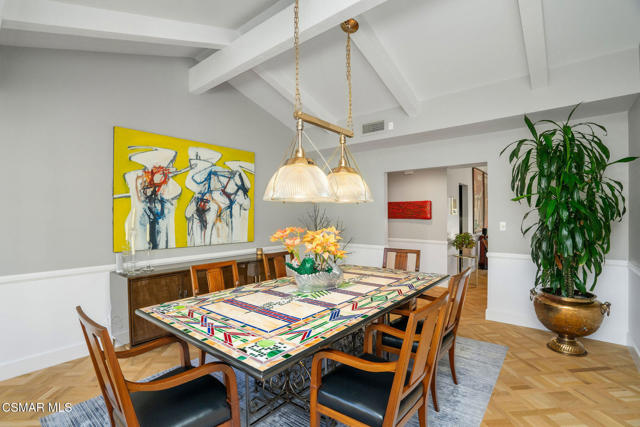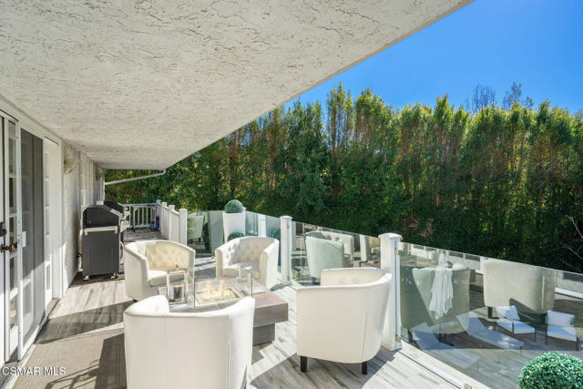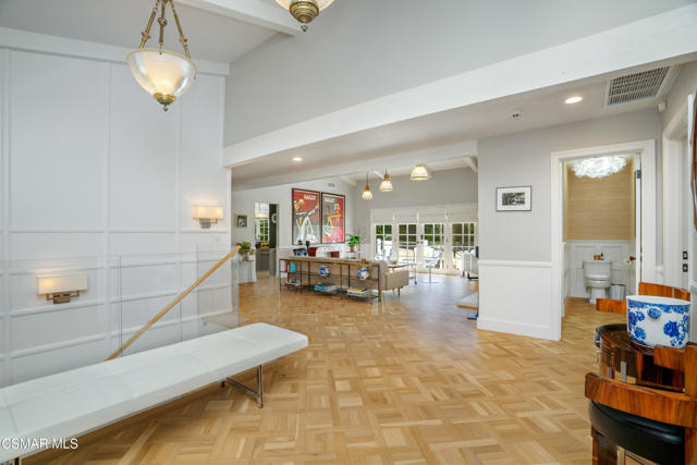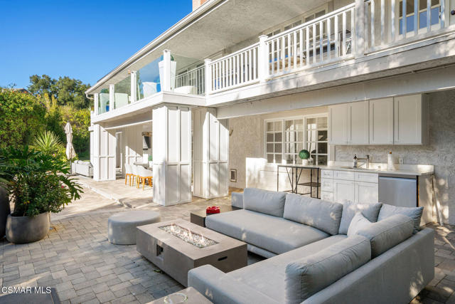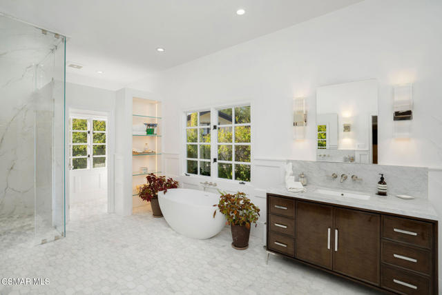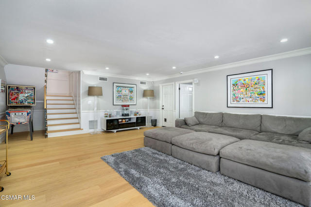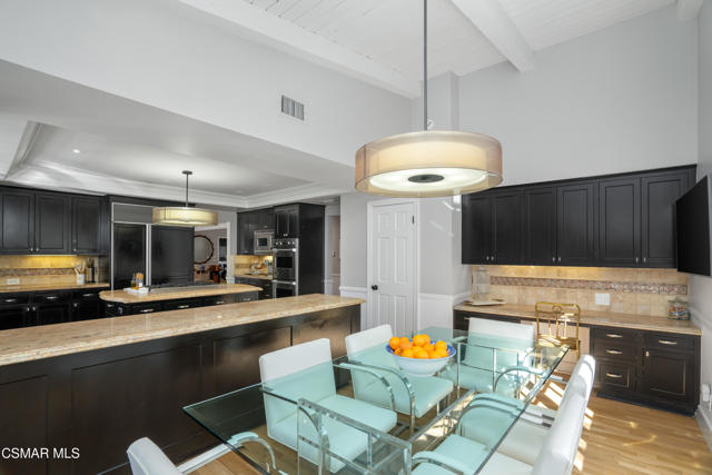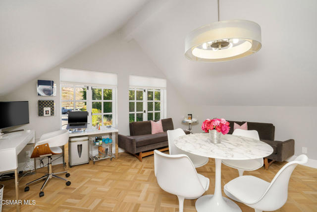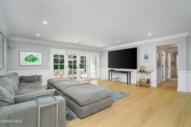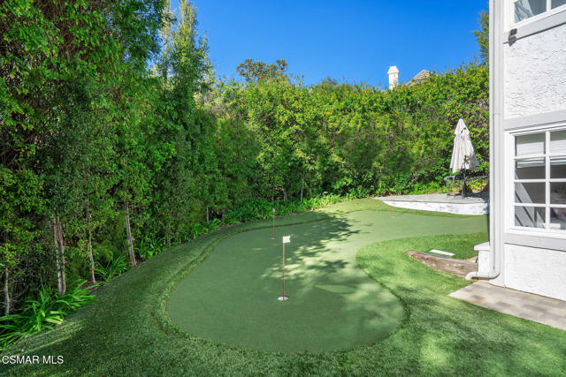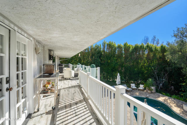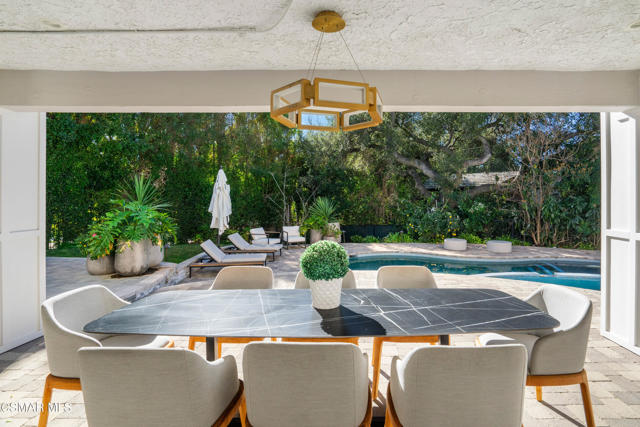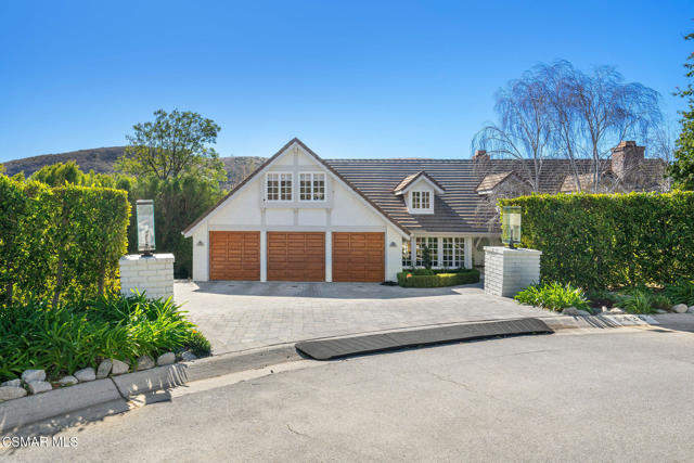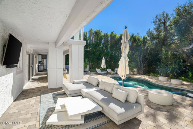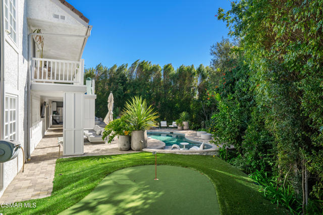 Nestled at the end of a quiet cul-de-sac in the prestigious North Ranch community of Westlake Village, this beautifully updated estate blends timeless architecture with modern California living. Step inside to soaring vaulted ceilings, wood flooring, and light-filled spaces designed for both entertaining and everyday comfort. The main level features an inviting living room with custom millwork, a statement fireplace, and French doors that open to a sweeping balcony overlooking the backyard oasis. The chef's kitchen is the heart of the home, offering rich custom cabinetry, granite countertops, premium appliances, and an oversized center island that flows seamlessly into the dining and gathering spaces. The main floor primary suite is a true private retreat, featuring a spa-inspired bathroom with dual vanities, a freestanding soaking tub, an oversized glass shower, elegant marble finishes, and a huge walk-in closet with abundant storage. Downstairs, 3 additional bedrooms and a flexible living area that opens directly to the backyard, creating effortless indoor-outdoor flow. One room is currently configured as a gym and can easily function as a bedroom or bonus space. A separate upper-level office with its own full bath provides an ideal work-from-home setup or private guest quarters. The backyard is designed for resort-style living, featuring a sparkling pool and spa, multiple lounge areas, mature landscaping, and a putting green. Whether hosting gatherings or enjoying a quiet evening under the stars, this outdoor space delivers. Additional highlights include a three-car garage, Tesla charging stations, abundant storage, and solar panels for added efficiency. A rare opportunity to live in one of Westlake Village's most sought-after neighborhoods, just minutes from golf, hiking trails, shopping, and award-winning schools. The property can be offered furnished, please inquire for additional details.