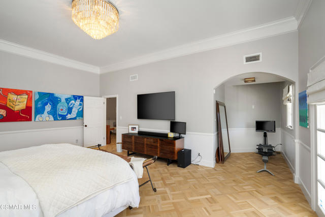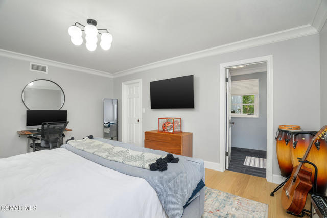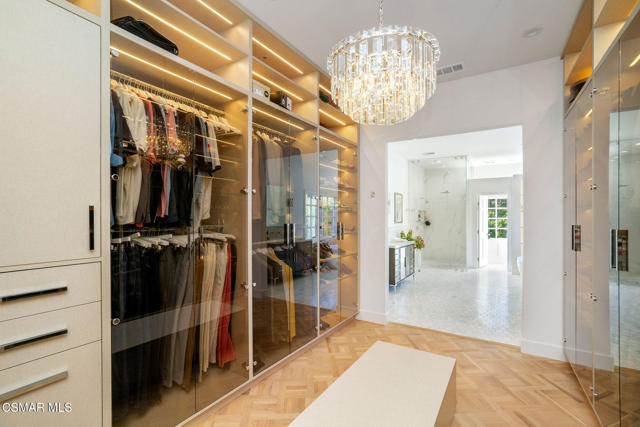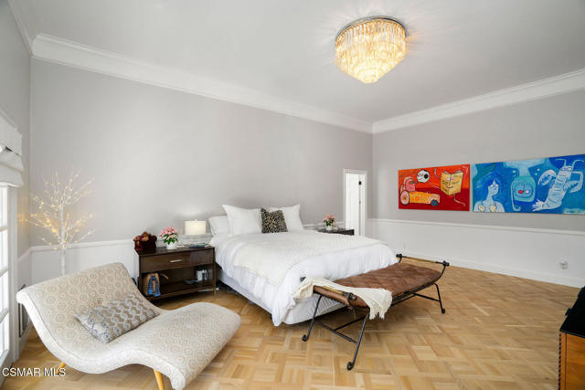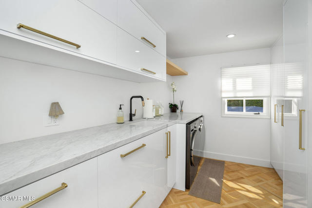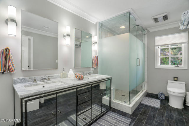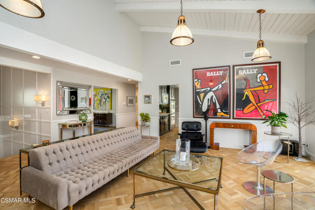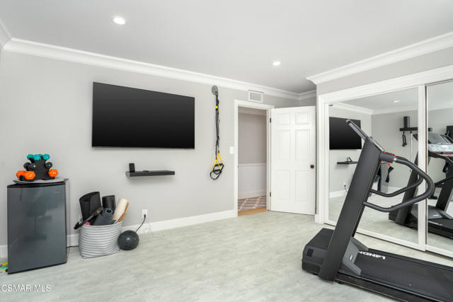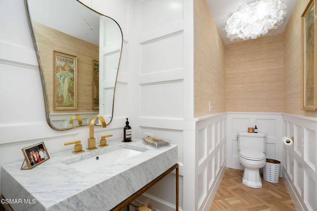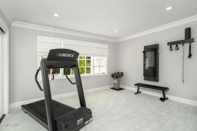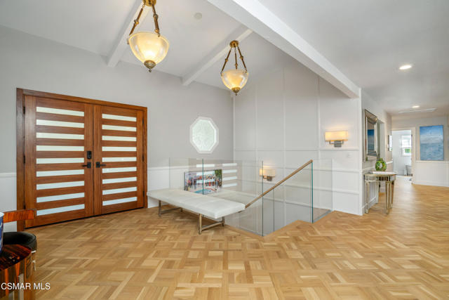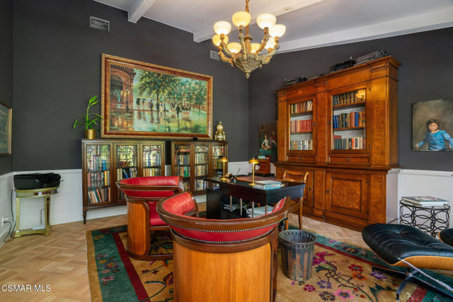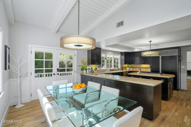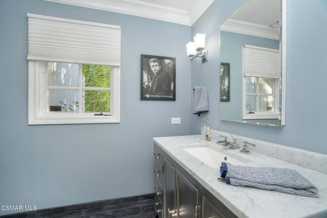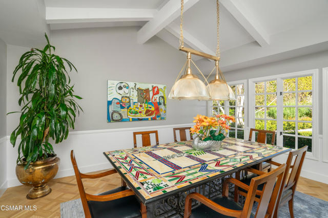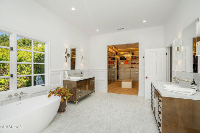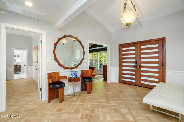 Nestled at the end of a quiet cul-de-sac in the prestigious North Ranch community of Westlake Village, this beautifully updated estate blends timeless architecture with modern California living. Step inside to soaring vaulted ceilings, wood flooring, and light-filled spaces designed for both entertaining and everyday comfort. The main level features an inviting living room with custom millwork, a statement fireplace, and French doors that open to a sweeping balcony overlooking the backyard oasis. The chef's kitchen is the heart of the home, offering rich custom cabinetry, granite countertops, premium appliances, and an oversized center island that flows seamlessly into the dining and gathering spaces. The main floor primary suite is a true private retreat, featuring a spa-inspired bathroom with dual vanities, a freestanding soaking tub, an oversized glass shower, elegant marble finishes, and a huge walk-in closet with abundant storage. Downstairs, 3 additional bedrooms and a flexible living area that opens directly to the backyard, creating effortless indoor-outdoor flow. One room is currently configured as a gym and can easily function as a bedroom or bonus space. A separate upper-level office with its own full bath provides an ideal work-from-home setup or private guest quarters. The backyard is designed for resort-style living, featuring a sparkling pool and spa, multiple lounge areas, mature landscaping, and a putting green. Whether hosting gatherings or enjoying a quiet evening under the stars, this outdoor space delivers. Additional highlights include a three-car garage, Tesla charging stations, abundant storage, and solar panels for added efficiency. A rare opportunity to live in one of Westlake Village's most sought-after neighborhoods, just minutes from golf, hiking trails, shopping, and award-winning schools. The property can be offered furnished, please inquire for additional details.
