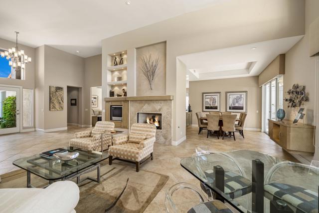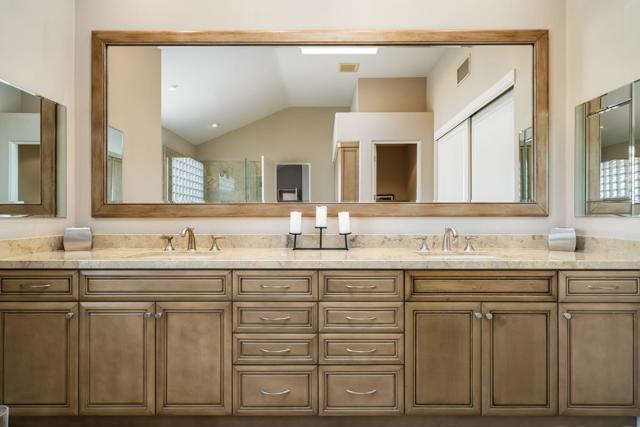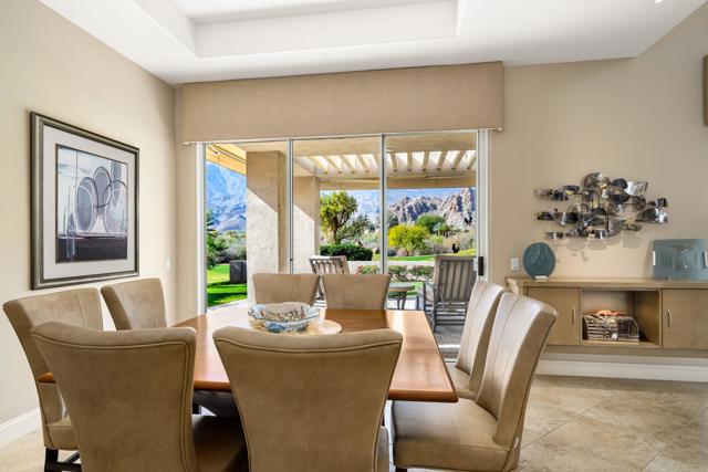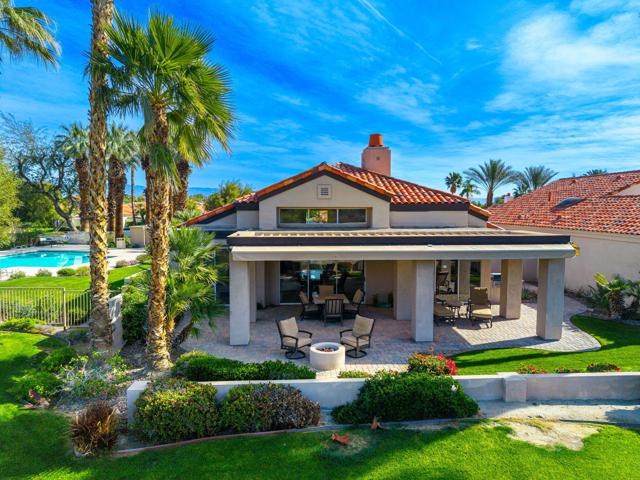 Perfectly positioned on the 16th hole of the renowned Jack Nicklaus Private Course, this beautifully remodeled 4-bedroom, 4.5-bathroom home offers 3,041 square feet of refined living space with breathtaking mountain and fairway views.Owned and lovingly maintained by the same owners since it was built in 1990, this residence showcases true pride of ownership and thoughtful upgrades throughout. The entire home has been remodeled by Bob Edwards, blending timeless elegance with modern comfort.Step through the striking glass front door into a light-filled interior featuring solid core wood doors, upgraded baseboards, custom shutters and blinds, and designer finishes. The spacious kitchen is equipped with stainless steel appliances, a newer refrigerator, and opens seamlessly to the living and entertaining areasThe primary suite is a serene retreat, complete with a skylight in the spa-inspired bathroom, with a separate flowing tub and stand alone shower, new shower doors, updated toilets, and custom solid core closet doors. Comfort is ensured year-round with two AC systems in the main house.Guests will appreciate the generously sized detached casita, featuring a built in desk and cabinetry for an office and a Murphy bed ideal for guests or extended family.Outdoor living is where this home truly shines. Enjoy panoramic golf course and mountain views from the beautifully designed backyard, complete with paver flooring, a trellis-covered patio, and a built-in BBQ--perfect for entertaining under the desert sky.Plus there is a detached golf cart garage as well!This is a rare opportunity to own a meticulously upgraded home in one of the desert's most sought-after private golf communities. Experience luxury, privacy, and spectacular views all in one remarkable property.Community pool & spa steps away. Offered furnished.