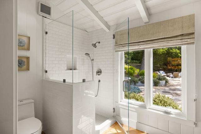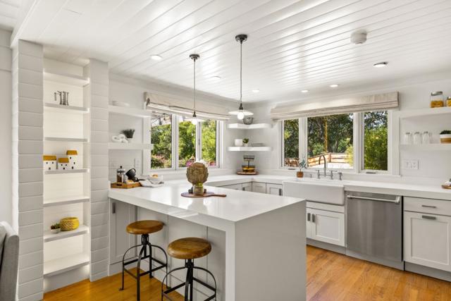 Nestled beneath ancient oaks with sweeping mountain views, this impeccably reimagined California ranch estate offers a rare blend of privacy, beauty, and sophistication. The 2,297 sq ft single-story main residence features soaring vaulted beam ceilings, wide-plank hardwood floors, and walls of glass that open to a stunning pool and gardens. The bright chef's kitchen features quartz countertops, a farmhouse sink, and custom cabinetry. The generous primary suite includes direct garden access, a spa-inspired bath with soaking tub, glass shower, and a custom walk-in dressing room. The main house also features a central air conditioning system! Outside, a string-lit pergola terrace runs the length of the home, terraced steps lead to a sparkling pool framed by lavender and mountain views, and a raised-bed kitchen garden adds charm and function. The detached guest quarters offer flexibility for guests, extended family, or a studio. A stone court with a fountain, mature oaks, and vibrant bougainvillea completes these incredible grounds.