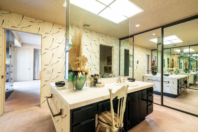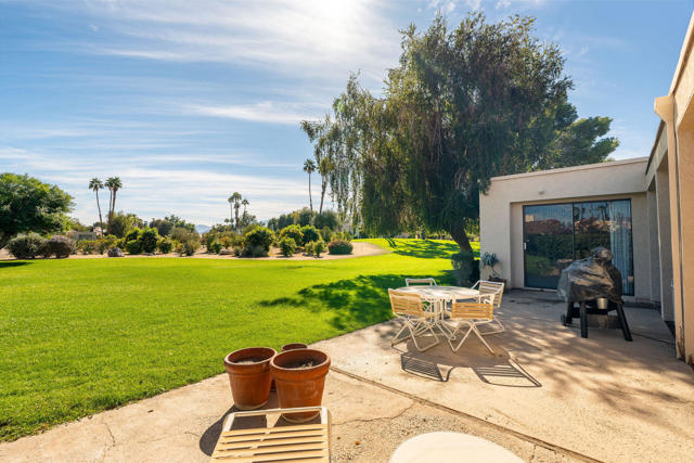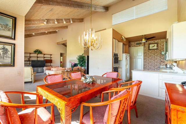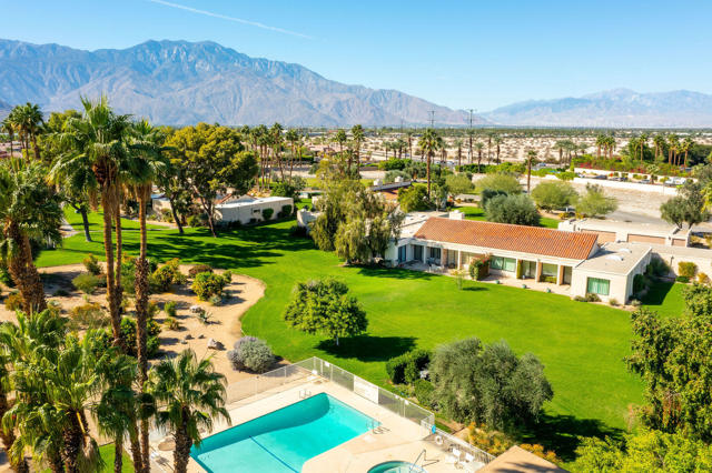 This lovely 3 bedroom, 3 bath residence in Mission Hills Country Club awaits your transformation and personal touches. The home offers a spacious open concept living and dining area with the original wooden cathedral ceiling creating a natural mid-century architectural ambience. With a panoramic southern view of the swimming pool and an open green space area, the home offers bright interiors with natural lighting throughout the day. It also has partial mountain views. The dual zone, natural gas HVAC systems enable you to better control your indoor environment, and the home also has 2 newer hot water heaters. The home also comes with a 2 car, detached garage. Mission Hills Country Club offers a variety of memberships for your enjoyment including social, fitness and golf. Centrally located halfway between Palm Springs and Palm Desert, you have access to the fine dining, shopping and amenities of both communities, including the fabulous El Paseo shopping strip in Palm Desert featuring world recognized brand names. It's also only 5 minutes away from the highly regarded Eisenhower Medical Center offering exceptional medical care. Best of all, the land lease has been extended to 2121.
