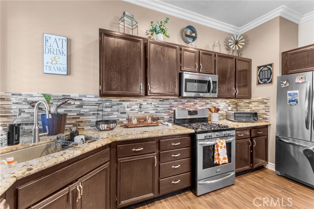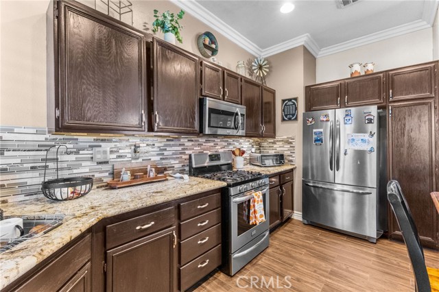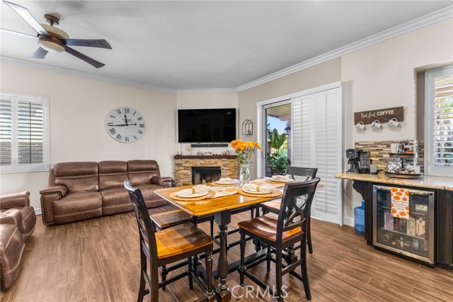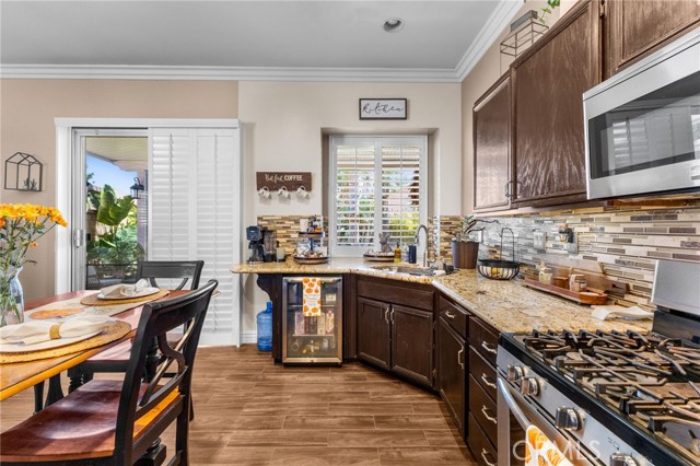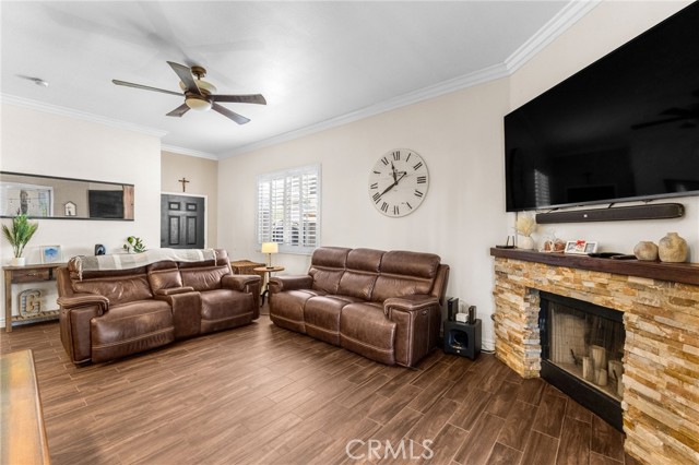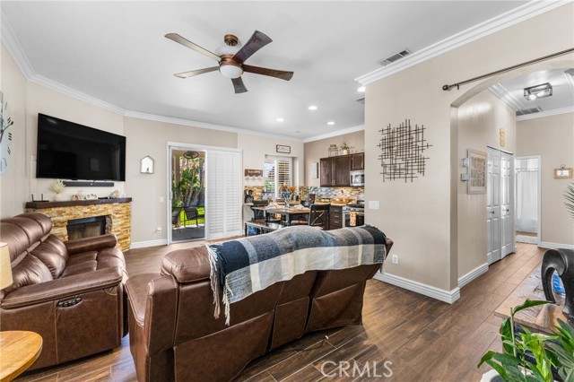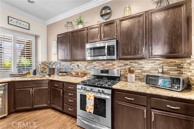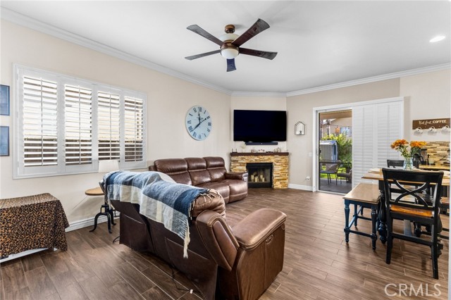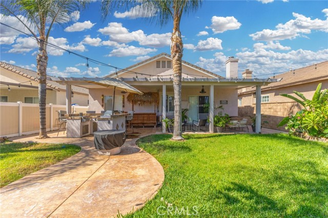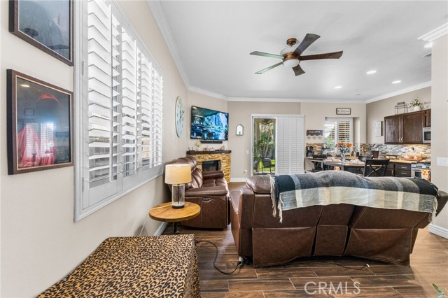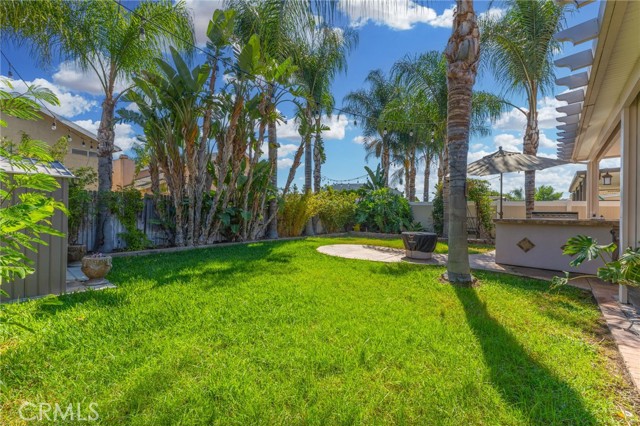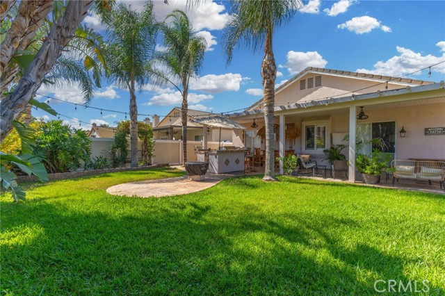 Elegance is defined from the moment you enter, where classic crown molding accents the inviting open-concept living area, drawing your eye toward the cozy gas fireplace and charming white wood window shutters. This sense of refined style flows seamlessly into the kitchen, a space designed to impress with its beautiful cabinetry, premium countertops, and stylish backsplash, all set upon a foundation of rich, chocolate-brown tile flooring. Thoughtful design extends to the conveniently tucked-away laundry area. Step outside to your private retreat, where a lush lawn and a generous patio—complete with a built-in BBQ and a fire pit—set the stage for countless joy-filled memories to come. Perfectly completing this exceptional home are the practical luxuries of a spacious two-car garage and a prime location close to shopping, offering a lifestyle of unparalleled comfort and convenience.