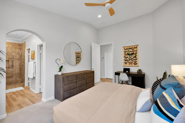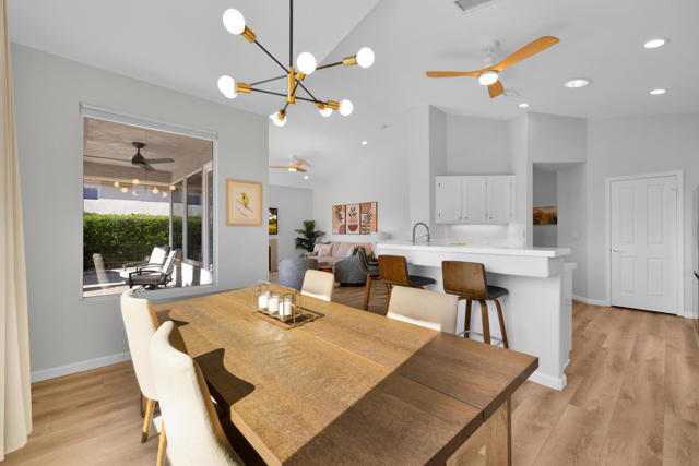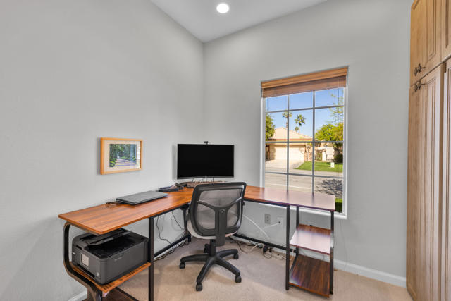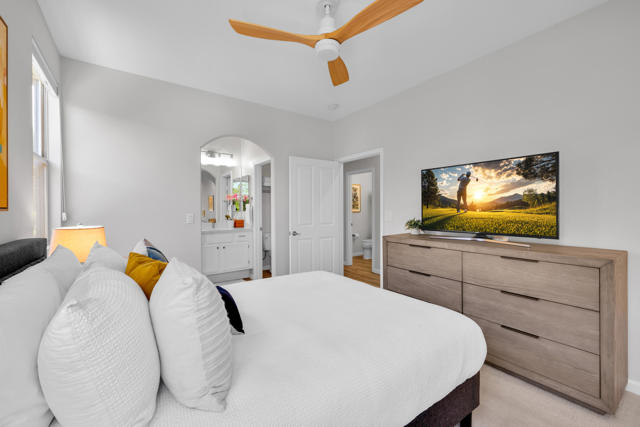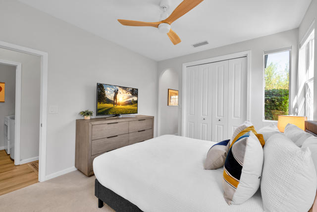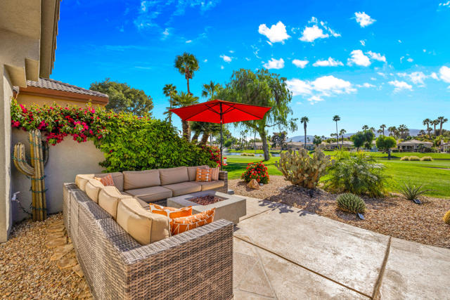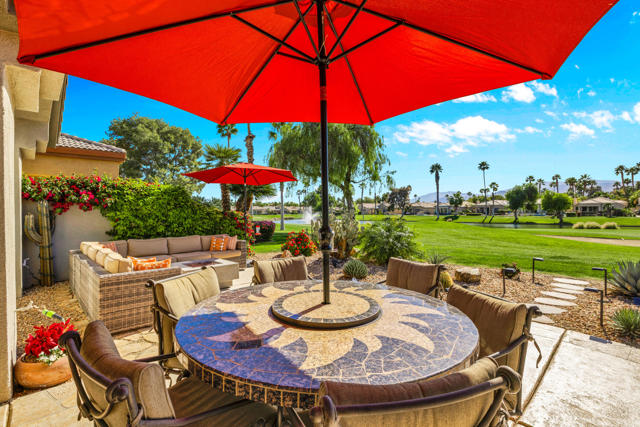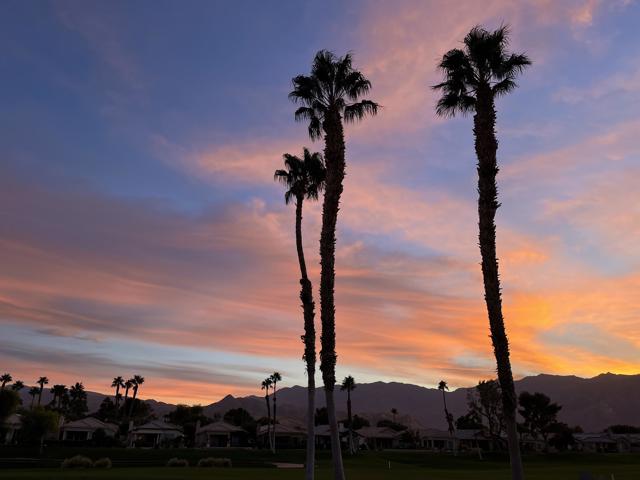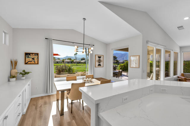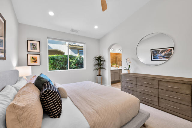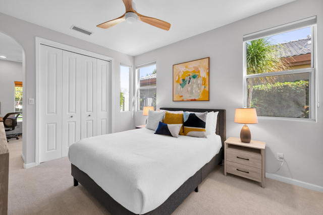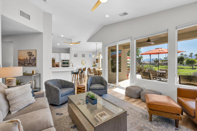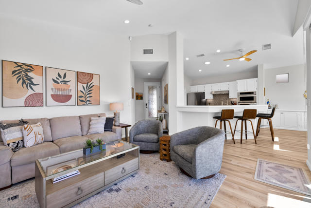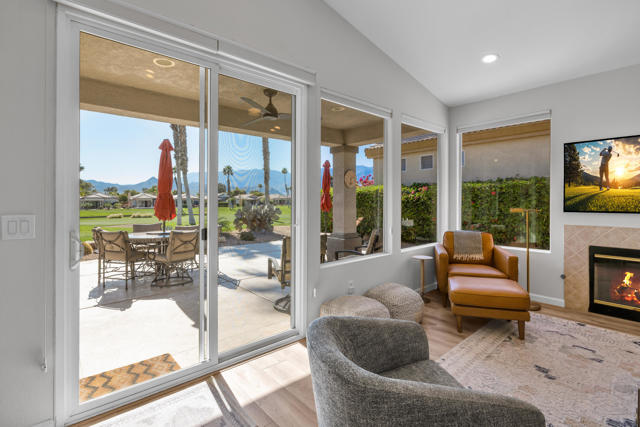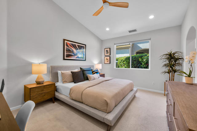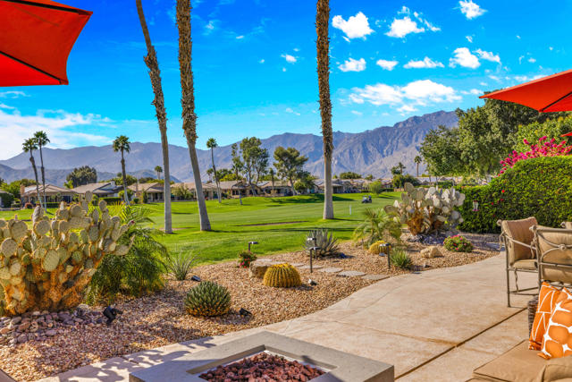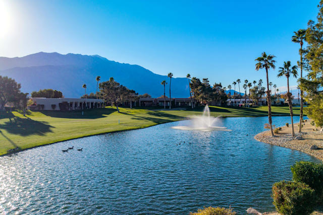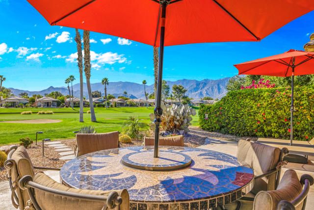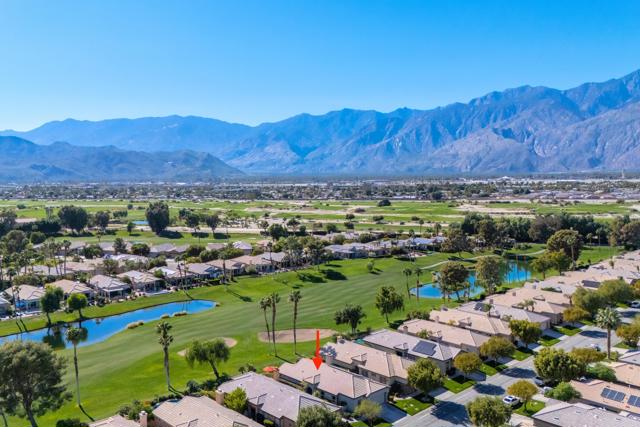 Resort living at Desert Princess Country Club shines in this beautifully updated villa with golf course views and stunning south mountain vistas on LAND YOU OWN. The kitchen has been thoughtfully upgraded with stainless steel appliances, quartz countertops, tile backsplash, and a new picture window perfectly framing the mountains. Bathrooms have been refreshed, luxury vinyl plank flooring runs throughout the main living areas and bathrooms, and custom window shades add style and comfort. The bonus room is complete with a Murphy bed for additional sleeping options. Leased solar with battery power wall supports energy efficiency, while the extended back patio creates flexible space for relaxing or entertaining outdoors. Comes partially furnished, golf cart included. Residents and guests enjoy a vibrant resort lifestyle with exceptional amenities including a newly renovated gym and spa, multiple pools and spas, tennis and pickleball courts, updated Bocce court, EV chargers, and an on-site restaurant. Golf lovers benefit from discounted access to the 27-hole championship course with no tee time lotteries or initiation fees, consistently recognized by Golf Digest as one of the best in the valley. The HOA provides outstanding value with two cable boxes, basic cable plus HBO and Showtime, high speed internet, grounds maintenance, exterior pest control upon request, outside irrigation, and more. Additional perks include dining and pro shop discounts and the comfort of a gated community with 24-hour guard gated access and security. With HOA approved short term rentals, this villa is both a welcoming desert retreat and a smart investment in one of the area's most desirable communities, just minutes from everything Palm Springs has to offer. Buyers to inquire with Cathedral City regarding short term rental requirements.