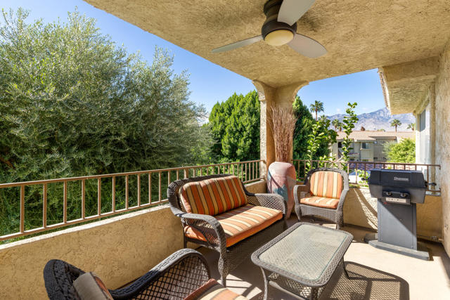 Enjoy the relaxed lifestyle that Cathedral Canyon Country Club has to offer in this 2 bedroom, 2 full bath condo. Located on the second floor, the spacious open floorplan with vaulted ceilings, creates a comfortable space for lounging or entertaining. The spacious primary bedroom opens out to the private balcony that has beautiful western views. Both bedrooms have sizeable walk-in closets providing ample storage space. The washer and dryer are discreetly tucked away inside the unit. Tankless water heater was installed in 2024. Located close to shopping, restaurants, and much more! Ideal to enjoy full time, seasonal, or as a rental property. Start living your desert lifestyle today!