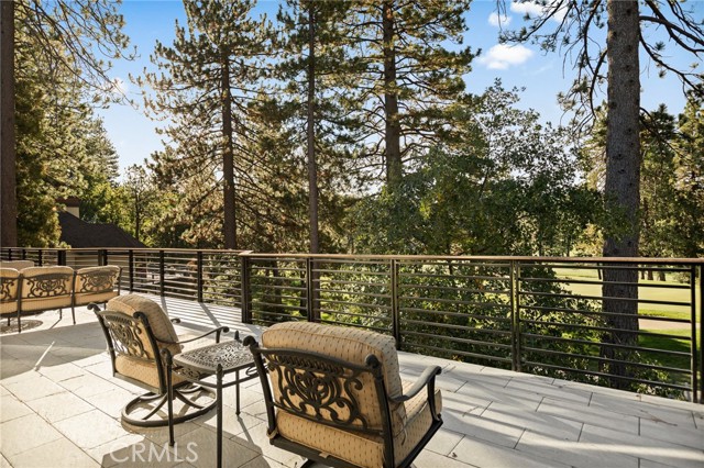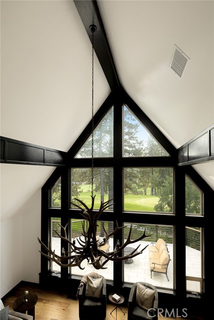 Exquisite luxury meets panoramic serenity at this fully renovated masterpiece, situated prominently on the 6th green of the prestigious Lake Arrowhead Country Club. Set within an exclusive celebrity-owned neighborhood, this residence offers unmatched views of multiple golf holes and picturesque Grass Valley Lake, with captivating vistas from every room. Meticulously redesigned, this home underwent a comprehensive renovation featuring rare and exotic finishes from RH, Arhaus, and Schoenbeck. Step into a formal foyer accented by wide plank hardwood flooring extending across the main level. The open floor plan integrates a sophisticated dining space with a gourmet kitchen, showcasing an oversized marble-topped island, Arabescato marble slab backsplash, Sub-Zero refrigerator, Wolf stove, four Wolf ovens, Cove dishwasher, drawer microwave, and elegant RH hardware. Breathtaking floor-to-ceiling windows illuminate the main living room, crowned by a striking authentic deer antler chandelier, custom cabinetry, and integrated smart home system operated via strategically placed iPads. The adjacent octagonal room offers remarkable golf views, perfect as an office or creative sanctuary. The main-level primary suite is a private retreat with vaulted ceilings, a luxurious stone fireplace, deck access, custom walk-in closet, and an opulent spa-like bathroom featuring heated floors, expansive Kohler-equipped shower, opulent $7,000 bidet toilet, and a custom Opal White Granite illuminated bathtub wall. The expansive weatherproof tile deck—over 1,000 sq ft—extends seamlessly from the office to the primary suite, ideal for entertaining or relaxing. A mudroom, emerald-accented powder room, and golf cart garage complete this level. Downstairs, a spacious game room boasts a stacked-stone fireplace, adjacent octagonal poker nook, and flexible space suitable for entertainment or theater. Additional accommodations include three bedrooms, two baths, a second primary suite with fireplace and luxe bath, plus laundry facilities. A rare golf-level patio with spa, bridge access to the course, and substantial entertaining space mirrors the upper deck’s allure. The top level presents another vaulted-ceiling primary suite with fireplace, lofted bonus area, and luxurious bath. Opposite, discover a two-story wellness haven featuring a Clearlight sauna and gym/yoga studio convertible to additional sleeping quarters. Completed by a two-car garage and a sweeping driveway.