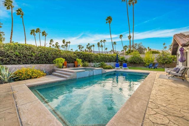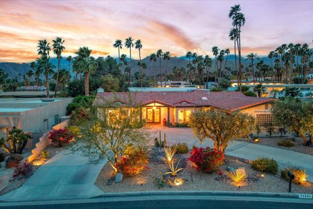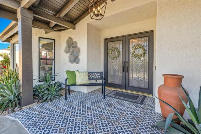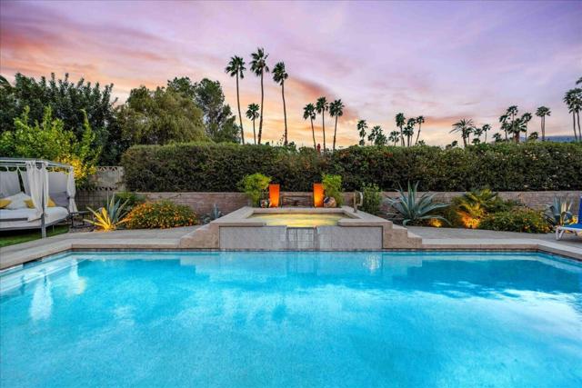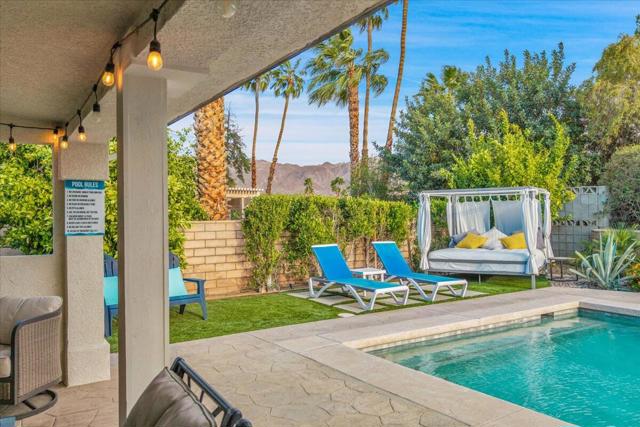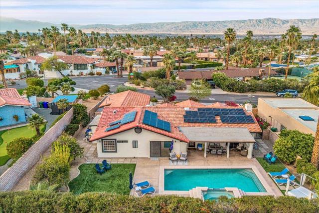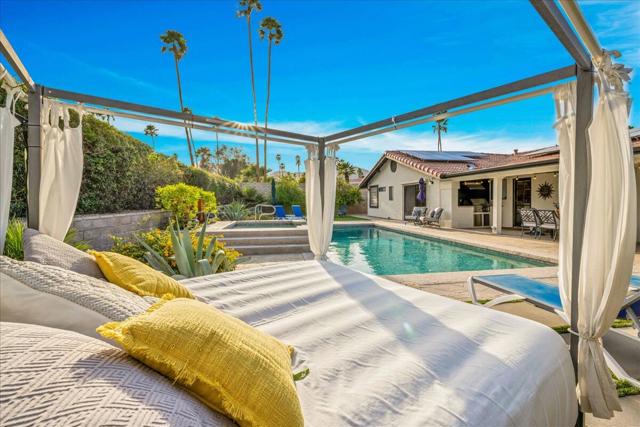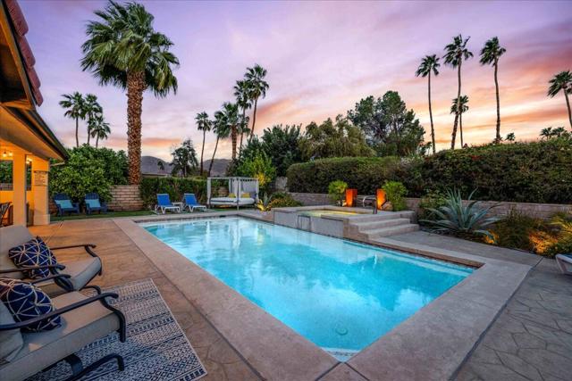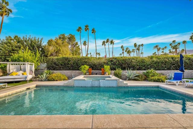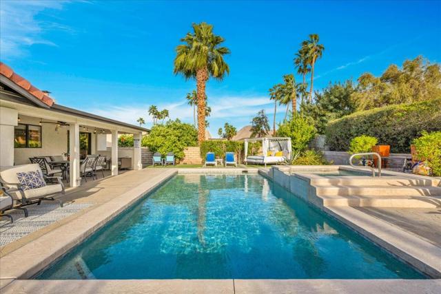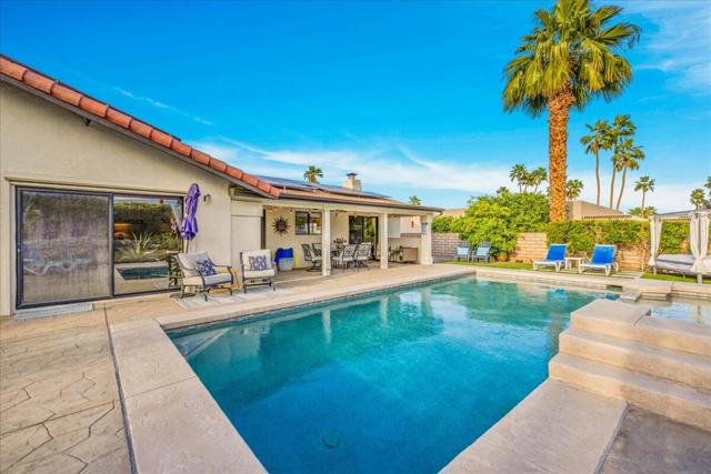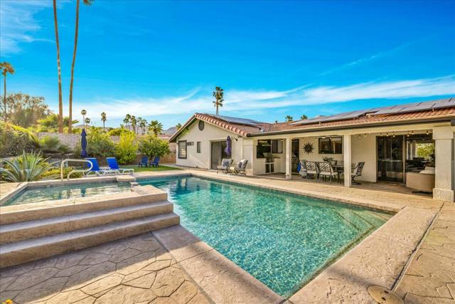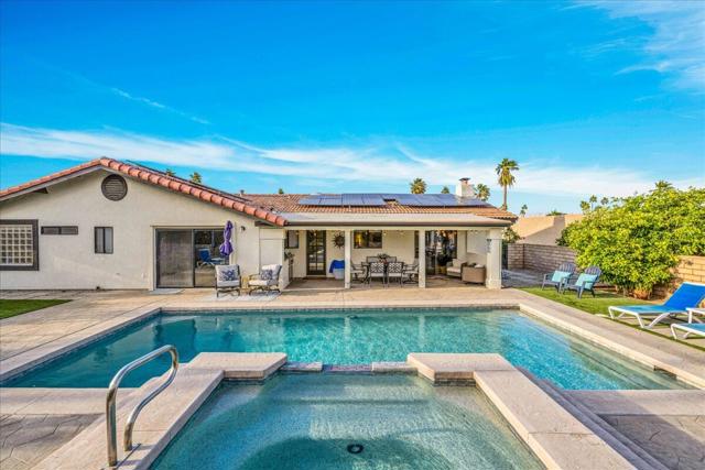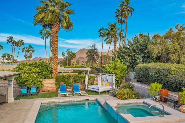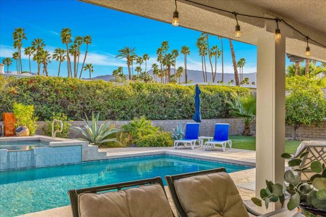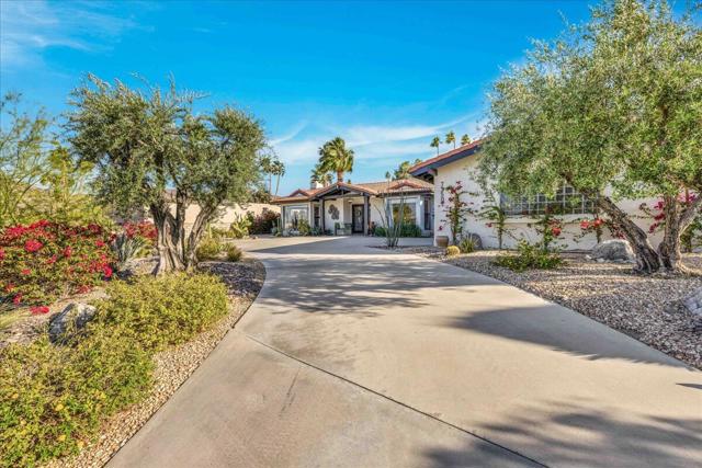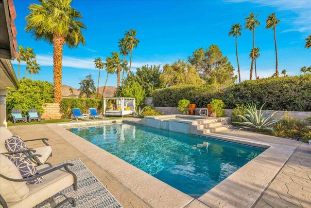 Discover Silver Spur Ranch--an enclave of unique homes nestled in South Palm Desert. THIS designer-furnished, exquisitely updated home is on an upper lot with unobstructed Southern Mountain views. Property combines vintage class with modern comforts. Sweeping circular drive sets the stage. Tiled courtyard entry. Double art glass doors open to reveal a showplace. Soaring vaulted ceiling with wood beam accent. Spacious open floor plan. Updated features throughout. Exceptional attention to detail modernizing entire property with great care, while showing respect towards its original Spanish revival core elements. Gourmet kitchen with new appliances, including floating hood vent over range, tons of countertop & cabinetry space, new backsplash. Barn door into kitchen. New fireplace tile, mantel, gas logs, rock & screen. Luxury vinyl floors in all main areas, carpeted bedrooms. Fresh interior paint. New fixtures, finishes, handles & pulls. Well-spaced bedrooms for privacy. Expansive Primary suite with spa-like bath--soaking tub, dual vanities, separate shower, oversized sized walk-in closet spaces! Sliders glide open to resort-like backyard. Sparkling pool with waterfall spa. Extended covered patio with built-in BBQ. Glorious, draped daybed to relax and enjoy desert vistas from. Hardscape enhanced by faux turf. Raised planters with mature landscape--even citrus trees! All new irrigation system, lighting and accent plants. Updated alarm system. Newly installed high-efficiency solar system. 2-Car attached garage + additional side drive for added parking. Enjoy the gorgeous interior, lounge poolside, entertain, stargaze--this is the IDEAL renovated property to call HOME! Centrally located, mere minutes from El Paseo shopping & dining, neighborhood hiking trails, The Living Desert, tennis clubs and multiple golf courses to choose from all minutes away! Furnished per inventory. Update/renovation list available upon request. Stop searching & START living!