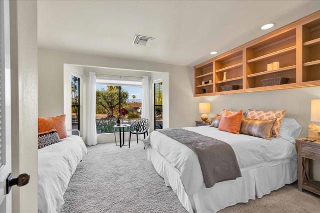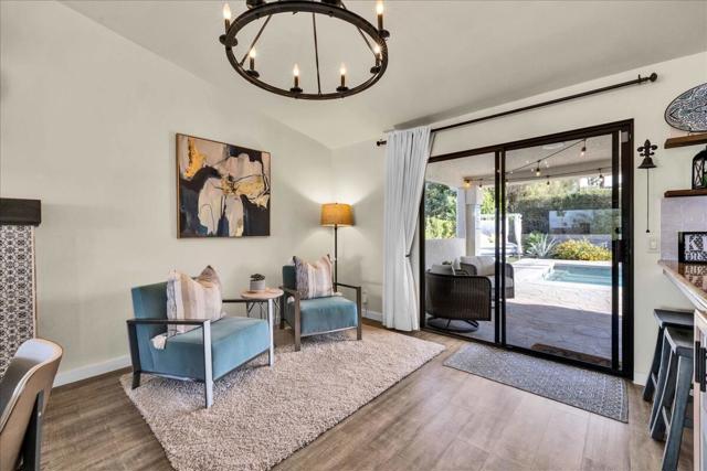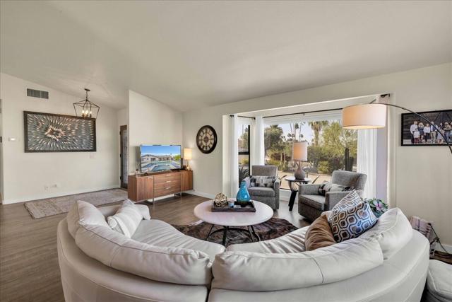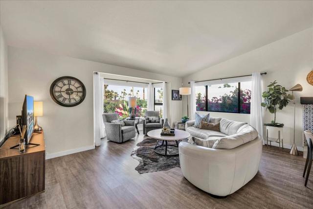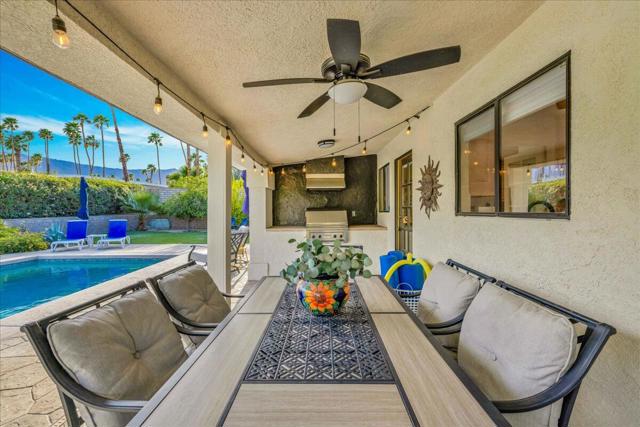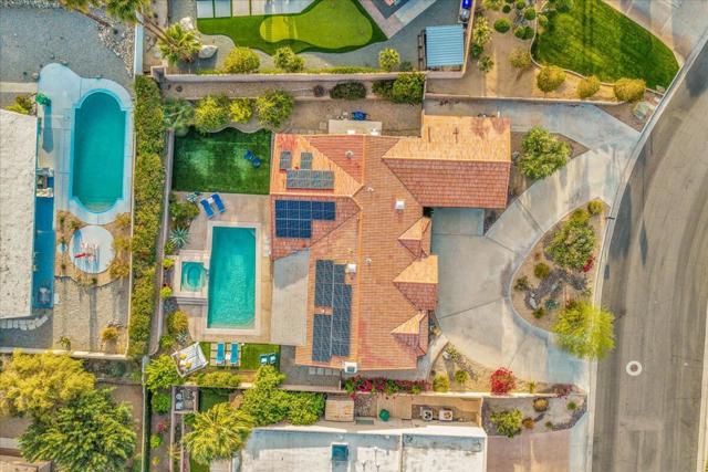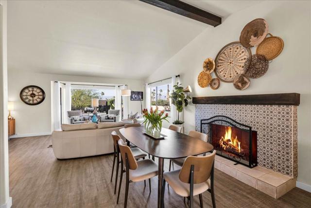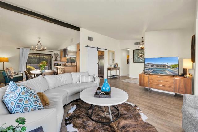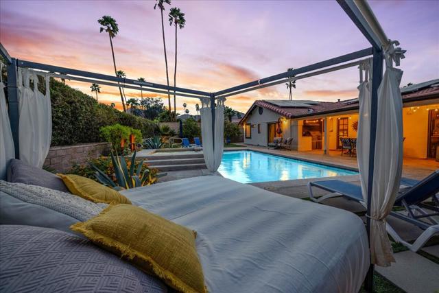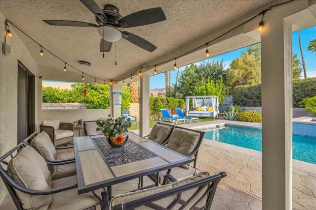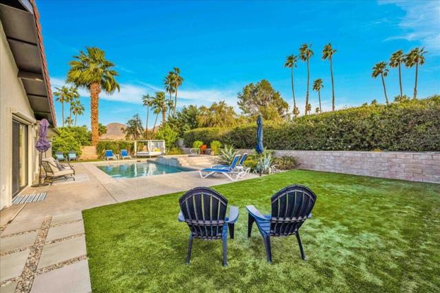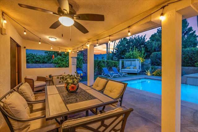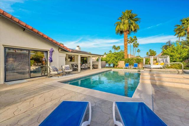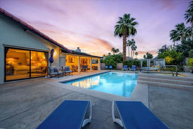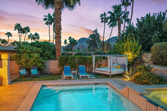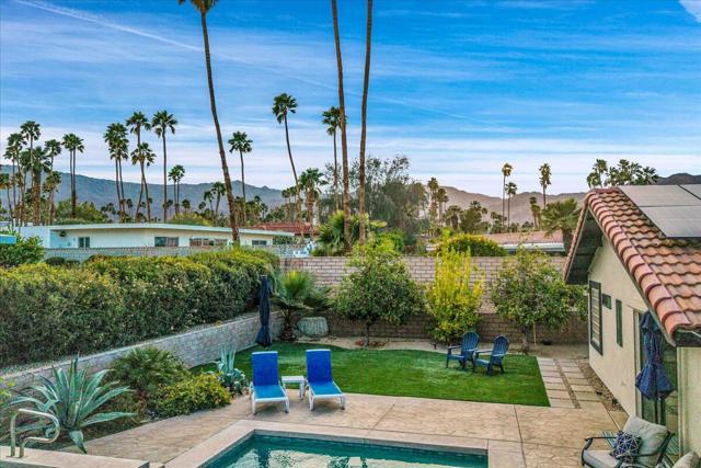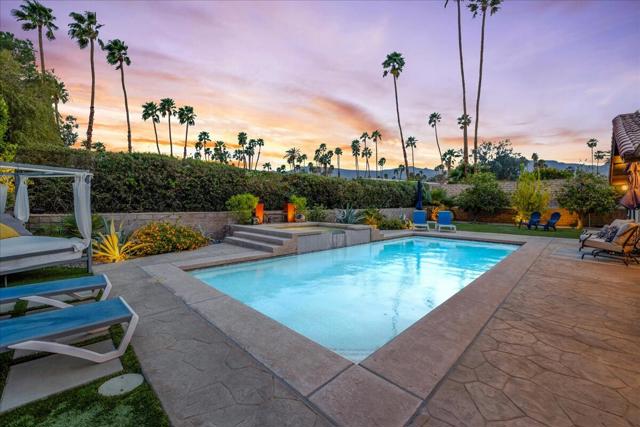 Discover Silver Spur Ranch--an enclave of unique homes nestled in South Palm Desert. THIS designer-furnished, exquisitely updated home is on an upper lot with unobstructed Southern Mountain views. Property combines vintage class with modern comforts. Sweeping circular drive sets the stage. Tiled courtyard entry. Double art glass doors open to reveal a showplace. Soaring vaulted ceiling with wood beam accent. Spacious open floor plan. Updated features throughout. Exceptional attention to detail modernizing entire property with great care, while showing respect towards its original Spanish revival core elements. Gourmet kitchen with new appliances, including floating hood vent over range, tons of countertop & cabinetry space, new backsplash. Barn door into kitchen. New fireplace tile, mantel, gas logs, rock & screen. Luxury vinyl floors in all main areas, carpeted bedrooms. Fresh interior paint. New fixtures, finishes, handles & pulls. Well-spaced bedrooms for privacy. Expansive Primary suite with spa-like bath--soaking tub, dual vanities, separate shower, oversized sized walk-in closet spaces! Sliders glide open to resort-like backyard. Sparkling pool with waterfall spa. Extended covered patio with built-in BBQ. Glorious, draped daybed to relax and enjoy desert vistas from. Hardscape enhanced by faux turf. Raised planters with mature landscape--even citrus trees! All new irrigation system, lighting and accent plants. Updated alarm system. Newly installed high-efficiency solar system. 2-Car attached garage + additional side drive for added parking. Enjoy the gorgeous interior, lounge poolside, entertain, stargaze--this is the IDEAL renovated property to call HOME! Centrally located, mere minutes from El Paseo shopping & dining, neighborhood hiking trails, The Living Desert, tennis clubs and multiple golf courses to choose from all minutes away! Furnished per inventory. Update/renovation list available upon request. Stop searching & START living!