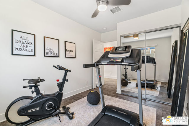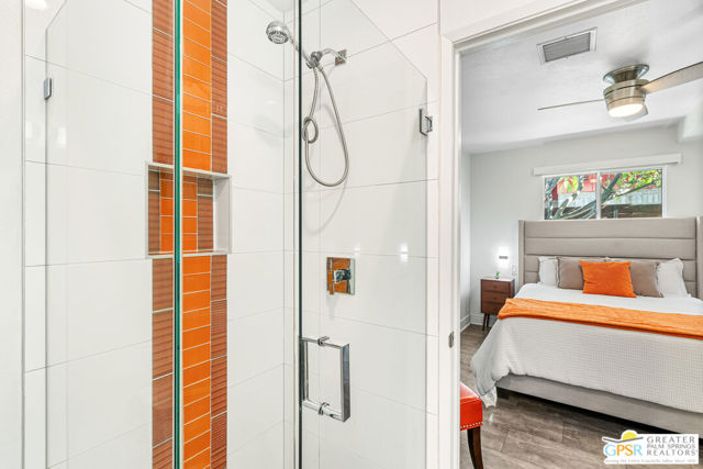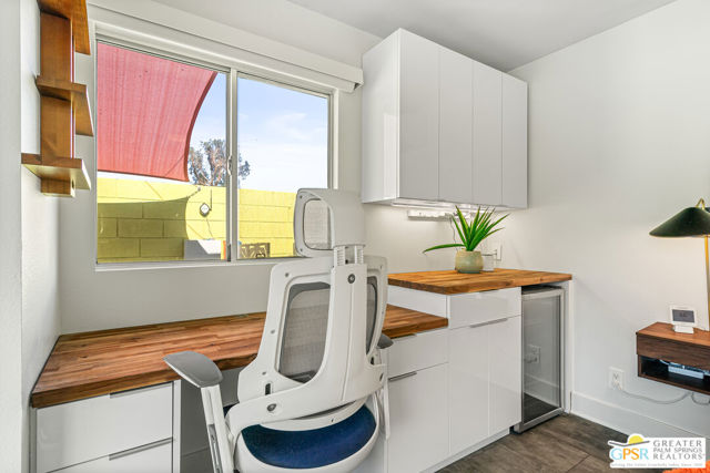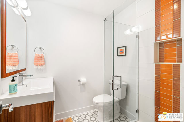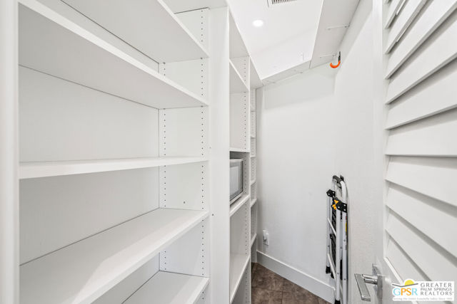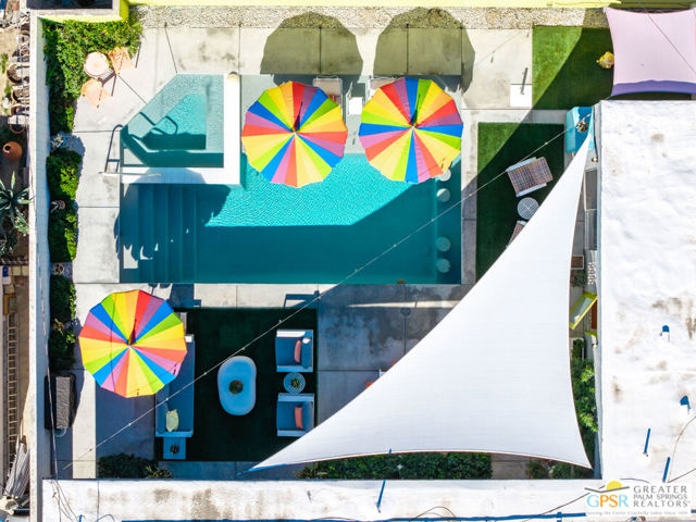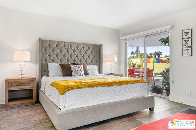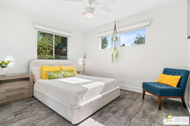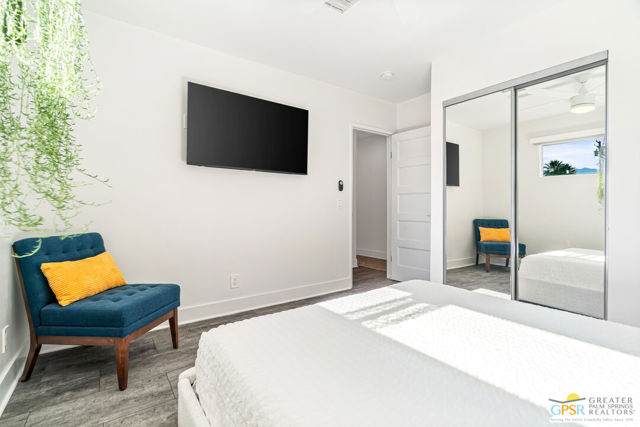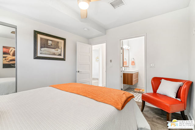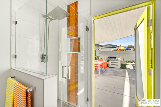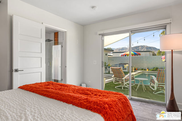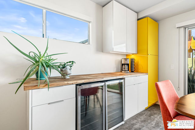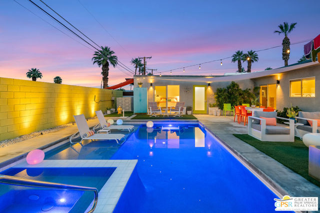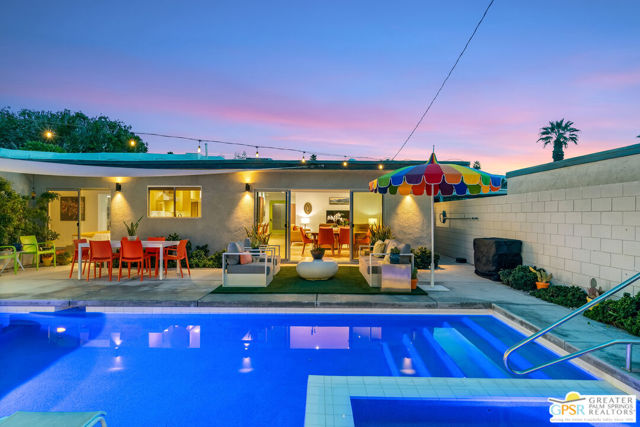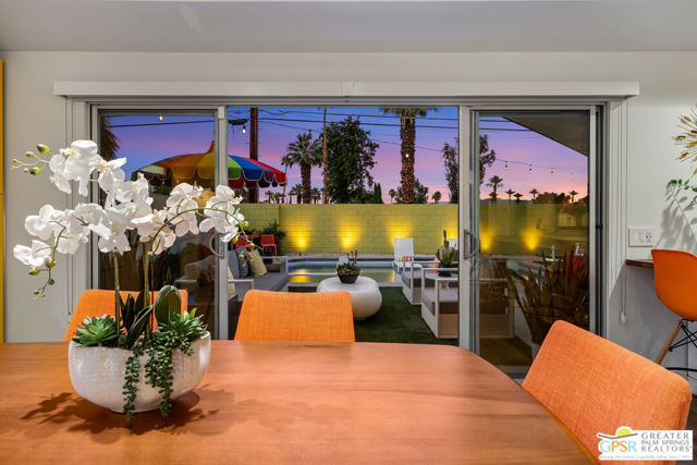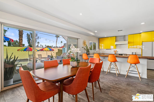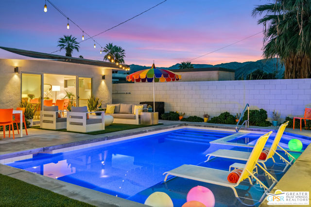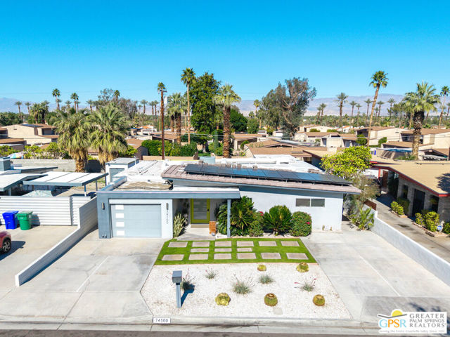Meticulously maintained and beautifully remodeled, this mid-century smart home blends timeless architectural character with thoughtful modern updates. Convenient to shopping, dining, and entertainment, the flexible floor plan offers six bedrooms and five baths, thoughtfully arranged to support today's evolving lifestyle. Select bedrooms are currently utilized as a home office and exercise room, providing versatility without compromising comfort. The detached casita serves as one of the home's six bedrooms and bathrooms, offering a spacious retreat with built-in cabinets, a desk, and room for a bed. The updated bath and additional laundry hookup enhance both comfort and convenience, making it ideal for guests or extended stays. Clean mid-century lines pair beautifully with contemporary finishes, vibrant pops of color, and curated design details that create a stylish, design-forward atmosphere throughout the home. The dining area is highlighted by a coffee bar featuring two wine refrigerators seamlessly integrated into the space, along with abundant cabinetry that offers generous storage for both daily living and entertaining. Just beyond, the kitchen showcases newer appliances, a walk-in pantry, and extensive cabinetry, delivering both functionality and visual appeal. Open living spaces flow effortlessly, creating an inviting environment for everyday living and hosting gatherings alike. Designed as a private retreat, the expansive primary suite features a spacious walk-in closet and sliding glass doors that open directly to the backyard, fostering a seamless indoor-outdoor connection. The en-suite bath complements the space with sleek floating dual vanities and refined finishes that elevate the overall aesthetic. Outdoor living captures the essence of the desert lifestyle, complete with a sparkling pool and spa, multiple areas for gathering, and beautiful mountain views that provide a stunning backdrop for relaxation or entertaining. Owned solar adds energy efficiency and long-term value, making this Palm Desert home a rare offering that celebrates mid-century charm, modern comfort, and effortless indoor-outdoor living.