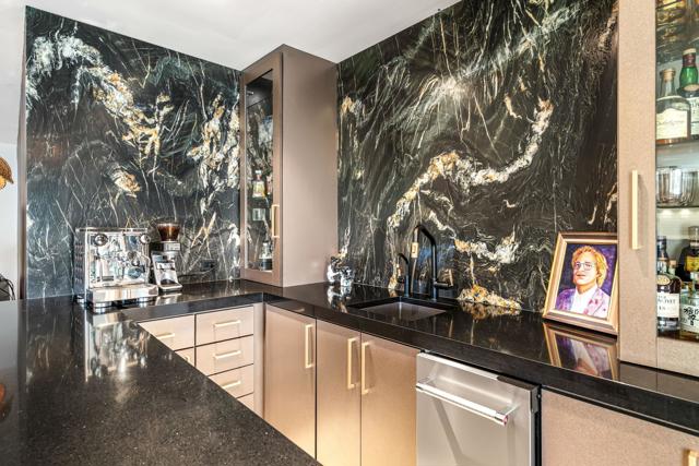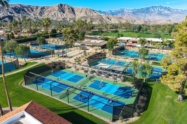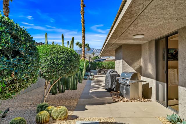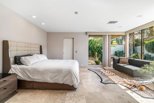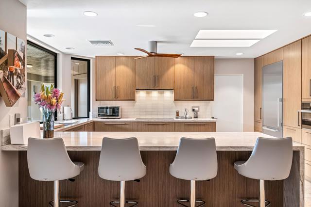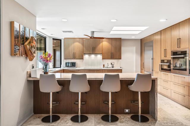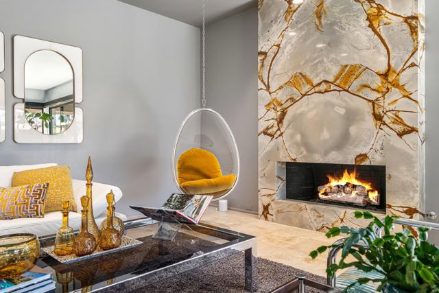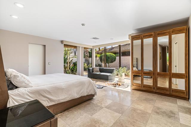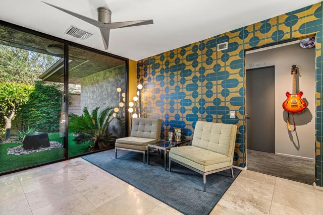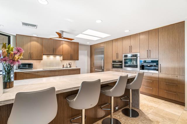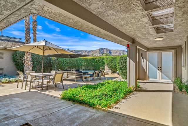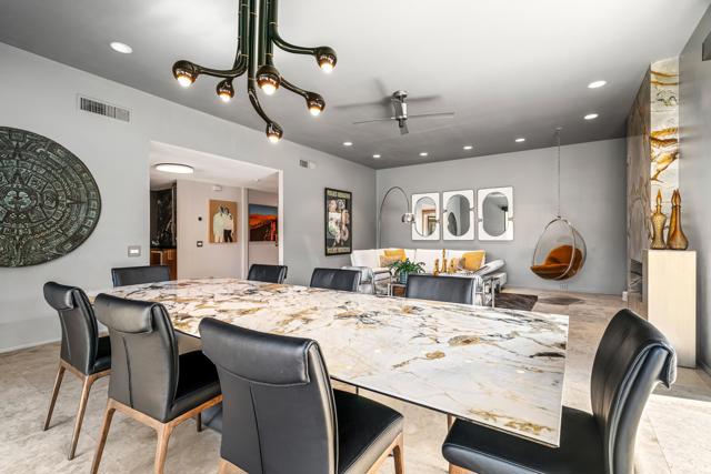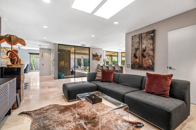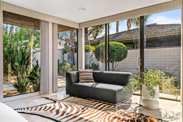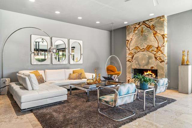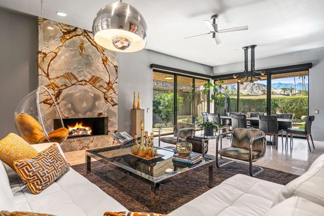 This stand-alone home has no attached neighbors. And although a 3-bedroom, it includes an additional large office space. Fully furnished with collectible mid century pieces, Jonathan Entler Chandelier, Natuzi sectional, custom bar and amazing kitchen.Full Miele kitchen with 2-dishwashers, wall mounted espresso machine, induction cooktop, convection oven and steam oven. Custom bar for entertaining and open floor plan. With custom stone, ice maker, insta-hot faucet and lux barstools.Open plan gives light and sight lines of mountain views and Sunnylands-style desert landscaping. Leased solar, skylights and on-demand hot water all add to energy efficiency.Along with the 3-ensuite bedrooms, you'll see a lovely office space with garden featuring a fountain. Design continuity throughout. High quality, thoughtful materials. Statement fireplace and Johnathan Entler dining chandelier over 10' table invite guests to enjoy the views while the sunsets.2-car attached garage, golf cart garage and built-in storage. A mix of mid century, 70s glam, and modern furniture add to the fun spirit of desert life.