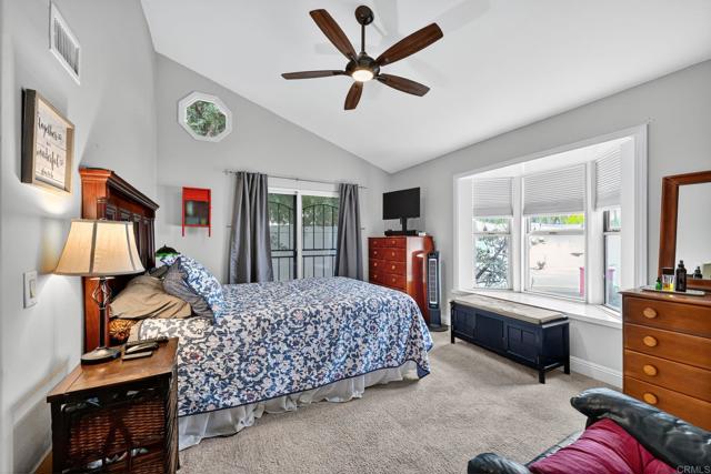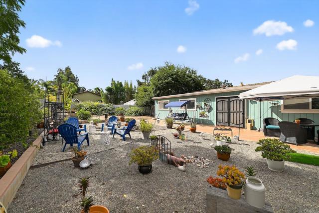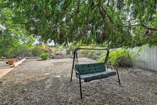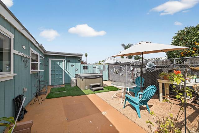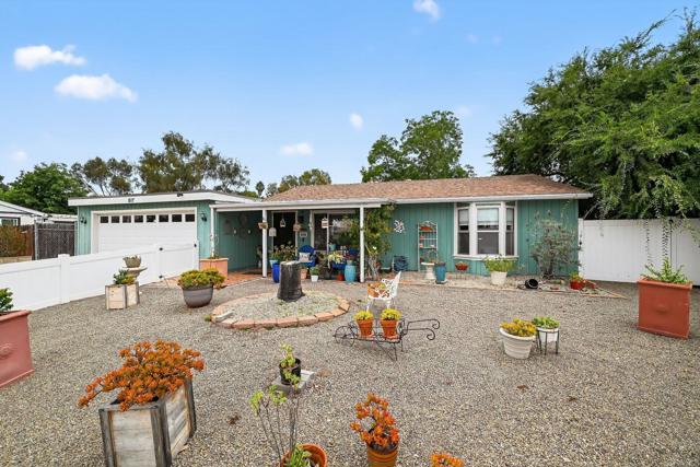 Beautiful single-level home on a quiet Vista cul-de-sac featuring a spacious two-car garage, optional RV parking, and a beautifully landscaped yard with stamped concrete, a white vinyl fence, and a low-maintenance rock and succulent garden. A detached finished structure with insulation, tile flooring, and electricity provides the perfect space for a home office, guest suite, or creative studio. The backyard includes a relaxing above-ground spa on the patio and a secluded side yard accessed from the primary bedroom through a sliding glass door, complete with a mature shaded tree and no neighbors directly behind for added privacy. Inside, the vaulted ceiling in the front living room creates an open, airy feel with a nice cross breeze from the front door to the backyard. Additional highlights include archway entrances to the kitchen and primary bedroom, central air conditioning and heating, and another sliding glass door that opens to the backyard for easy indoor-outdoor living.