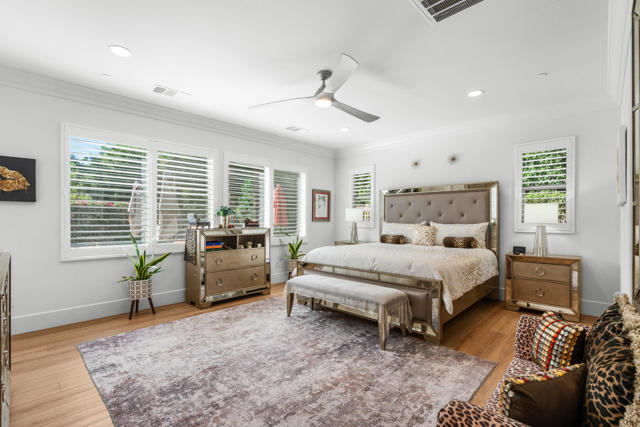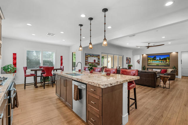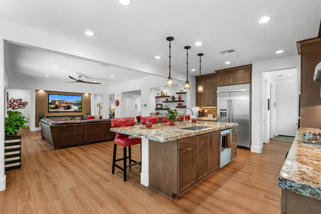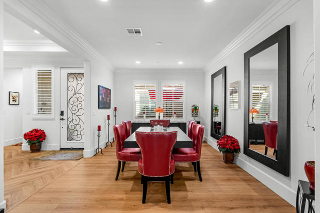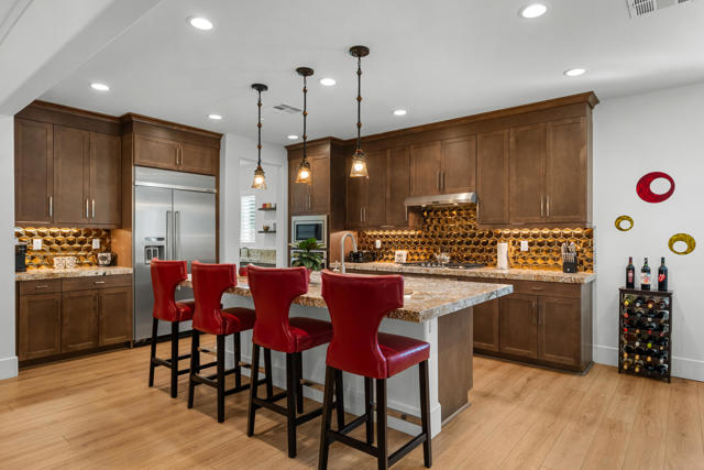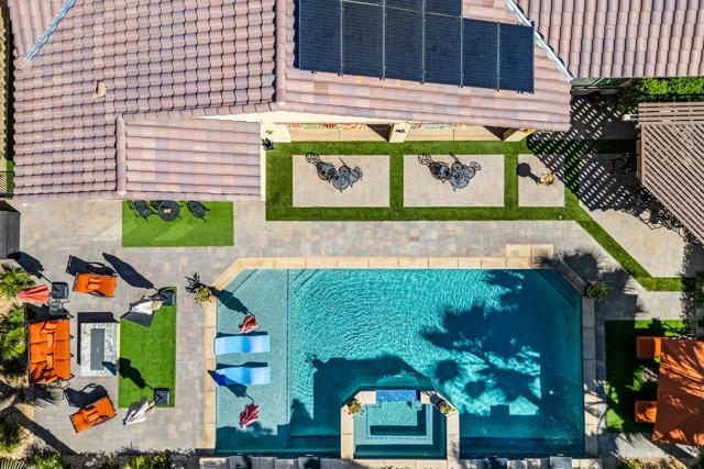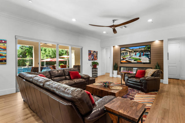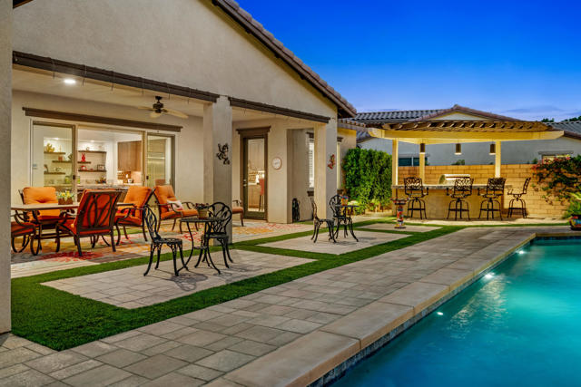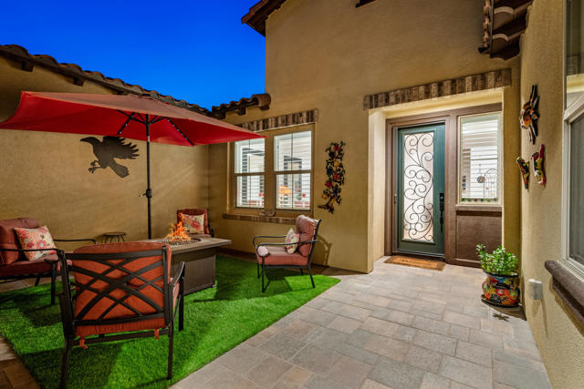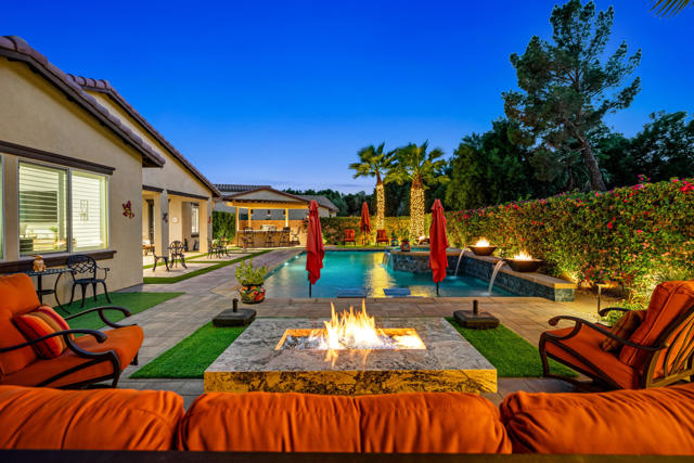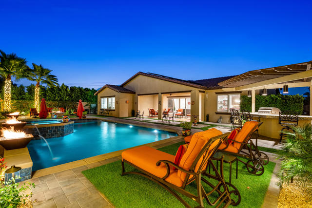 Experience resort-style living in this exquisitely upgraded 4 bed 3.5 bath 2,911 SF home with private casita on a 1/4-acre lot with 2-car plus tandem garage. Enter through a custom front gate & glass door to soaring ceilings & sunlit spaces that flow seamlessly from the grand entry to the den & formal dining room. The open-concept living area boasts a custom entertainment center & modern fireplace, framed by new flooring, baseboards, and elegant crown molding throughout.The gourmet kitchen features granite counters, a chic LED-lit backsplash, pull-out cabinets, soft-close drawers, a walk-in pantry and a spacious eat-in island with breakfast nook with all appliances included plus W&D. Down the hall are two generous guest rooms, while the casita offers its own entrance and the lavish primary suite overlooks the newly landscaped backyard retreat. Step outside to your custom designed luxurious oasis--complete with a covered outdoor kitchen and bar, lush landscaping with palms, pavers & vibrant turf plus dedicated dog run, and a resort-style pool accented by fire-and-ice bowls and a custom fire pit. Every detail, from the high-tech security and misting system to the refined finishes, creates a sanctuary of luxury, technology and timeless beauty within the gated community of Carmela.