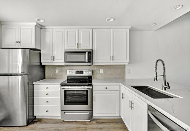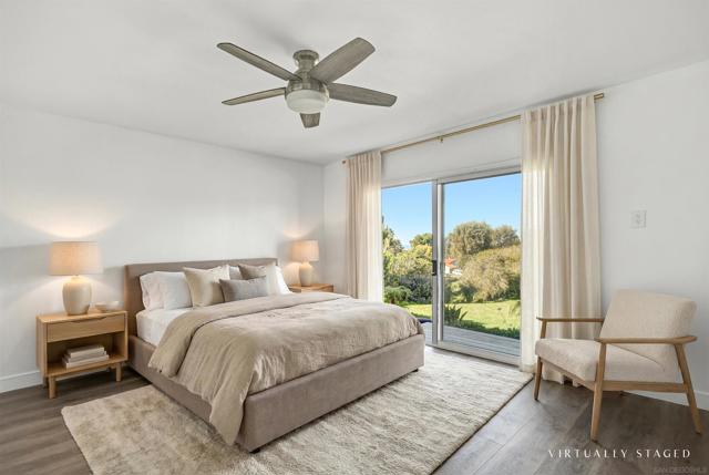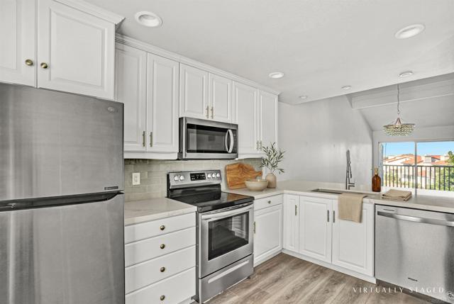 Your Carlsbad condo with peek-a-boo ocean views, modern fixtures and finishes, neutral tones, floor-to-ceiling stone fireplace, lots of natural light and cool breezes. A kitchen with stainless steel appliances, quartz countertops, luxury wood-like vinyl flooring throughout the open living space and to the lower level bedrooms. The large primary bathroom with both a standing shower and separate spacious soaking tub; step out to your deck patio space off the primary bedroom overlooking the parklike greenbelt, upstairs half bath. Other amenities include in-unit laundry, detached 1-car garage, and ample parking for a second vehicle and guests; community amenities include common pool & spa, sauna, clubhouse, and scenic walking trails, water usage, hot water included, roof, termite, trash are all covered by the HOA. Just minutes to the beach, shopping, restaurants, parks, Coaster station and excellent I-5 access. Some photos are virtually staged,