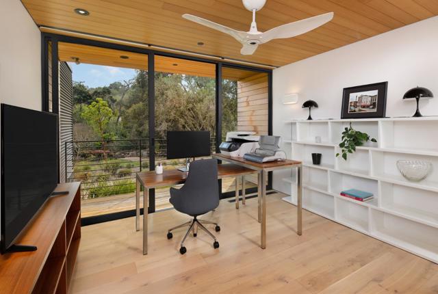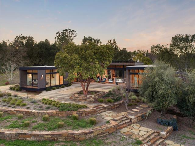 MODULAR, MODERN AND MAGNIFICENT. This home is a striking architectural statement designed with a modular concept and innovative layout. Built with warm wood and industrial-inspired corrugated steel, the exterior presents a bold, linear form that integrates beautifully into the natural surroundings of more than 2 acres. Soaring natural wood ceilings and accent walls complement the expanses of floor-to-ceiling glass, creating a harmonious balance with the outdoors. White oak flooring extends throughout, enhancing the organic aesthetic. Each of the three en suite bedrooms and an office with bath which could be the fourth bedroom is a private sanctuary, housed within its own distinct module yet thoughtfully linked to the central main living areas. Solar-powered, this home is both a design-forward masterpiece and a model of sustainability. Architecture by Swatt-Miers. Builder Forde Mazzola