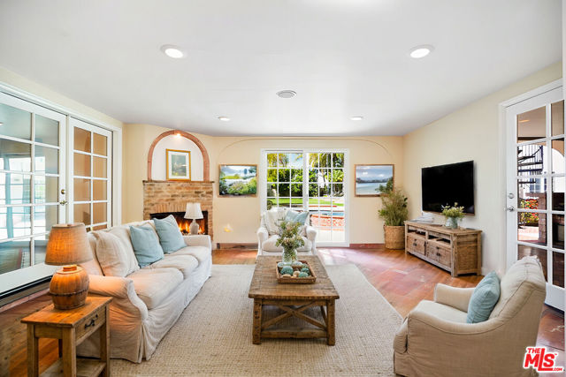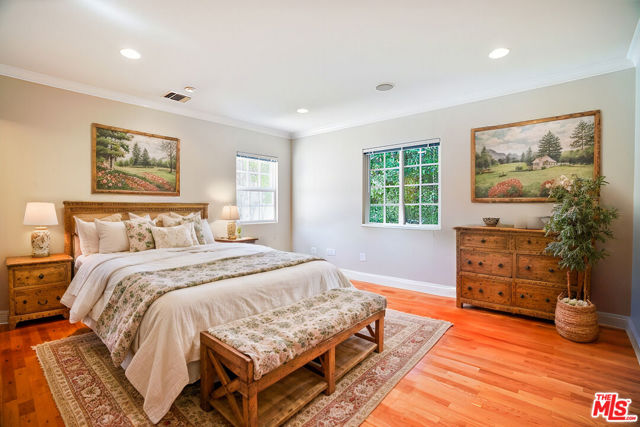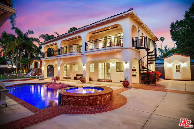 EXQUISITE GATED HOME WITH TWO-STORY GUEST HOUSE IN TOLUCA LAKE! This Spanish-Mediterranean estate with Santa Barbara flair spans 8,500 sq ft (apx) with 8 beds/8 baths across multiple structures on an expansive, flat 3/4-acre (apx) lot. A fully contained two-story guest house overlooks the saltwater pool and gardens, each level with 2BR/1BA, its own kitchen, and laundry. Ideal for multi-gen living, creatives, or excellent income potential. The primary residence adds a dedicated office with a kitchenette and a turret room with a separate entrance, plus a gym, tucked-away movie theater, and a custom "catio" to keep your cat or dog safe. The gourmet kitchen features a granite island, top-tier stainless appliances, and custom maple cabinetry; the luxe primary suite offers dual oversized walk-ins, Italian marble vanities, and a spa-caliber bath with jetted tub. Resort-style grounds include multiple courtyards, an arched rose garden, an elevated gazebo, a soothing waterfall, and a Spanish-style saltwater pool/spa, with a freestanding pool house/bath for effortless entertaining. Practical upgrades: oversized garage with additional parking, seven fireplaces, copper plumbing, concrete Spanish tile roof, smooth ceilings, multiple HVAC units, water softener/filtration, indoor/outdoor surround sound, two large storage buildings, tankless water heaters, and Cat 5 wiring. Moments from studios, cafes, and village amenities, you don't want to miss this extraordinary one-of-a-kind compound. Check out our website for more videos, aerials, and 3D imaging! SELLER FINANCING CONSIDERED -- please inquire.