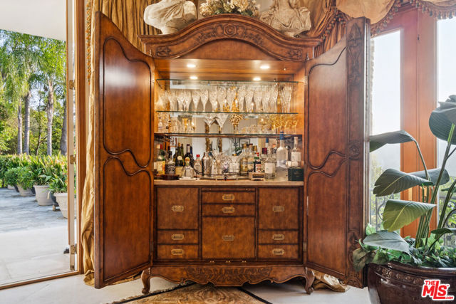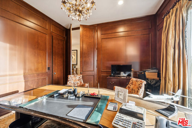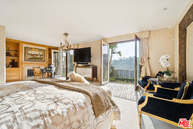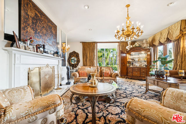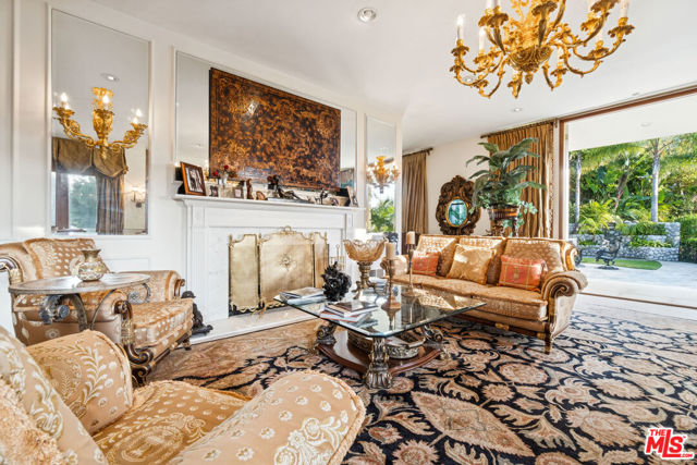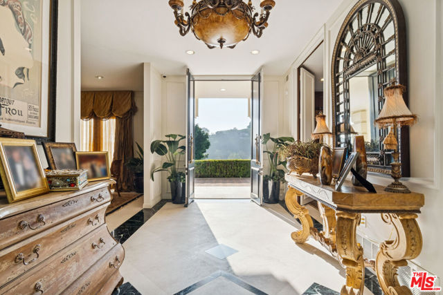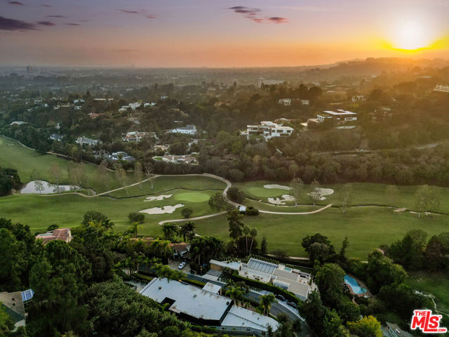 Privately Gated on an elevated 3/4-acre parcel above Bel-Air Country Club, this single-level French Regency Estate offers rare seclusion and uninterrupted panoramas of the golf course, canyons and twinkling city lights from nearly every front-facing room. A curving motor court drive introduces the residence, long known as a discreet venue for Hollywood and political gatherings thanks to its graceful scale and sophisticated allure.Beyond a formal entry, a glass-walled central atrium garden with a fountain forms a magical focal point. Generously scaled living and family rooms share a double-sided fireplace and open through multiple sets of French doors to an enchanting, slate-tiled garden framed by mature landscape and open views. A warm, wood-paneled-like library/office and a truly formal dining room fit for large gatherings both capture traditional architectural prowess. The chef's kitchen features a breakfast area, center island, Viking range with double ovens and direct access to the side garden, with a full laundry and service entry adjacent.Four bedrooms are thoughtfully arranged, including a separate wing devoted to a grand primary suite with fireplace, sitting area, French doors to view terrace, and two full baths on opposite sides one glamorously styled with Hollywood-era sensibility, a dedicated secondary laundry and custom dressing room; and the other with marble finishes, separate tub/shower and its own walk-in closet. Two additional bedroom suites enjoy front-facing canyon skylines; a fourth bedroom (ideal for staff or nursery) has an ensuite 3/4 bath.Refined finishes include honed limestone and herringbone hardwood floors, dual-zone HVAC, skylights, a 2024 roof, and layered mature landscaping that maintains total visual privacy. A proper single-story floor plan and enduring Bel Air pedigree give this estate a timeless and quietly powerful sophistication, ready for the next owner's vision.