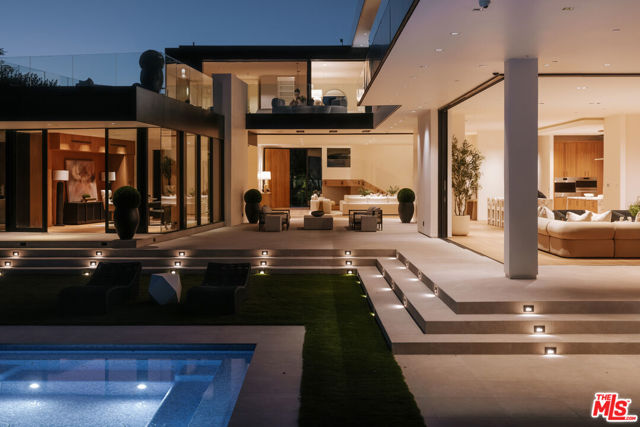 Positioned at the end of a private cul-de-sac in Bel-Air, this newly reimagined architectural estate spans approximately 10,000 square feet and captures sweeping 270-degree views across the Bel-Air Country Club, Pacific Ocean, Catalina Island, Century City skyline, and The Getty. Set behind private gates, the residence delivers scale, privacy, and presence. Walls of floor-to-ceiling glass frame the views and flood the main level with natural light, anchoring a grand great room, formal dining room with fireplace, state-of-the-art theater, and a refined bar with walk-in wine cellar. The chef's kitchen is designed for both performance and presentation, featuring dual islands wrapped in Arrebescato marble, top-tier appliances, and a separate butler's prep kitchen. Automated Fleetwood pocket doors disappear into the walls, opening to expansive terraces, a covered loggia, outdoor BBQ, and a dramatic 62-foot cantilevered pool. Upstairs, the primary suite spans approximately 2,200 square feet, offering a private view terrace, dual baths, and a dedicated lounge or executive office with wet bar. Three additional en-suite bedrooms and a secondary family lounge complete the upper level. Nearly every room commands unobstructed city and ocean views. A statement of design, privacy, and scale, this Bel-Air estate represents a rare offering in one of Los Angeles' most coveted enclaves.