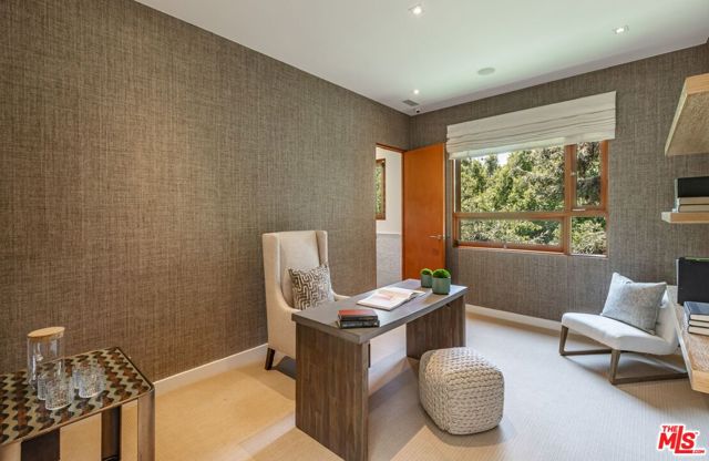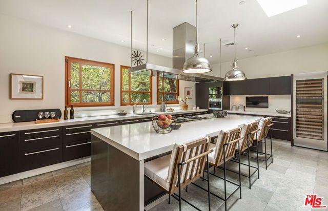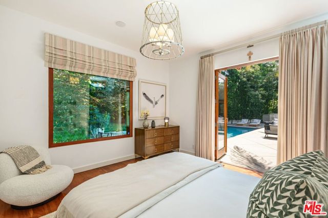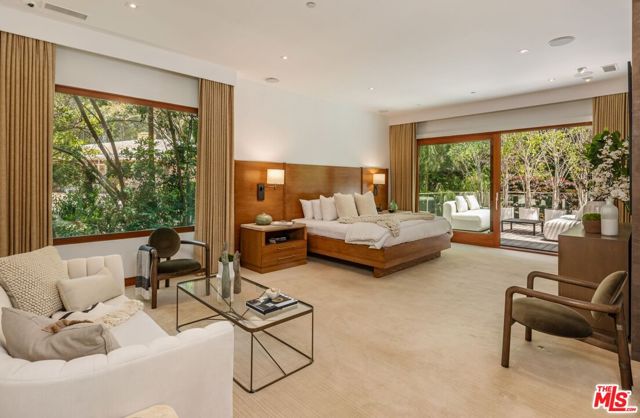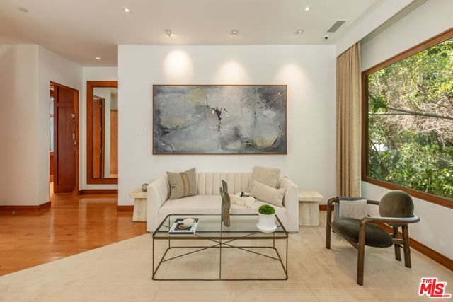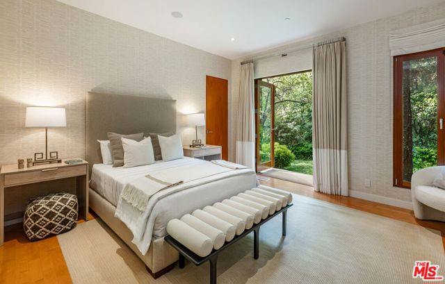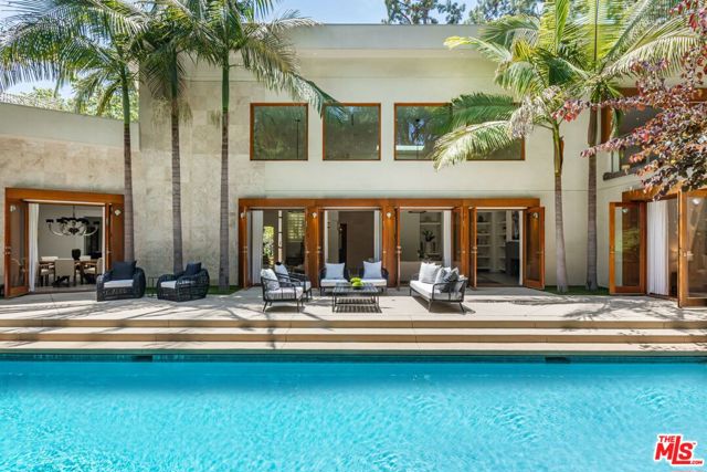 A contemporary estate nestled behind a long, gated driveway in prestigious Holmby Hills. This architectural home opens to a two-story living room with gallery lighting, skylights, and floor-to-ceiling windows framing lush, park-like grounds with pool, spa, and large deck on half an acre. The open floor plan seamlessly connects the dining room, family room, and sleek chef's kitchen with top-tier appliances. Upstairs, the primary suite offers a fireplace, a spacious balcony, a walk-in closet, and a spa-like bath. 5 bedrooms and 5.5 baths offer ample space for family and friends. Thoughtful details throughout include jade and Jerusalem stone, maple floors, and textured walls. House is equipped with a full-house generator, top of the line window break protection on all glass doors and windows, plus shutters that close at night. Large motor court and 3 car garage offer plenty of parking space. Ideally located near Harvard-Westlake Middle School, offering convenience and prestige. Also available for sale $9,950,000.