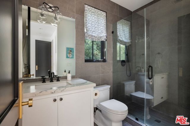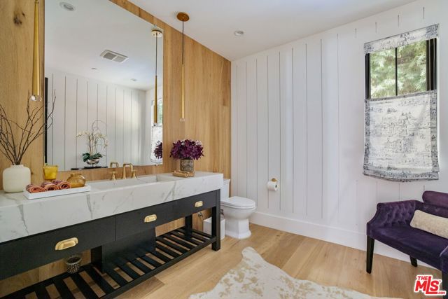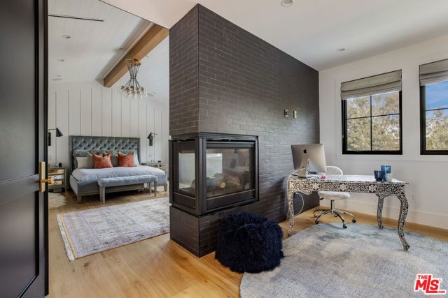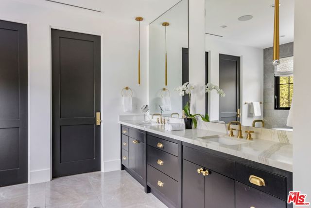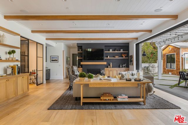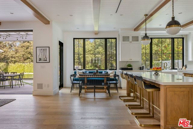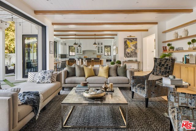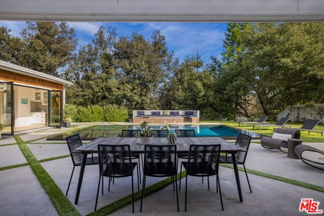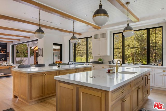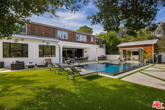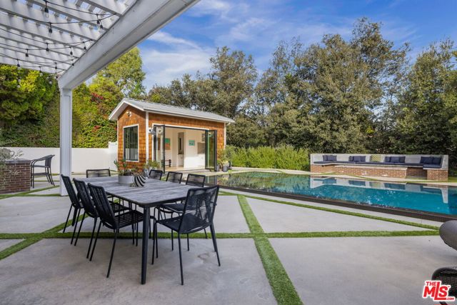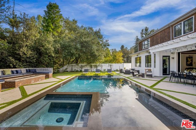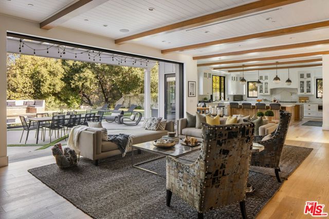 Set at the end of a quiet cul-de-sac on a coveted corner lot in Royal Oaks, this expansive newer-construction residence offers a rare combination of scale, privacy, and thoughtful design in one of Encino's most sought-after neighborhoods. From the moment you enter, the home feels open, elevated, and effortlessly livable. Soaring cathedral-height ceilings with exposed beams, oversized proportions, and abundant natural light define the main living spaces. Designed for both entertaining and everyday living, the two-level floor plan flows seamlessly from formal living and dining rooms into a generous great room with fireplace and sliding pocket glass doors that open to the backyard. The show-stopping chef's kitchen anchors the home with two substantial islands, a walk-in pantry, premium appliances, cozy eating area and ample space to gather with ease. Every living space feels intentionally oversized, including a dedicated home theater, library or study, private office, and a striking walk-in wine cellar. All five bedrooms are en suite, with three spacious secondary suites upstairseach offering walk-in closets and access to upper-level balconies. The primary suite is a true retreat, complete with a sitting room or office, a dramatic two-sided fireplace, and a spa-inspired bath finished in Carrera marble. Outdoors, the property transforms into a private, resort-style setting featuring an oversized turf lawn, expansive patio, fire pit, built-in BBQ, pool house, and a heated infinity-edge pool and spa ideal for year-round enjoyment. Additional highlights include dual-zone HVAC, security and alarm systems, and a three-car garage with glass doors. Ideally located within the Lanai Road Elementary School District and moments from studios, dining, shopping, canyon roads, and major freeways, this home delivers refined Encino living at an exceptional scale.