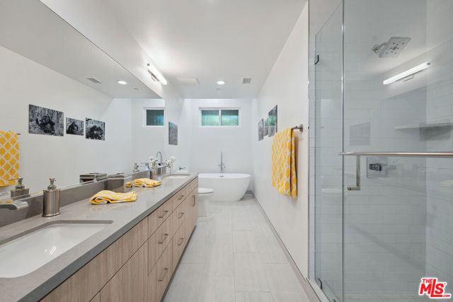 New Construction Hollywood Condominium! This beautifully built, 9-unit boutique community was crafted with quality and attention to detail throughout. Ideally located near world-class dining, shopping, and entertainment, with easy access to freeways, Metro, Griffith Park, The Greek Theatre, and the thriving Hollywood media district. Unit 202 features a 2-bedroom (both suites with almost identical bathrooms), 2.5-bathrooms, 10'-12' ft ceiling height, and offers approximately 1,500+ sq. ft. of bright, open living space. The floor plan flows naturally from the living and dining areas into a well-designed kitchen featuring a large center island, custom cabinetry, quartz countertops, and top-of-the-line GE Cafe stainless steel appliances. The primary suite provides a peaceful retreat with a spacious walk-in closet and a luxurious bathroom featuring dual sinks, a soaking tub, and a separate walk-in shower. Additional features include wide-plank engineered wood flooring, opaque glass doors, CAT 5 wiring, Decora light switches, and a full-size washer and dryer. Enjoy secured underground assigned parking for two cars, an on-site gym, and a common rear patio perfect for relaxing or dining outdoors. Move-in ready with exceptional ownership opportunity, With Favorable Terms to Make This Home More Attainable. Schedule a showing today!