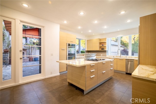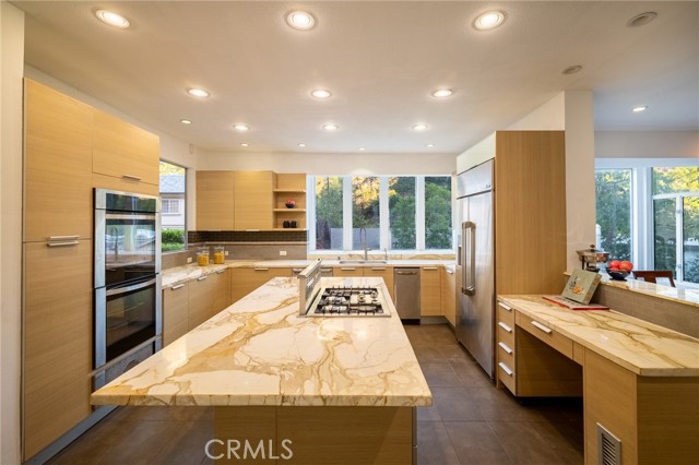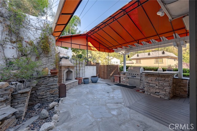 Nestled on an expanded hillside lot in the heart of Bel Air, this contemporary home offers amazing canyon views, timeless style and nearly 4,000 sqft of living space. The lovely curb appeal includes stone paver walkways, hardscaping, English ivy and beautiful garden beds. Step through the double front door to find rich hardwood floors, high ceilings and large windows that fill the home with natural light. The gorgeous kitchen features quartzite countertops, sleek European cabinetry and pro-style appliances. The kitchen leads out to the wrap-around stone patio, complete with an outdoor kitchen, a fireplace, a pergola and plenty of space to dine & entertain. The property continues up the hillside, with terraced sections that include a basketball court, a covered pavilion and a stairway that leads to spectacular views at the top. Back inside, the primary bedroom includes a beautiful custom walk-in closet, and the spa-like ensuite boasts double sinks, a frameless glass shower and a soaking tub with a view. One of the guest rooms also has a private ensuite, while another includes built-in bunks with room for four beds. The remaining bathrooms are updated and stylish. Still need more space? Head down to the lower level, which offers a massive rec room/home gym with LVP floors. Don’t forget about the 3-bay garage (one has been turned into a bonus speakeasy) as well as the home’s numerous balconies & fireplaces. This hillside retreat in Bel Air is located just a short drive from Westwood, Brentwood, Sunset and the 405. The property is zoned to excellent schools, with the coveted Roscomare Rd Elementary only about a mile away. This home offers the ultimate California lifestyle -- as there are hiking trails, golf courses, the Pacific Ocean and world-class shopping & dining options only minutes from your front door. Come take a tour of this one-of-a-kind property before someone else does!