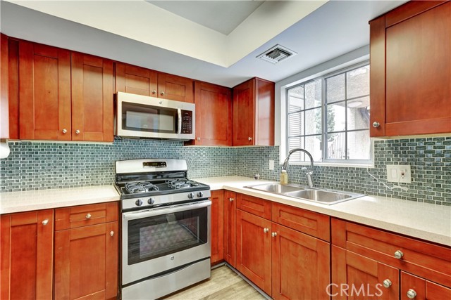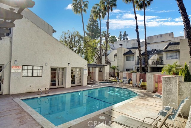 Welcome to this beautifully updated 2 bedroom 1 1/2 bathroom townhome offering stylish comfort. The home boasts an open-concept living and dining area, complemented by laminate flooring, a cozy fireplace, high ceilings, and a glass sliding door leading to the front patio. The renovated modern kitchen is equipped with stainless steel appliances, quartz countertops, and custom cabinetry. Upstairs, you'll find two spacious bedrooms with ample closet space, the main bedroom has a walk in closet, both bedrooms open to a large balcony offering views of the mountains. In unit laundry closet. Detached two car garage. The community is gated and includes a sparkling pool and spa, recreation room, lush landscaping, and guest parking. The home is centrally located in the heart of the San Fernando Valley, close to shopping, restaurants, transportation, and schools.