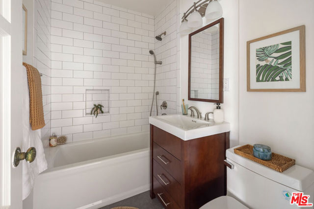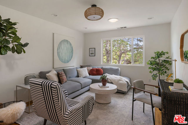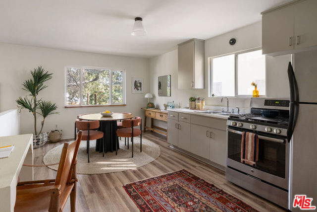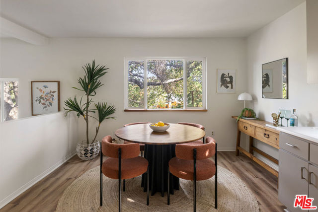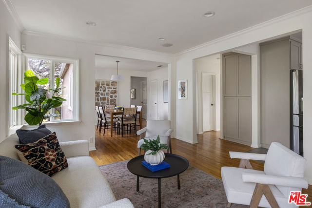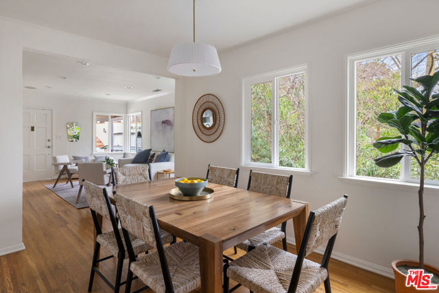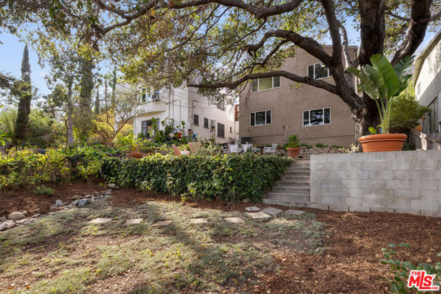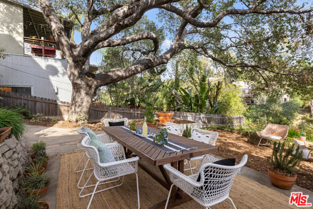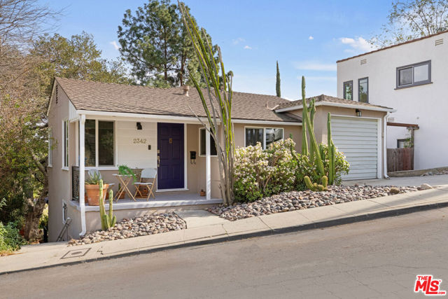 In Silver Lake, this spacious Traditional is a serene find with a scenic yard beneath a majestic oak tree. Artful landscaping sets the scene for morning coffee on the front porch; light filters through the oak canopy into the free-flowing living spaces, with hardwood floors throughout. The updated kitchen features tasteful grey cabinetry, stainless appliances, and generous storage. Three bedrooms include a primary with skylights, and the versatile third bedroom that can serve as a den or office. The bonus space under the home has a private entrance, kitchen, and bathroom, perfect for guests or creative studio. The private terraced backyard feels like a woodland escape for dining al fresco and relaxing. Amenities include AC, laundry, and garage with storage. The great location puts you moments from Edendale, Forage, Silver Lake Wine, Trader Joe's, and everything you love in Silver Lake.