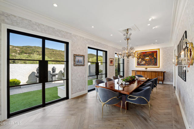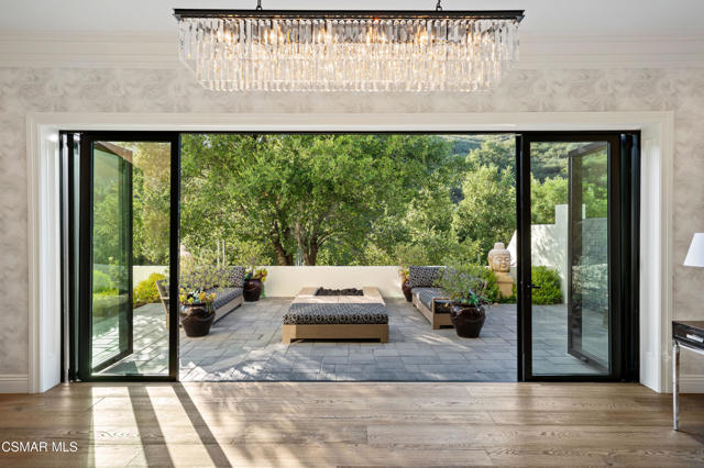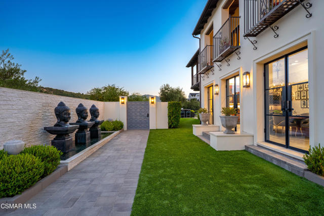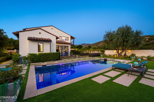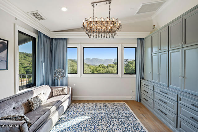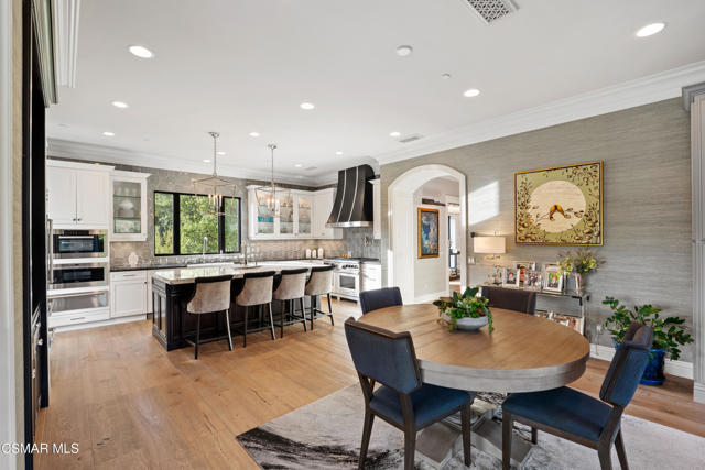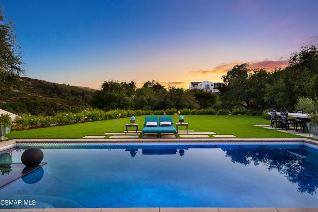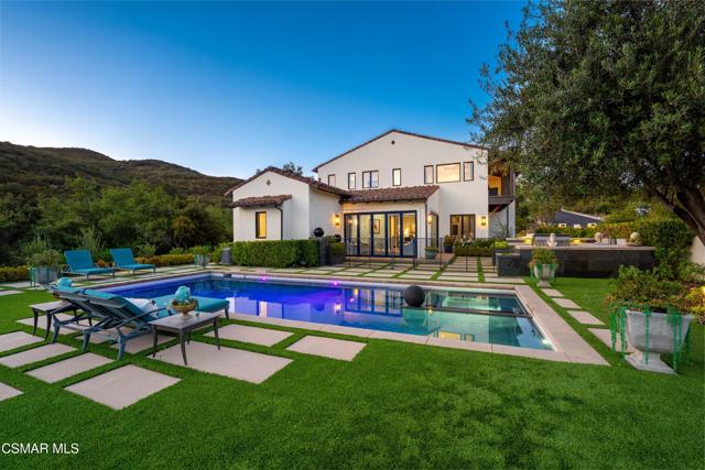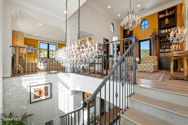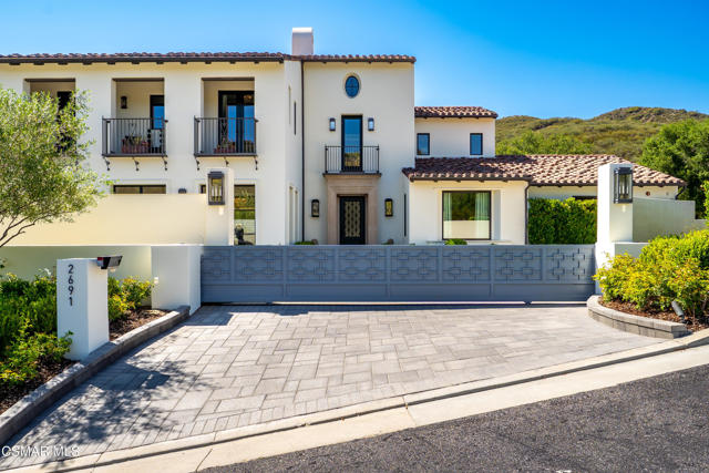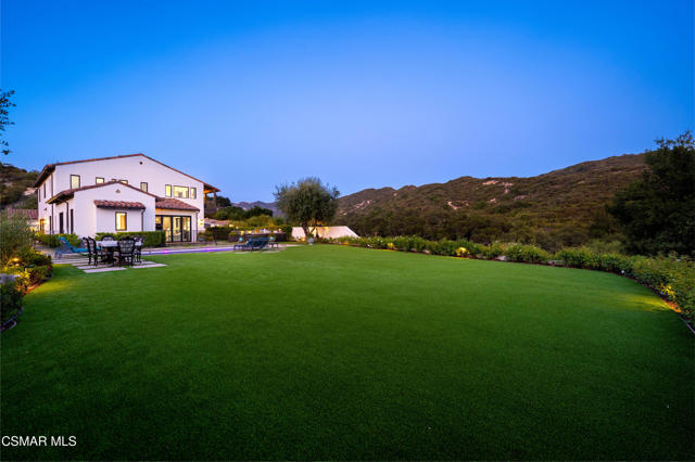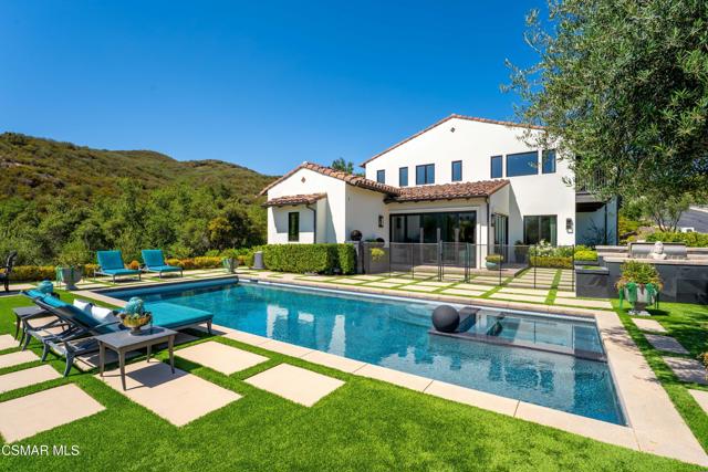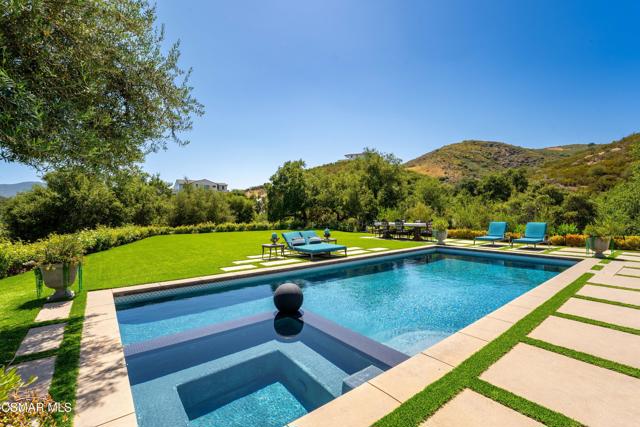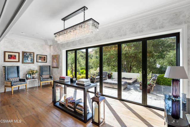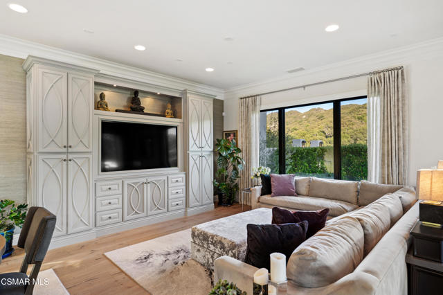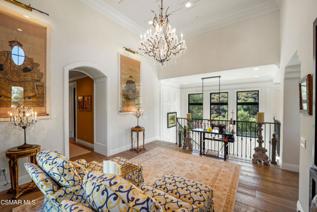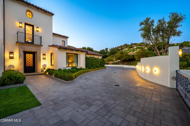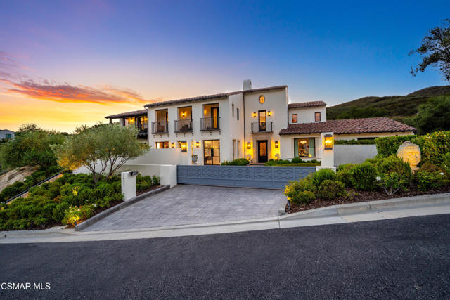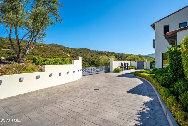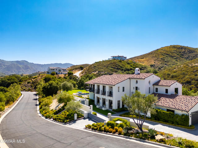 Easily the most elegant home in Calabasas. This designer estate is set behind gates in the exclusive enclave of Country Ridge, this 7-bedroom, 8-bath estate offers approximately 6,500 square feet of living space on a sprawling 8.5 acres lot. One of only seven residences, the home blends Spanish Modern architecture with rare privacy against the backdrop of the Santa Monica Mountains. The grand entry opens to light-filled interiors highlighted by a dramatic linen-wrapped fireplace, detailed ceilings, and custom cabinetry. Designer wall coverings and Restoration Hardware fixtures bring warmth and elegance throughout. The formal dining room and sunlit conservatory extend seamlessly to patios and gardens, ideal for entertaining. At the heart of the home, a chef's kitchen is appointed with Wolf, Sub-Zero, and ASKO appliances, complemented by a catering and butler's pantry. The adjoining great room flows to manicured outdoor spaces with a resort-style pool, barbecue area, and Zen gardens framed by canyon and ridge line views. Two downstairs bedrooms offer versatility, including an immaculate junior master suite with sauna, soaking tub, and walk-in closet--perfect for in-law quarters. Upstairs, five ensuite bedrooms, a library, and den provide comfort and style, including a primary suite with private balcony, spa bath, and steam shower. The grounds provide plenty of space to add a casita or ADU, enhancing both lifestyle and value. A rare combination of scale, luxury, and thoughtful design, this estate captures the essence of Southern California living.