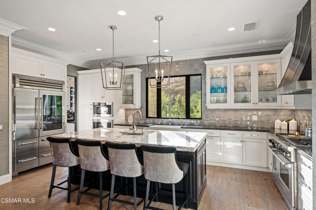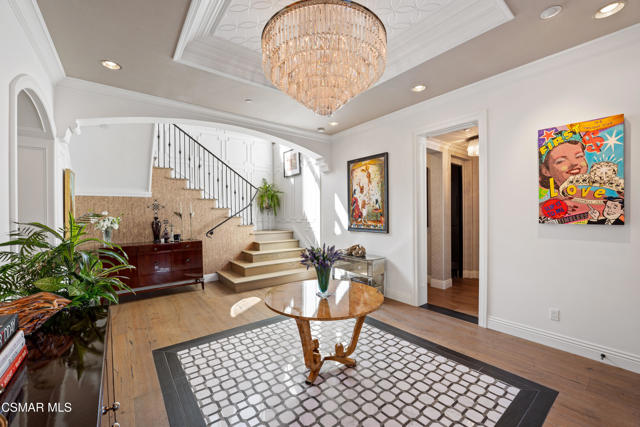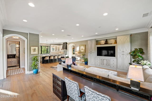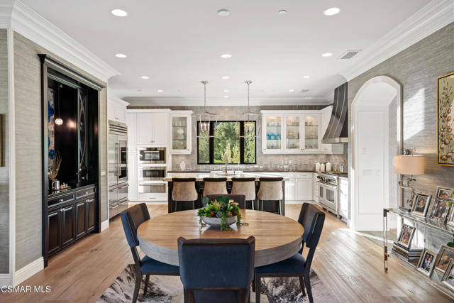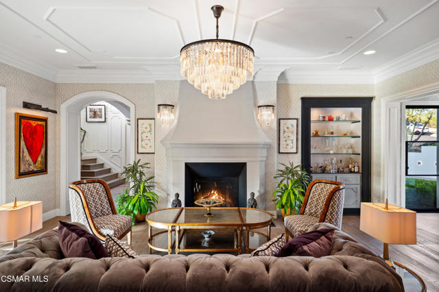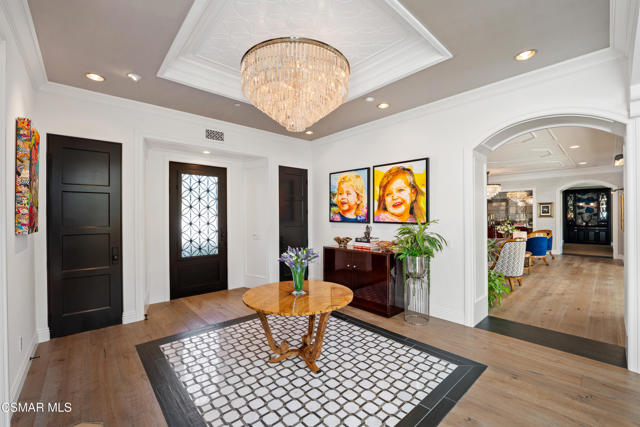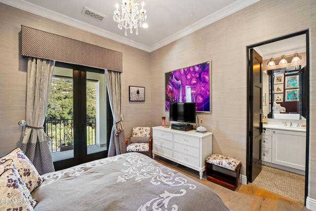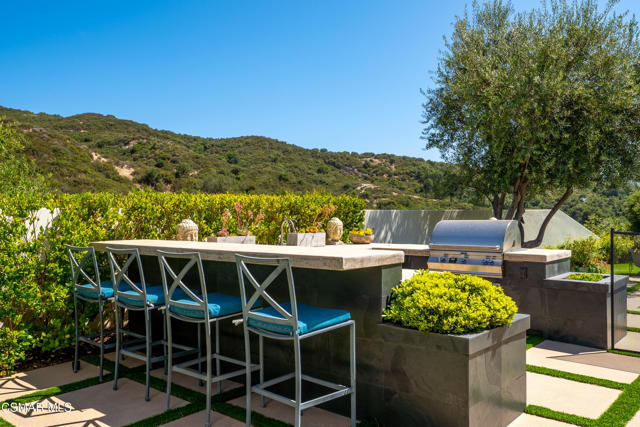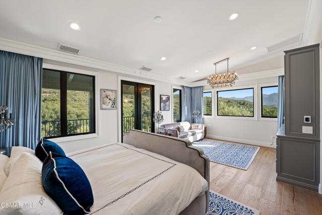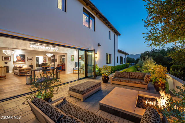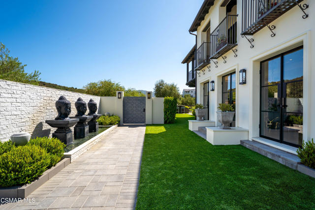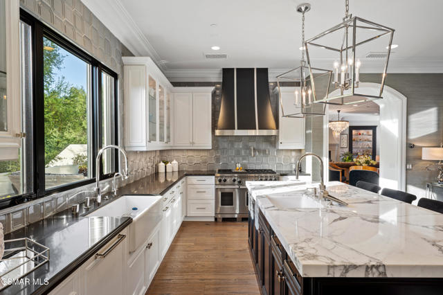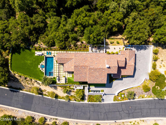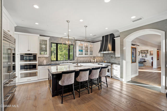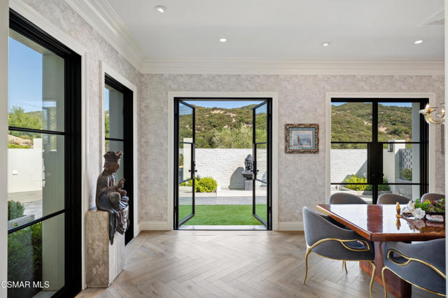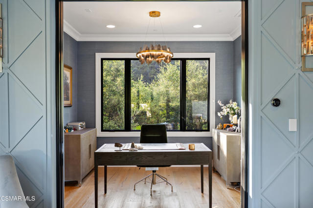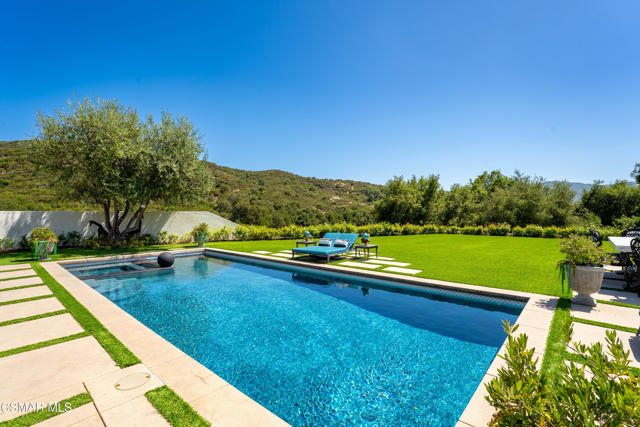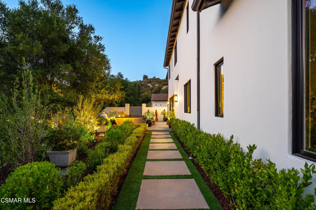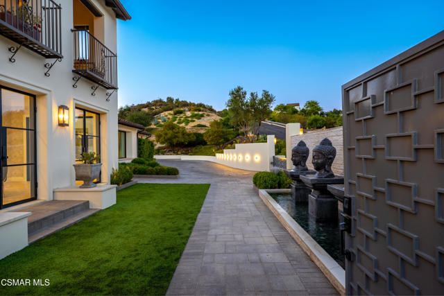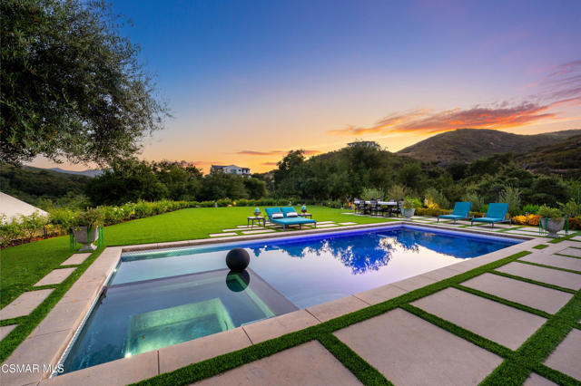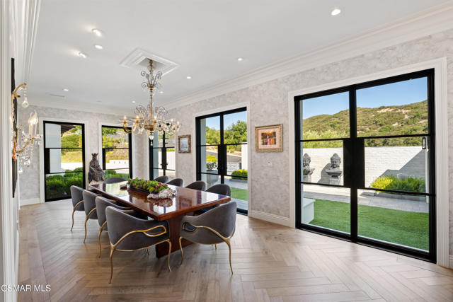 Easily the most elegant home in Calabasas. This designer estate is set behind gates in the exclusive enclave of Country Ridge, this 7-bedroom, 8-bath estate offers approximately 6,500 square feet of living space on a sprawling 8.5 acres lot. One of only seven residences, the home blends Spanish Modern architecture with rare privacy against the backdrop of the Santa Monica Mountains. The grand entry opens to light-filled interiors highlighted by a dramatic linen-wrapped fireplace, detailed ceilings, and custom cabinetry. Designer wall coverings and Restoration Hardware fixtures bring warmth and elegance throughout. The formal dining room and sunlit conservatory extend seamlessly to patios and gardens, ideal for entertaining. At the heart of the home, a chef's kitchen is appointed with Wolf, Sub-Zero, and ASKO appliances, complemented by a catering and butler's pantry. The adjoining great room flows to manicured outdoor spaces with a resort-style pool, barbecue area, and Zen gardens framed by canyon and ridge line views. Two downstairs bedrooms offer versatility, including an immaculate junior master suite with sauna, soaking tub, and walk-in closet--perfect for in-law quarters. Upstairs, five ensuite bedrooms, a library, and den provide comfort and style, including a primary suite with private balcony, spa bath, and steam shower. The grounds provide plenty of space to add a casita or ADU, enhancing both lifestyle and value. A rare combination of scale, luxury, and thoughtful design, this estate captures the essence of Southern California living.