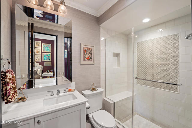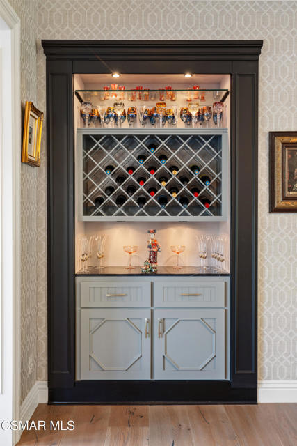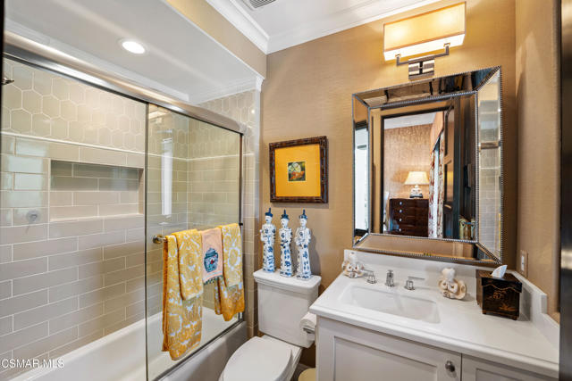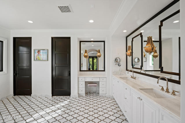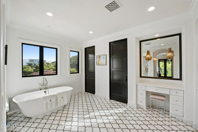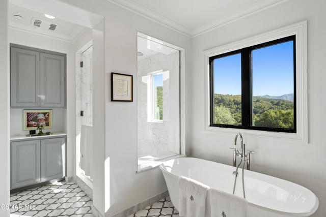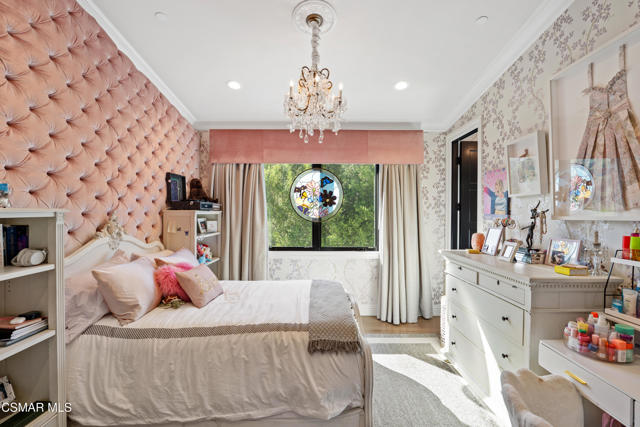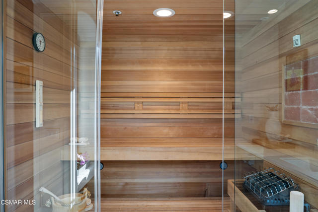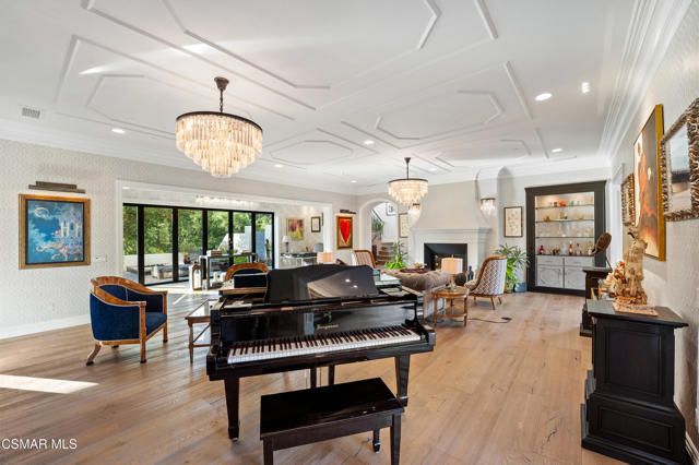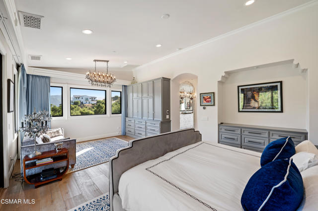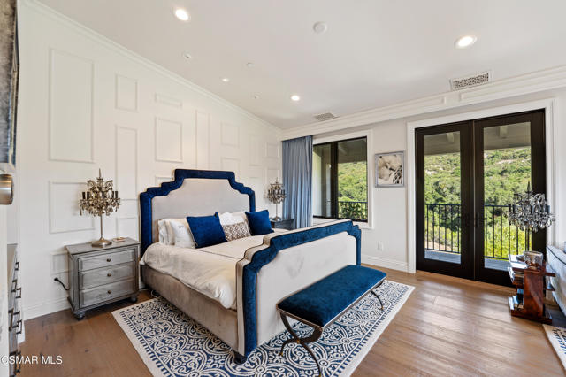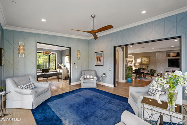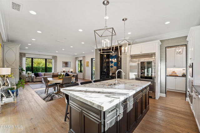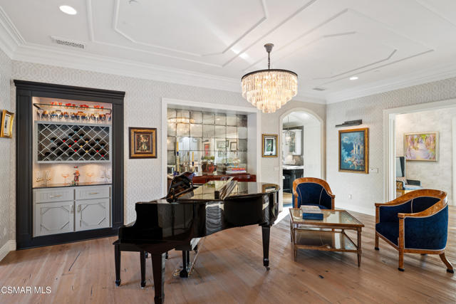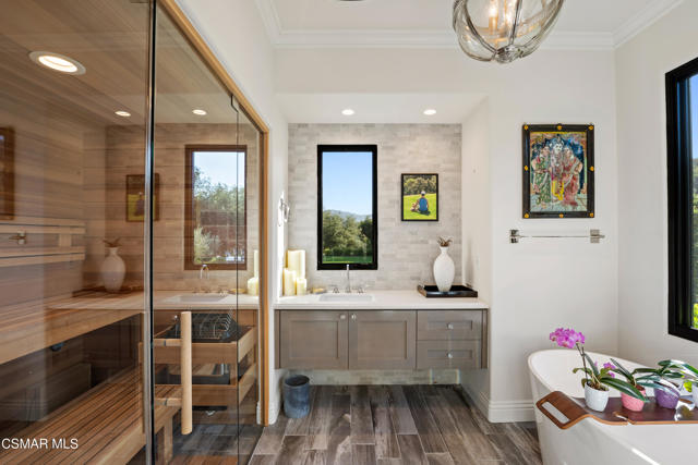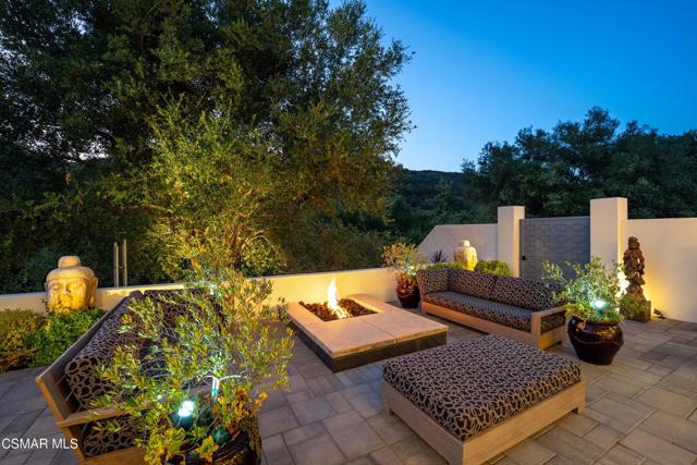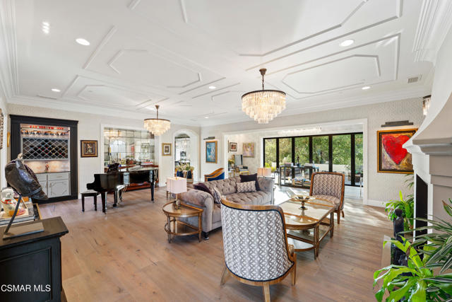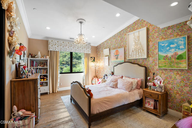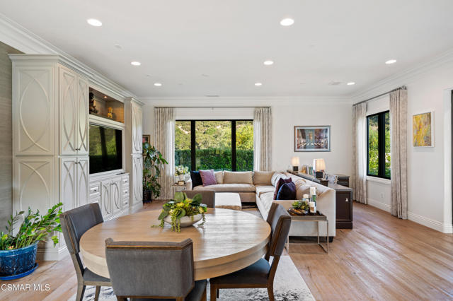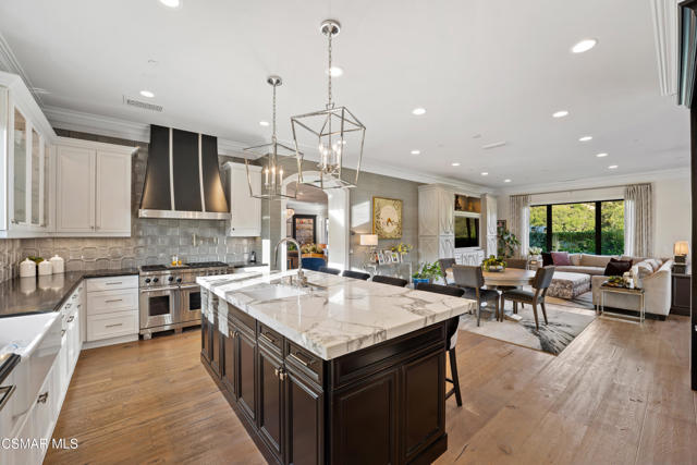 Easily the most elegant home in Calabasas. This designer estate is set behind gates in the exclusive enclave of Country Ridge, this 7-bedroom, 8-bath estate offers approximately 6,500 square feet of living space on a sprawling 8.5 acres lot. One of only seven residences, the home blends Spanish Modern architecture with rare privacy against the backdrop of the Santa Monica Mountains. The grand entry opens to light-filled interiors highlighted by a dramatic linen-wrapped fireplace, detailed ceilings, and custom cabinetry. Designer wall coverings and Restoration Hardware fixtures bring warmth and elegance throughout. The formal dining room and sunlit conservatory extend seamlessly to patios and gardens, ideal for entertaining. At the heart of the home, a chef's kitchen is appointed with Wolf, Sub-Zero, and ASKO appliances, complemented by a catering and butler's pantry. The adjoining great room flows to manicured outdoor spaces with a resort-style pool, barbecue area, and Zen gardens framed by canyon and ridge line views. Two downstairs bedrooms offer versatility, including an immaculate junior master suite with sauna, soaking tub, and walk-in closet--perfect for in-law quarters. Upstairs, five ensuite bedrooms, a library, and den provide comfort and style, including a primary suite with private balcony, spa bath, and steam shower. The grounds provide plenty of space to add a casita or ADU, enhancing both lifestyle and value. A rare combination of scale, luxury, and thoughtful design, this estate captures the essence of Southern California living.