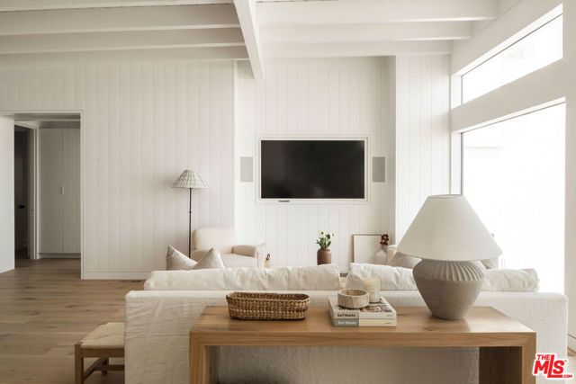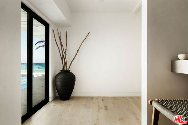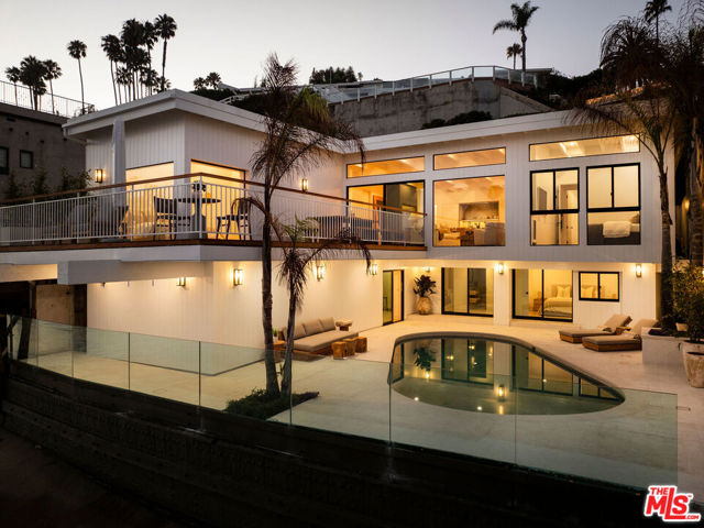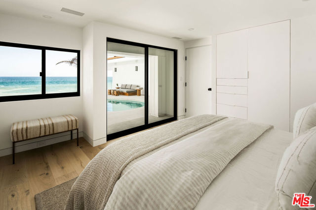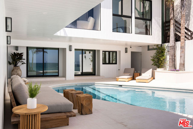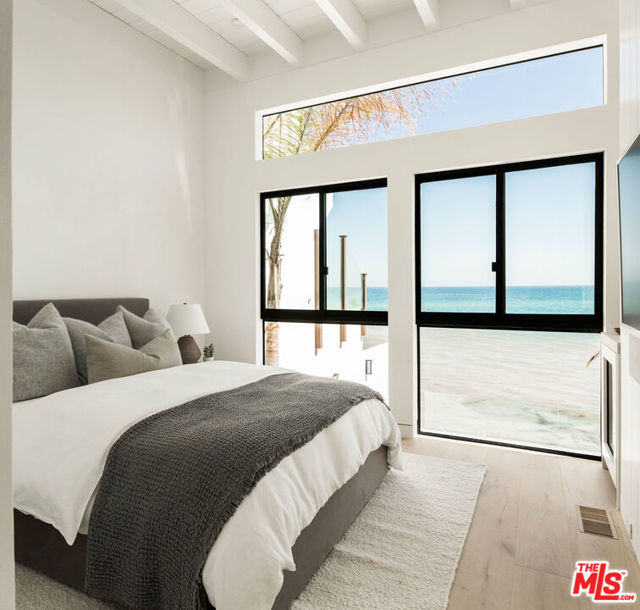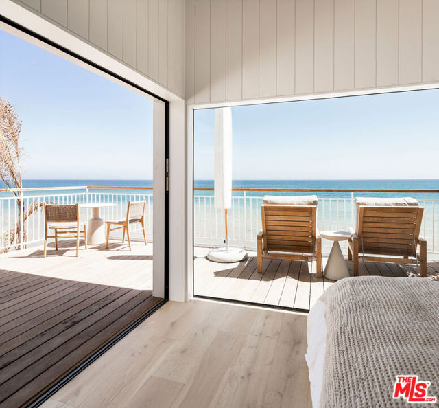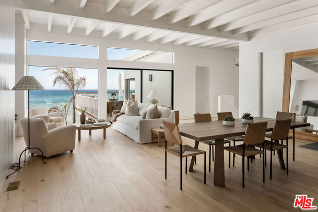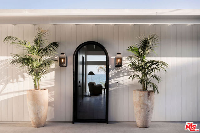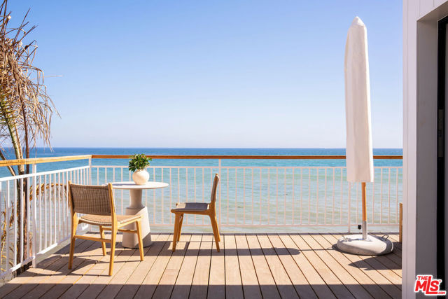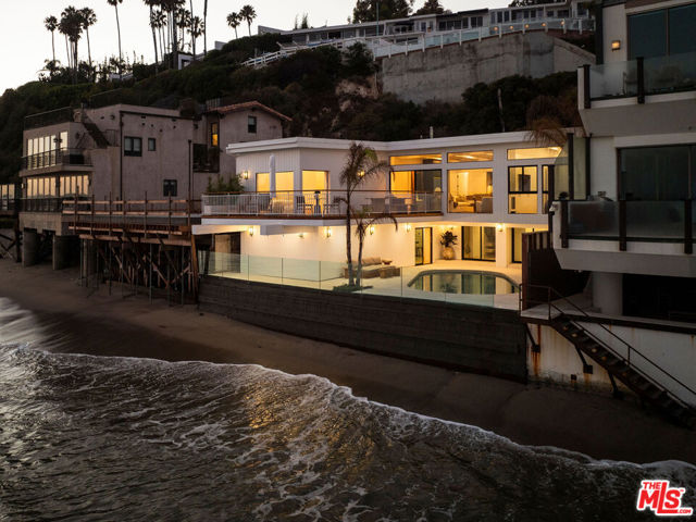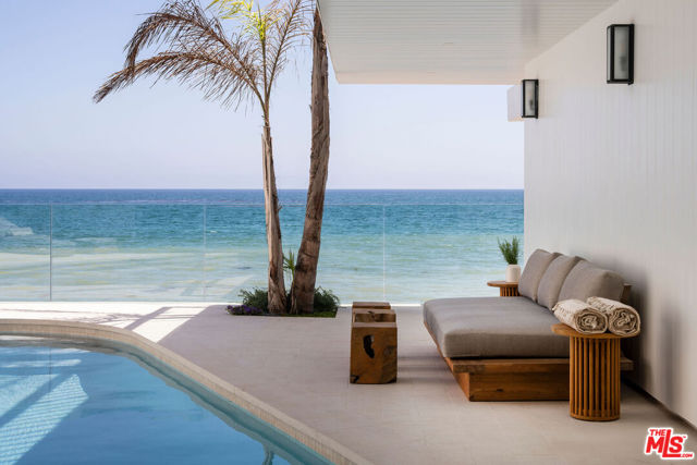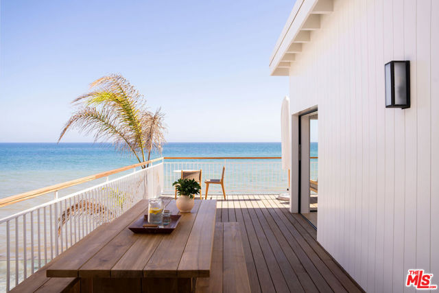 Situated off of PCH on the Private Escondido Beach Road, sits this Mid-Century gem on 50 feet of the exclusive and coveted Escondido Beach. Embrace the opportunity to call this special property home, that has been extensively and meticulously reimagined by design team Warren Garrett. The newly completed home elegantly blends timeless materials with modern amenities and exudes a restrained sophistication. The turnkey beachfront residence offers 4 bedrooms, 4.5 baths, two levels of expansive waterfront decks and features a gorgeous french grey plaster pool that takes center stage only a few steps from the sand. This idyllic beach house is conveniently located steps away from the iconic Geoffrey's restaurant and a leisurely beachside stroll to Paradise Cove Beach Cafe. Located near the end of a private street, the peaceful retreat enjoys ample separation from Pacific Coast Highway. The clean design of the modest exterior facade is centered by an arched solid steel front door opening to panoramic ocean views framed with white oak floors and soaring exposed beam ceilings. An open gourmet kitchen showcases a grand Italian limestone island, exquisite stone shelving, a La Cornue range and new high end appliances. The main level features 3 bedrooms with spa-like en-suite bathrooms, while the lower level offers a 4th bedroom and full bathroom with breathtaking views of the pool and ocean beyond. A secondary bar and kitchen as well as a cozy interior lounge were designed to make this the perfect setting for pool and beachside entertaining. This home is furnished and is move-in ready with brand new furnishings from Jenni Kayne Home, experience the best of coastal living in this unique Malibu beachfront paradise.