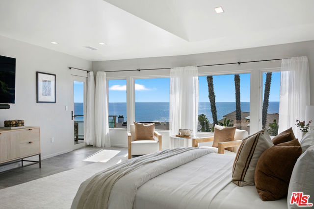 Located behind the gated entrance on Victoria Point Road in Broad Beach, Malibu, this 4-bedroom, 4.5-bath Malibu Home for Sale has been transformed by a recent $3M renovation, offering a refined coastal retreat with unobstructed ocean views throughout. The main level welcomes you with a bright, open living area featuring a custom tiled fireplace and expansive sliders that frame the Pacific. Just off the living room, a wide balcony creates a seamless indoor-outdoor flow. The redesigned kitchen is equipped with SubZero and Wolf appliances, a large walk-in pantry, and direct access to an ocean-view deck, ideal for everyday dining or entertaining. The primary suite is conveniently located on the main floor, complete with multiple private balconies and views stretching across the coastline. On the lower level, three well-sized bedrooms accompany a spacious family room and full laundry room, offering comfortable separation for guests or extended stays. Thoughtful upgrades appear throughout the home, including new bathrooms with Onyx countertops, Dornbracht fixtures, and limestone flooring. Multiple patios and balconies make it easy to enjoy the ocean air and classic Malibu beach home lifestyle. Modern systems enhance both sustainability and comfort, including solar panels, an Enphase backup battery, and a Zehnder air filtration system for consistent air quality. Seller states almost zero electricity bills due to solar and power wall. It was built to be completely eco friendly, and sustainable. All materials used were thoughtfully designed, even the tiles were made from sustainable materials. The garden is organic as well. Landscaped for privacy and set in one of the most desirable coastal enclaves in Malibu Real Estate, the home sits just minutes from local markets, dining, and live events at Trancas, with effortless access to the shoreline below. This Broad Beach Malibu residence offers a turnkey blend of quality, comfort, and coastal living.