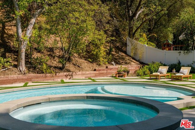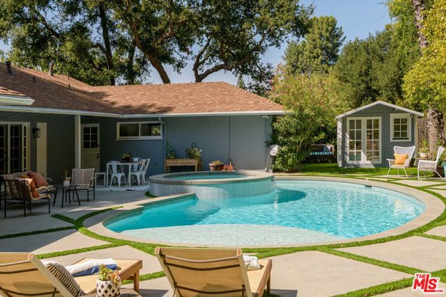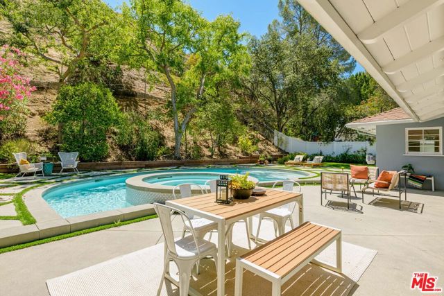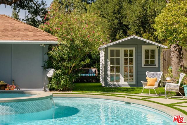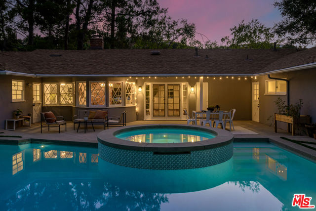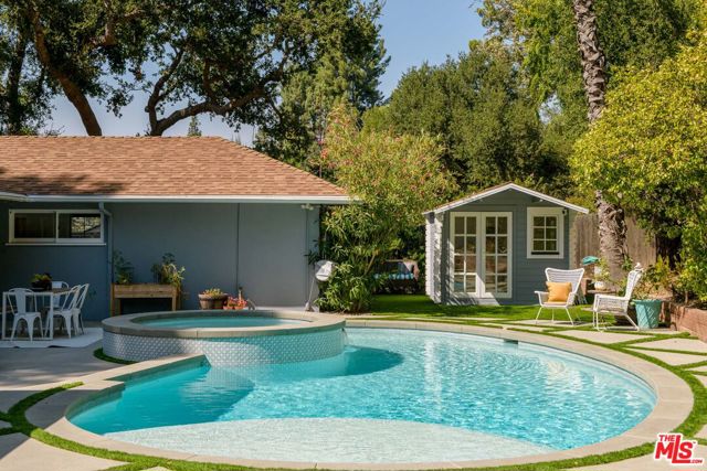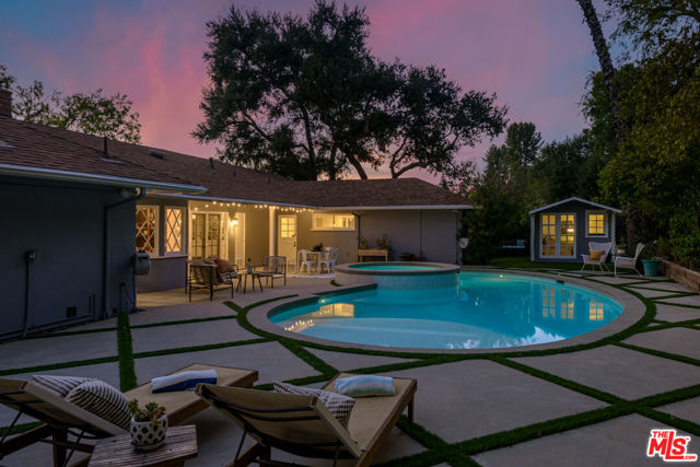 Tucked away up a long driveway, south of Ventura Boulevard sits this immaculate single-story residence on a 20,000+ sq ft lot. Located in the coveted Lanai School District with easy access to the city and the valley, this 3BD + Office home's sophisticated design, high-end upgrades, and unique charm provide the perfect balance of relaxation, style and comfort. The grounds include a detached outside space perfect for a second office or gym and the additional office could easily become a 4th bedroom. Newly renovated with a chef's kitchen featuring Wolf and Kitchen Aid appliances, custom cabinetry, bright living spaces, and a new sparkling spa and pool. Off the primary suite sits a large private side yard perfect for a sitting area or dog run. The spa-like en-suite bathroom offers high-end fixtures, a spacious dual vanity, classic marble touches and a dual head, large shower. Two additional bedrooms provide generous closets, ideal for a family or hobbies. The office/guest room adapts as a home office, guest suite, or studio with treetop views. The backyard, a private paradise centered around an oversized pool and spa, is framed by lush landscaping and multiple areas for dining al fresco. Here you will find the detached space overlooking the beautiful outdoor oasis. The finished epoxy-coated two car garage includes custom cabinetry, insulation and an attic space. Minutes from shops, dining and a top rated school, this home offers quiet seclusion without sacrificing convenience.