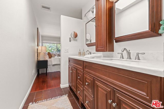 Beautifully Updated townhome with private, direct access 2-car garage in Studio Village, one of Studio City's most sought-after communities. This tri-level townhome feels like a single family home. Standout features include 2 Top Floor Bedroom Suites + Den w/ Closets + 3 Bathrooms + Formal Dining Room + Breakfast Room + 2 Car Direct Access Garage! Both upstairs bedrooms include their own updated en suite bathroom and walk-in closet. Plus, there's a den (easily converted to a 3rd bedroom) with lots of deep storage cabinets/closet along one wall, and a 3rd updated bathroom off the adjoining hallway. Step inside the front door and be wowed by the vaulted living room ceiling, large skylight and clean architectural lines. The spacious living room offers a gas fireplace and sliding doors that lead to an enclosed outdoor patio. The dining room with built-in bar/buffet overlooks the living room, perfect for entertaining a large gathering. The updated eat-in kitchen features Viking range, brand new stainless steel refrigerator, dishwasher & microwave, plus granite countertops and breakfast bar. Also features gorgeous engineered wood floors throughout the home, along with central heat & air conditioning controlled by a Nest thermostat. You'll love the private direct access 2-car garage with laundry area and more storage cabinets. Enjoy indoor-outdoor living with your own private patio off the living room, ideal for BBQs and al fresco dining. The home has just been freshly painted throughout! Studio Village offers onsite management and resort-style amenities, including 6 sparkling pools, 5 spas, 2 tennis courts, and a community clubhouse. The monthly HOA fee covers a lot more, including water, internet, basic cable, exterior maintenance, landscaping, security patrol, and earthquake insurance. All this in a prime Studio City location just two blocks to trendy Ventura Boulevard where you'll find popular restaurants, cafes and shopping, plus top-rated schools (including Carpenter Community Charter School & Colfax Charter Elementary), and easy access to CBS Radford Studio and 101 & 134 freeways. Also, near Tujunga Village, Woodbridge Park, and the Sunday Studio City Farmer's Market! And all the roofs