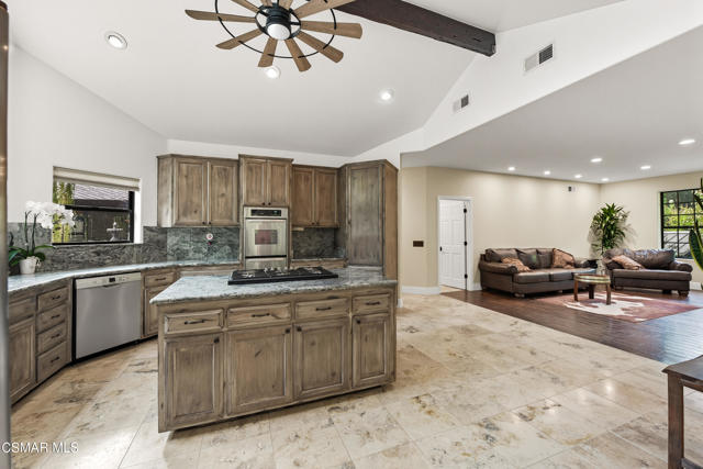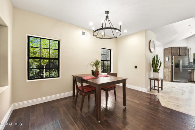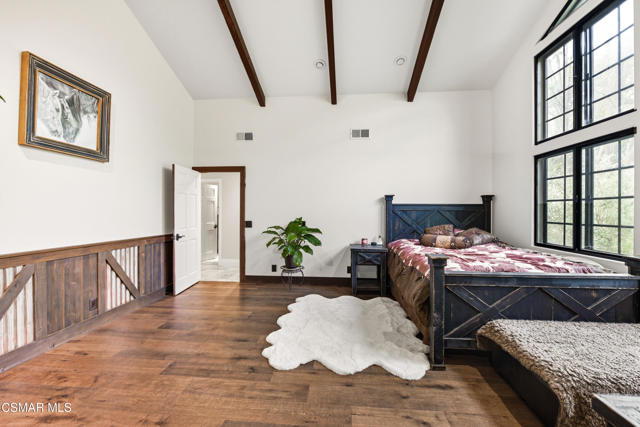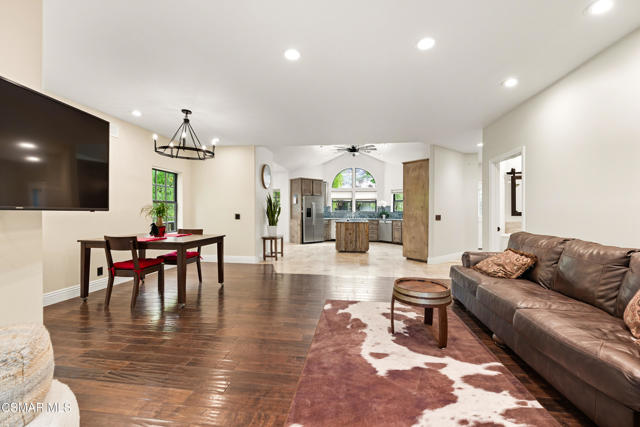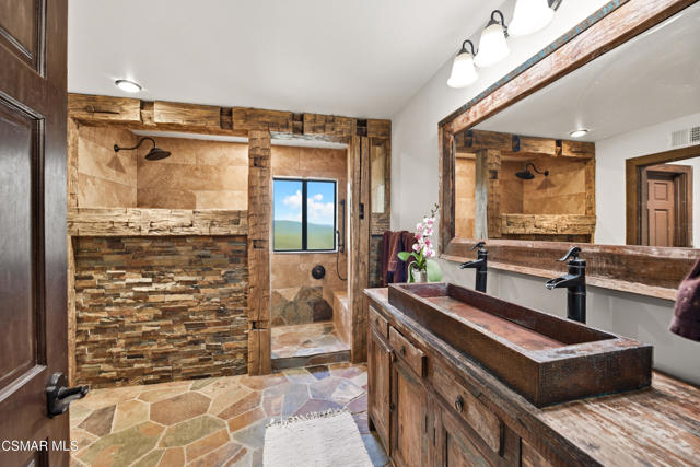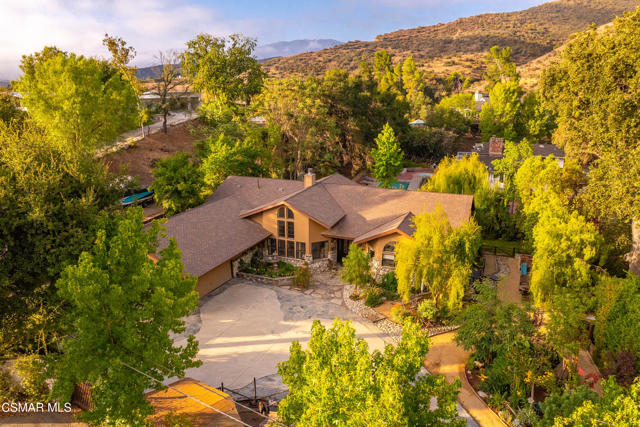 Nestled in Agoura Hills, this custom single-story home offers a rare blend of rustic modern style and serene country living. Set against sweeping views, the property is thoughtfully designed with lush landscaping, privacy, and chicken coops--perfect for those seeking both comfort and connection to nature. Inside, soaring ceilings and a light-filled living room create an open and inviting atmosphere. The kitchen features a central island, stainless steel appliances, and seamless flow for entertaining. The primary suite is a retreat of its own, boasting high ceilings and a spa-like bathroom with striking stack-stone walls and rich wood finishes. Additional baths include a spacious dual-vanity hall bath with a tub/shower combo, convenient full bath off the garage, plus a large half bath for guests. Outdoors, a sprawling pergola sets the stage for dining and entertaining, surrounded by mature landscaping that enhances privacy and beauty. A finished garage adds versatility for storage or creative use. This property is the ideal balance of modern comfort and rustic charm in a sought-after Agoura Hills setting.