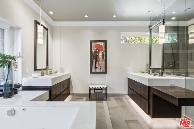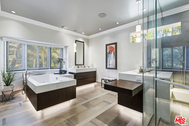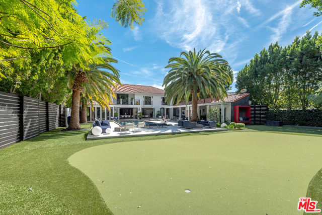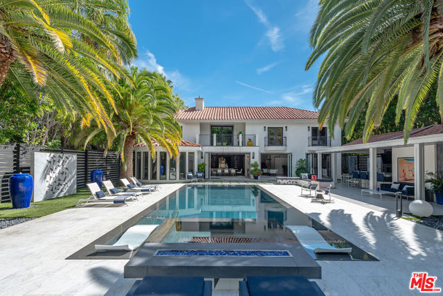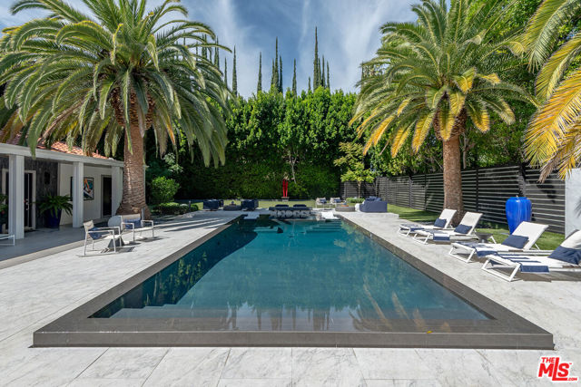 Supremely private Stately gates with imposing 25' high hedges hide a true miracle of a home that serves as the ideal host for fantastic entertainment. State of the art Movie theater. State of the art Golf Simulator with cigar lounge that has humidifier filtration for fresh clean air. Bold designer choices abound - gorgeous on-trend fixtures and dynamic wallpaper coverings. Two downstairs en suite bedrooms, two other upstairs en suite large bedrooms. Another bedroom converted into a complete spa with wet and dry sauna and massage table. The other bedroom adjacent to the Primary suite has been opened to serve as a huge killer office. Upstairs laundry has been added to complement the downstairs laundry off the secondary staircase. This is truly a luxurious floorplan. La Cantina folding doors open to reveal an immaculate backyard that blows you away. Placid infinity pool reflects the subtle exterior lighting with various daybeds and conversation lounges surrounding cozy fire pits. The outdoor kitchen offers a veritable restaurant experience with the pizza oven, fireplace, TV and bar.