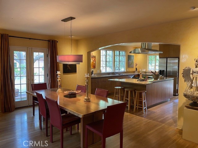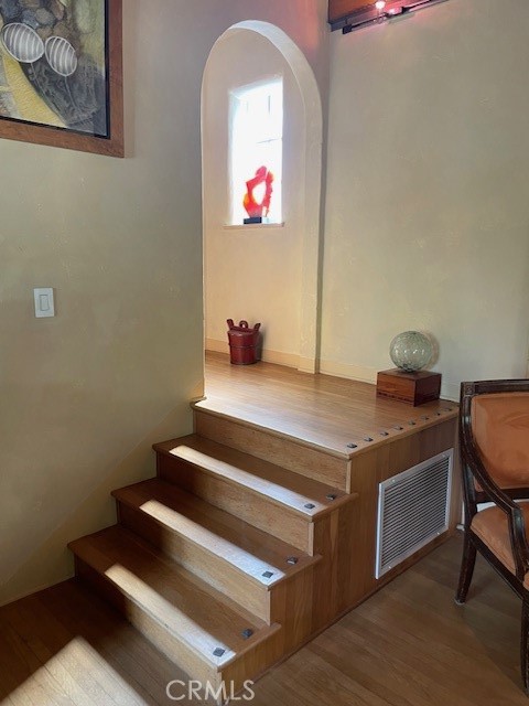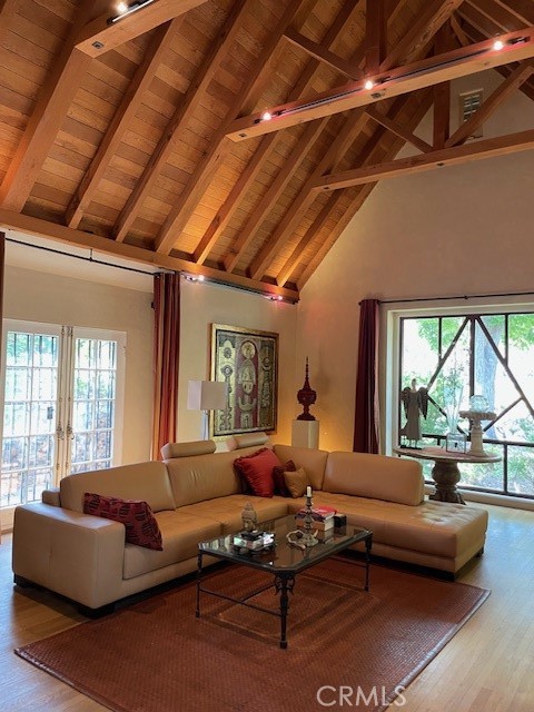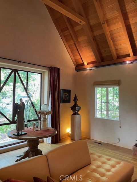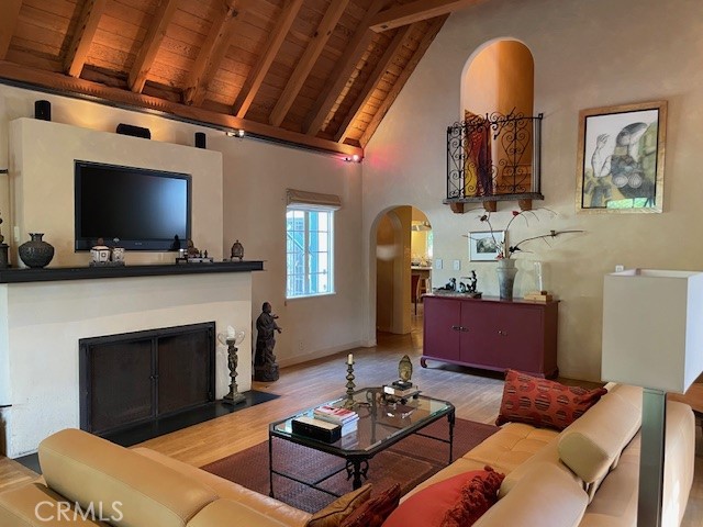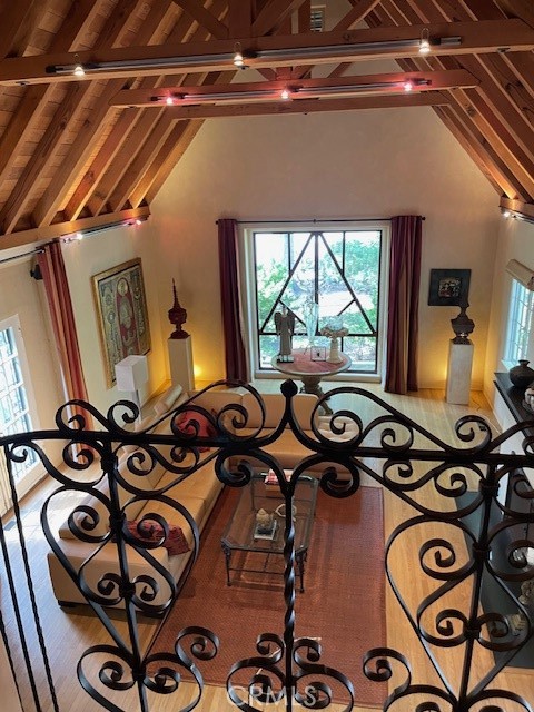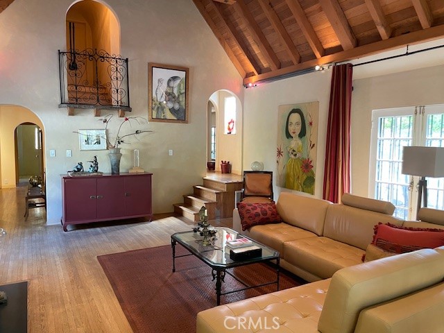 Village English Tudor Estate with Cathedral Ceilings and Guest House above garage. Guest house sq.ft. not included. Stunning outdoor patio, stately fireplace with Juliet balcony. Soring cathedral ceilings as you enter the grand living room with another balcony, French doors and high windows that view to north. Charming dinning room, Den and downstairs bath. French doors lead off of a large chiefs kitchen to a large patio, mature trees and many fruit trees. Oasis settting. Old world iron staircase that leads three additional bedrooms and bath. Master bedroom has high ceiling with balcony. Two car garage and work shop. This is an estate that is rare to find and truly a masterpiece.