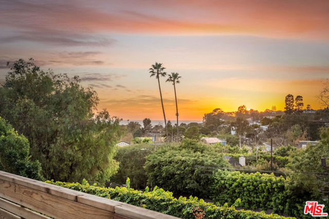 Charming Santa Monica home with stunning ocean and canyon views. This traditional home, nestled on a cul-de-sac, is hidden by lush landscaping in front for privacy. This 3-bedroom, 2-bath home features hardwood flooring, crown mouldings, recessed lighting, two fireplaces, and a great flow for entertaining. An abundace of natural light streams through the numerous windows and skylights. The spacious living room includes a fireplace, and the kitchen opens to the formal dining room and family room. The primary bedroom includes a retreat area with a fireplace and double doors that open to the patio. A studio with its own private entrance is ideal for a home office or guest room. Enjoy the backyard with a solar-heated swimming pool, large entertaining patio, beautiful views, and a terraced lower garden. Short distance to the beach, fine restaurants, Rustic Canyon Park, and Canyon Elementary School.