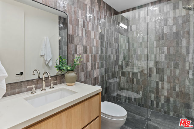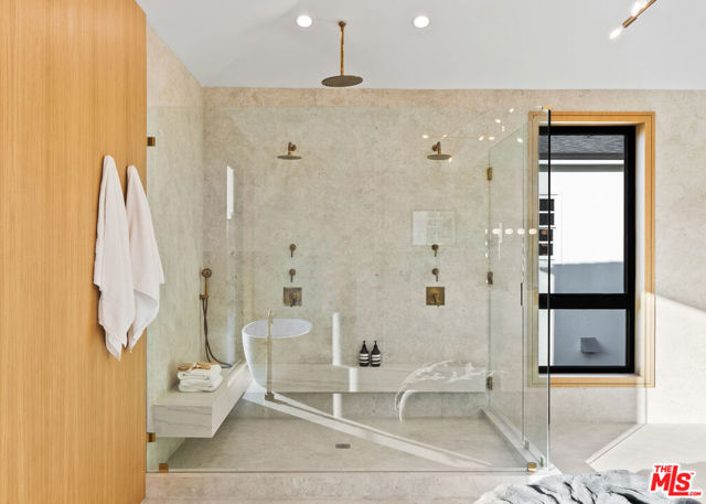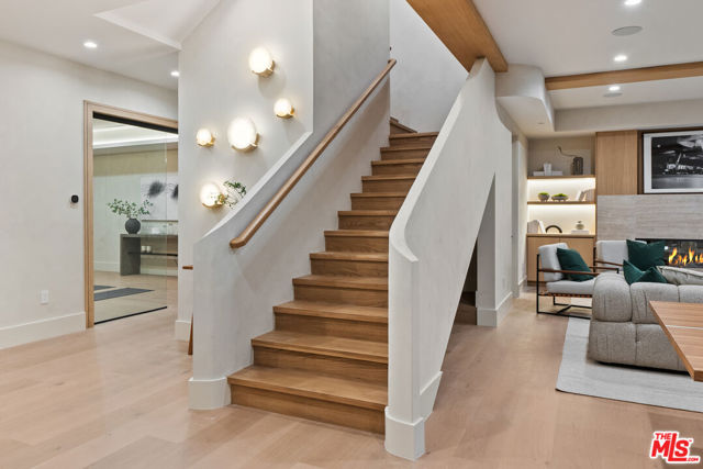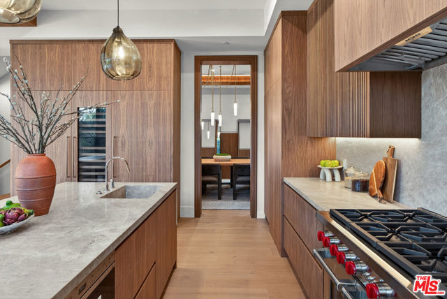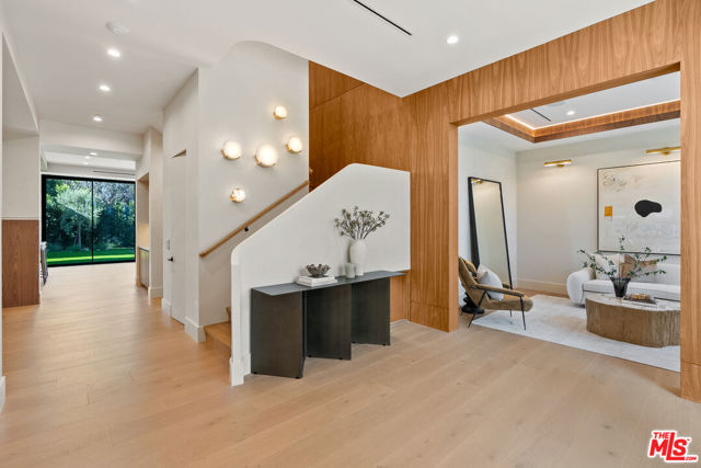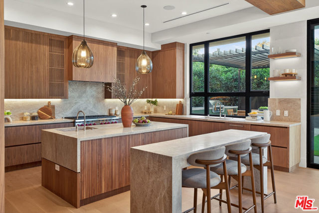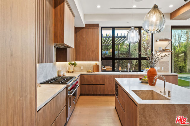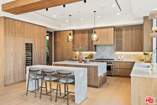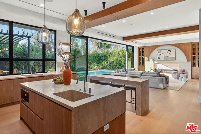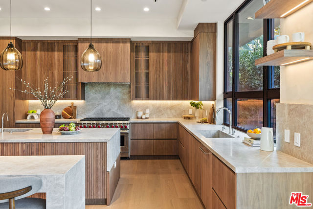 Discover refined coastal living in this newly built architectural estate in the coveted Huntington Palisades. This three-level modern masterpiece offers 7 bedrooms, 9 bathrooms, and over 8,000 sq ft of thoughtfully designed living space, blending timeless materials with cutting-edge convenience. A signature design element is the home's intentional progression of rich walnut and warm oak: bold walnut millwork anchors the main level, while the upper and lower floors transition to softly grained oak, creating a cohesive, elevated aesthetic throughout. Limewash and Roman clay walls, soaring ceilings, and expansive openings set a warm, sophisticated tone from the moment you enter. Custom walnut and white oak cabinetry and paneling, paired with a modern mix of porcelain and glazed ceramic tile, further elevate the home's refined material palette. The custom chef's kitchen is the heart of the home, featuring a Sub-Zero/Wolf gourmet suite of appliances, bespoke cabinetry, an oversized island, and Taj Mahal stone slabs. An extra-large pantry with concealed secondary appliances supports seamless entertaining. The kitchen flows directly into the grand dining area and expansive family room, where a sleek travertine-clad fireplace and oversized sliding doors open to the pool, spa, and outdoor lounge for true indoor/outdoor living. The lower level is designed for entertaining and wellness, showcasing a private movie theater, an Emperador marble clad built-in bar, and a fully equipped gym with steam room. Large sliding doors extend this level to an additional outdoor area, creating a resort-like experience. Plumbing fixtures throughout include selections from Brizo, Watermark, Gessi, Toto, and Mr. Steam, blending function with luxurious craftsmanship. Upstairs, generously scaled bedroom suites provide comfort and privacy, each with curated finishes and luxurious bathrooms. The serene primary retreat offers a spa-like bath and custom wardrobe, completing the sense of everyday escape. Additional amenities include an elevator serving all three levels, a 3-car garage, and smart-home integrations. The grounds are anchored by an extraordinary 150-year-old heritage tree, a rare natural centerpiece that adds history and character to this modern residence. A rare opportunity to own a meticulously crafted new-construction home in one of Pacific Palisades' most desirable neighborhoods, designed for both grand entertaining and effortless everyday living. Available for lease. Contact listing broker for more details.