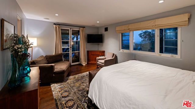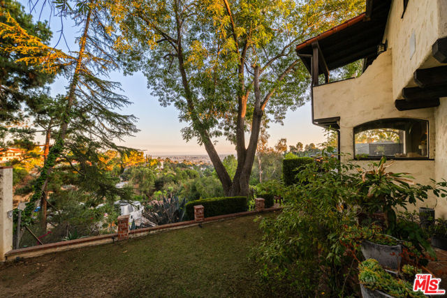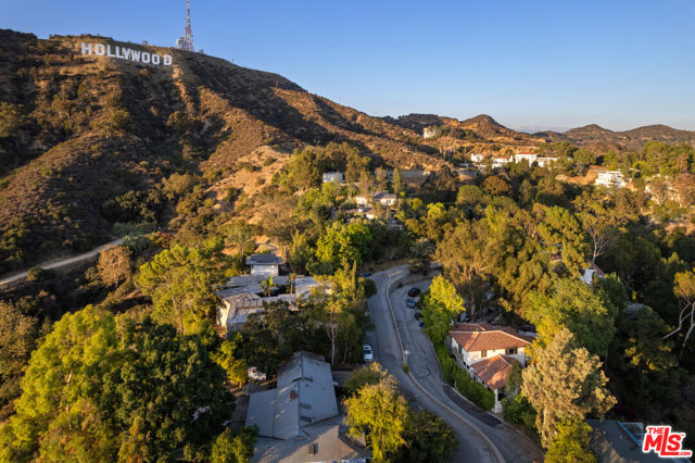 Perched directly beneath the world-famous Hollywood Sign, this romantic Spanish Revival residence captures the magic of Old Hollywood with breathtaking views that sweep across the canyons, city skyline, and ocean beyond. Tucked along Mulholland Highway, the home blends timeless architectural character with inviting spaces for modern living. Behind its gated entry, you'll find a storybook setting with arched doorways, textured plaster walls, beamed ceilings, wrought-iron details, and a warm wood-burning fireplace anchoring the living room. The formal dining room offers panoramic views framed by arched windows and a cozy sitting nook, while the chef's kitchen complete with Wolf range, farmhouse sink, stone counters, and custom cabinetry seamlessly connects to dining and outdoor entertaining areas, complete with a bedroom and en-suite bath. Upstairs, the primary suite opens to a private balcony where sunrise and sunset views stretch across Los Angeles. Additional bedrooms and versatile bonus spaces provide flexibility for creative living, including a bedroom or home office with a cinematic Hollywood Sign backdrop. Bathrooms showcase vintage tile work and period finishes that honor the home's heritage. The exterior unfolds as a private hillside retreat: an expansive deck, multiple patios, and terraced gardens framed by mature trees and lush plantings. Evenings are especially enchanting, with city lights glittering in the distance and the home's Spanish architecture glowing against the hillside. Just minutes from Beachwood Market, Beachwood Cafe, and the trails of Griffith Park, this property offers both seclusion and convenience. Additionally, experience plenty of nightlife nearby at the iconic Hollywood Bowl, with easy access to Franklin Village, Warner Bros, and Universal Studios. This unique offering provides timeless Hollywood appeal in one of Los Angeles' most renowned settings.